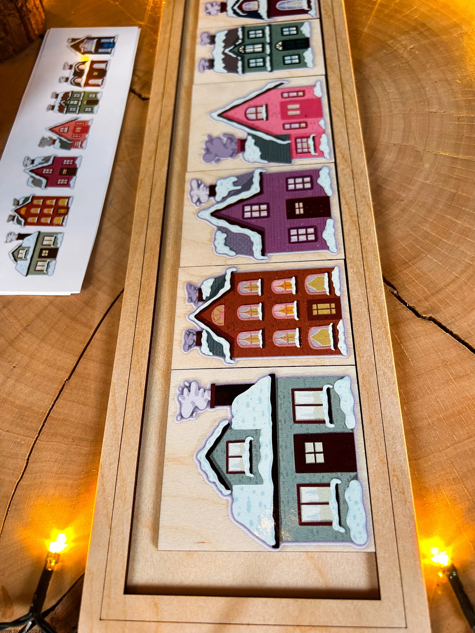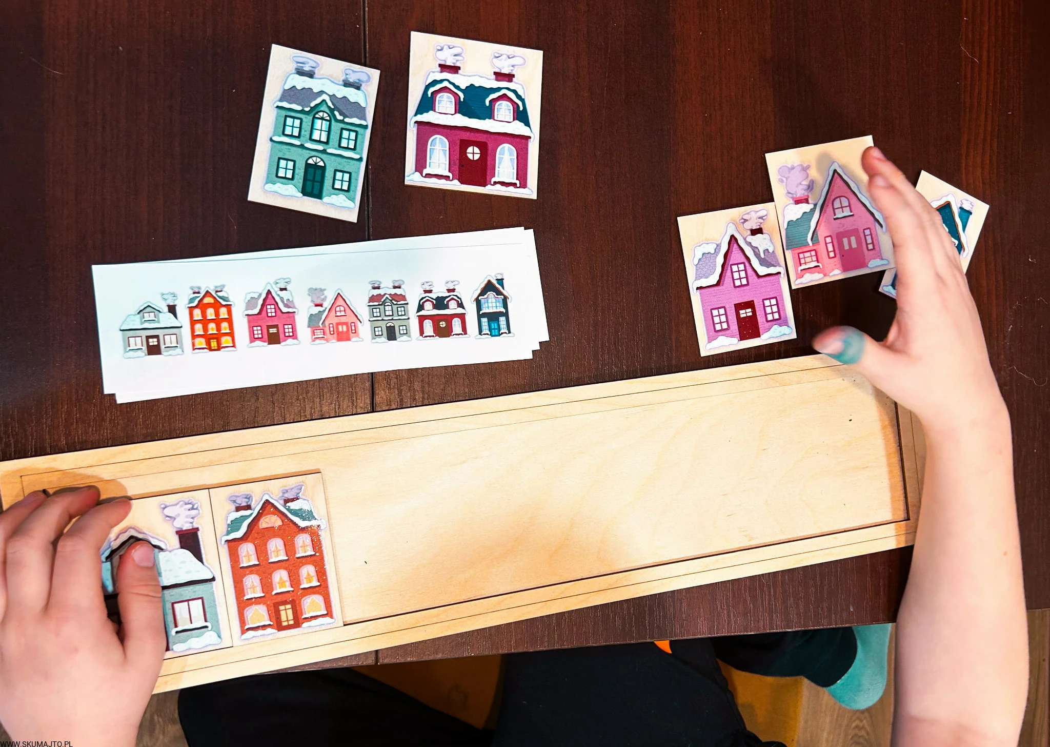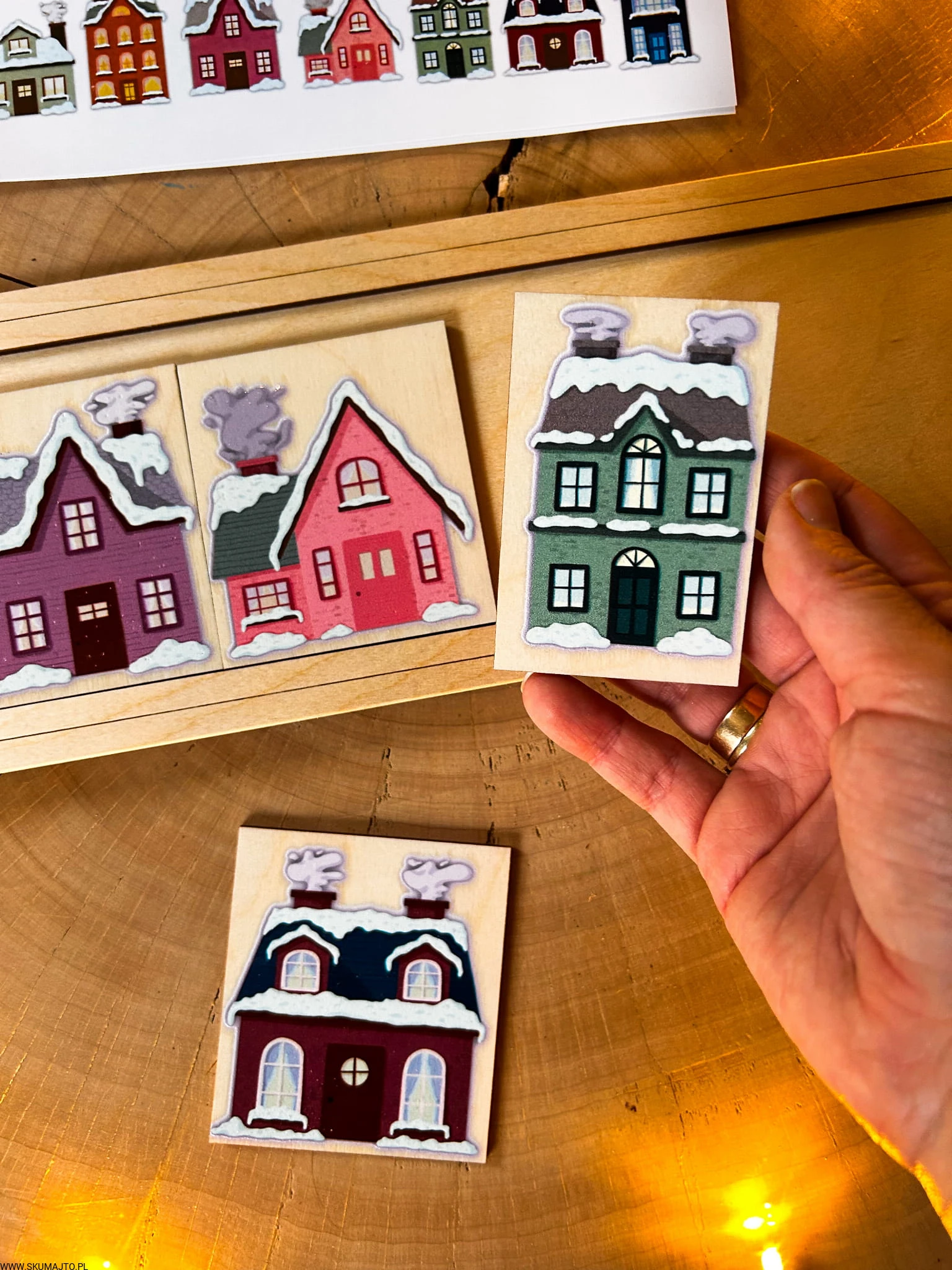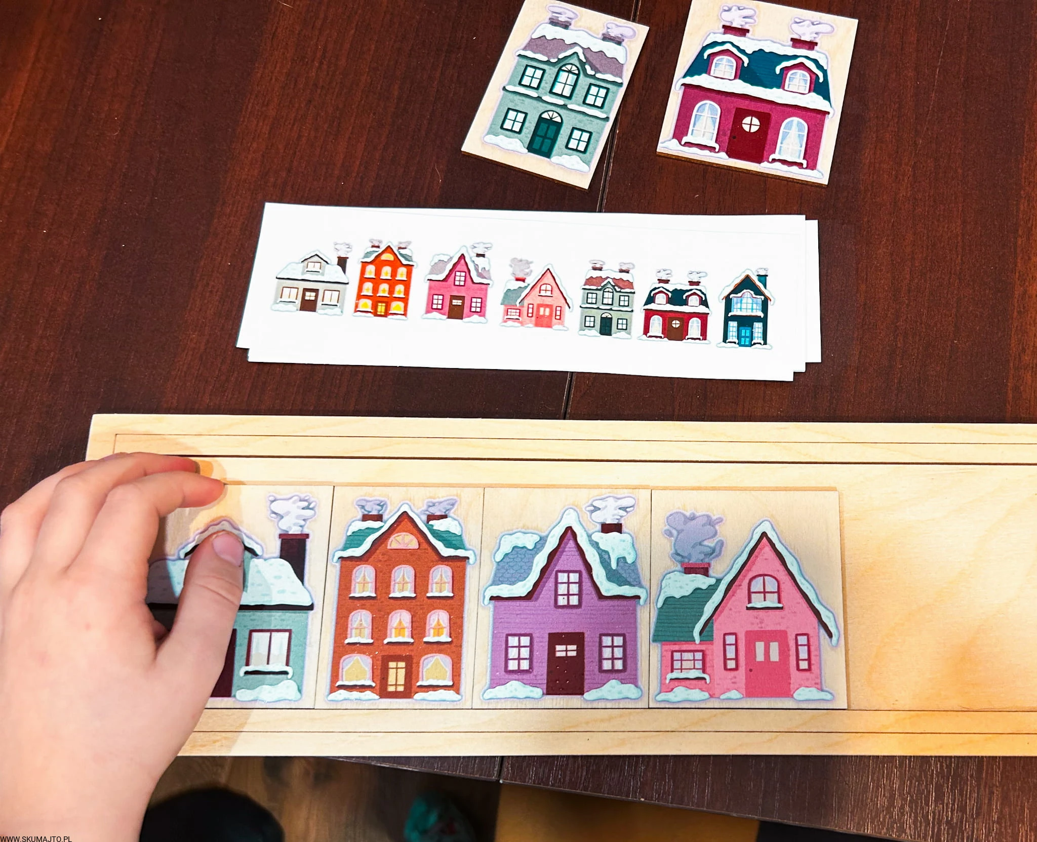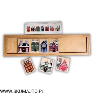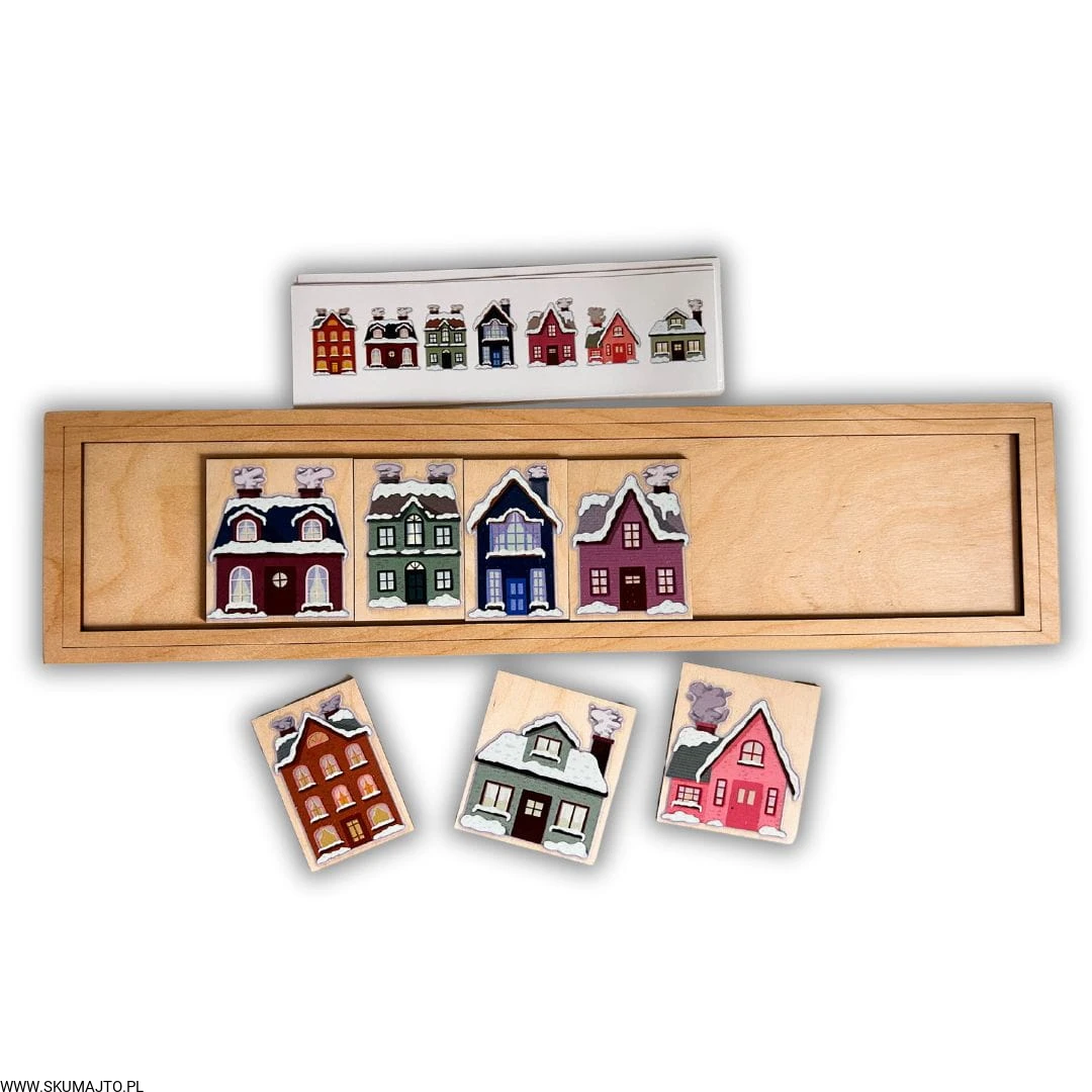 Zimowe domki, drewniana układanka do odwzorowywania