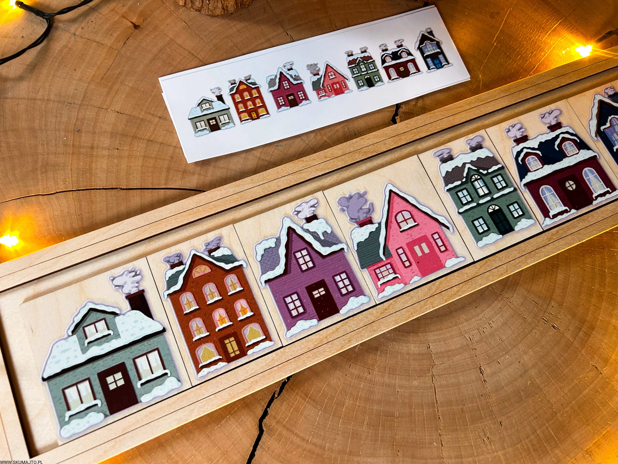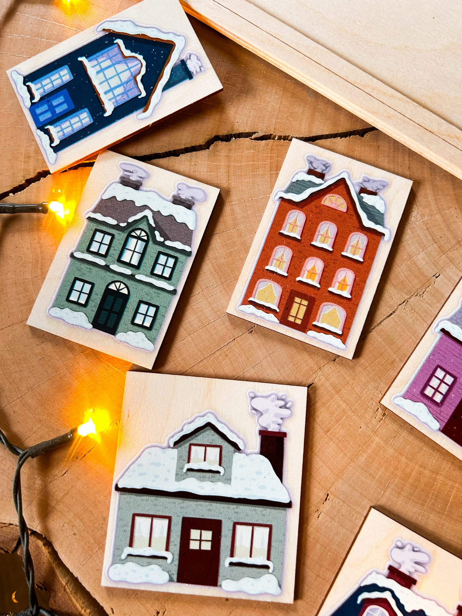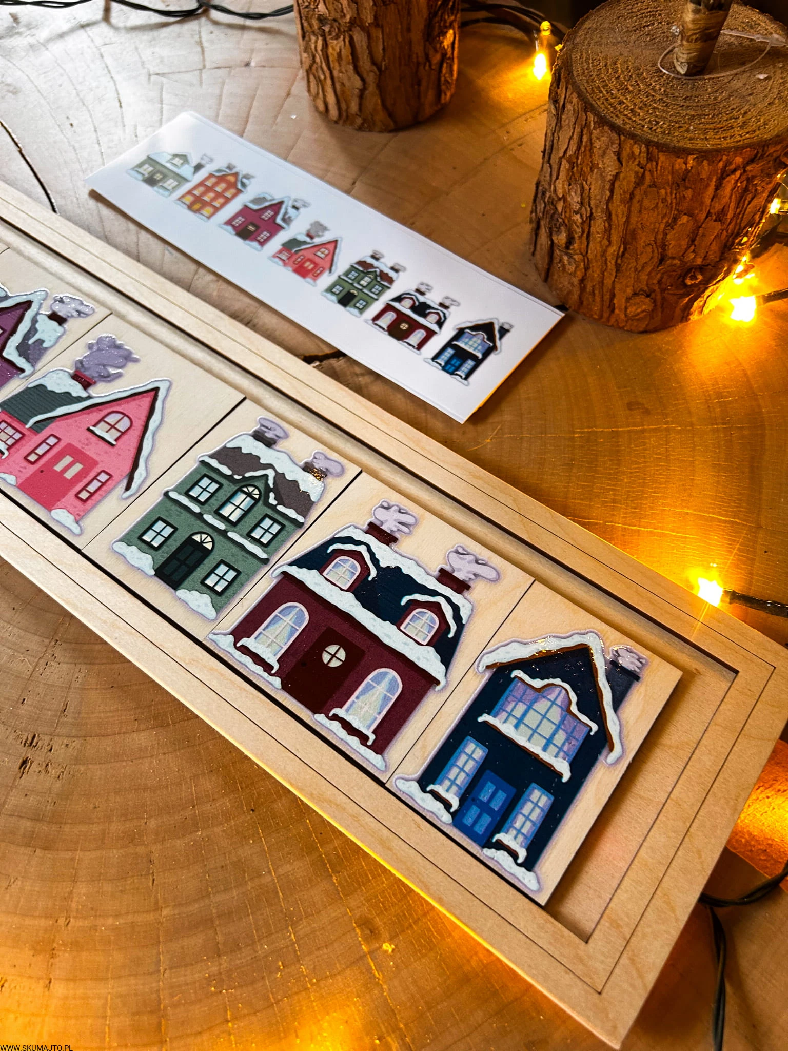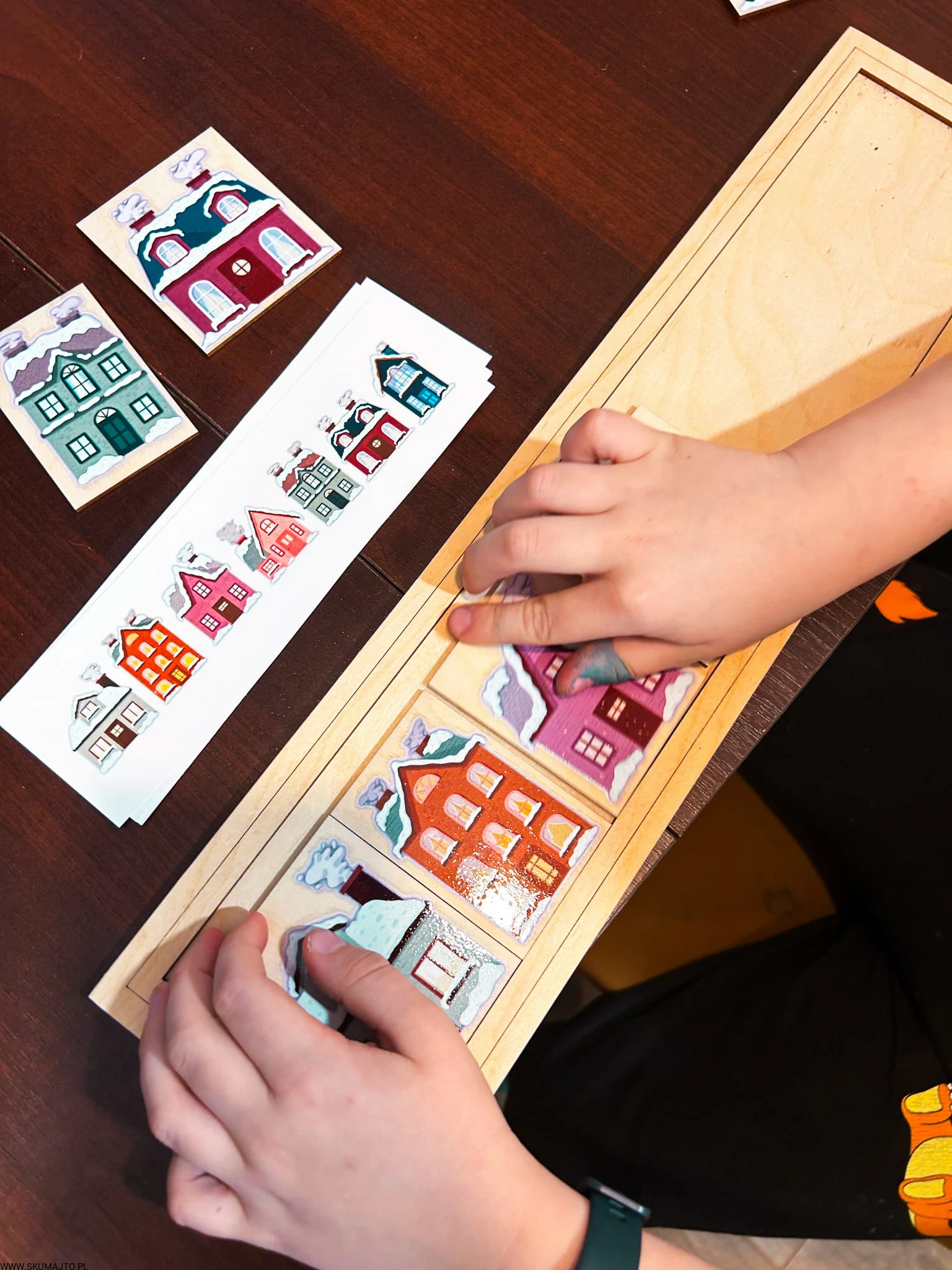 Zimowe domki, drewniana układanka do odwzorowywania