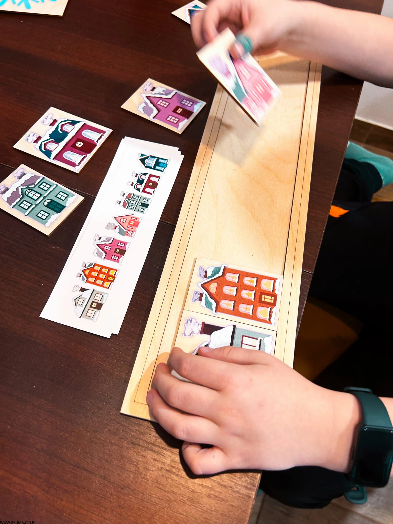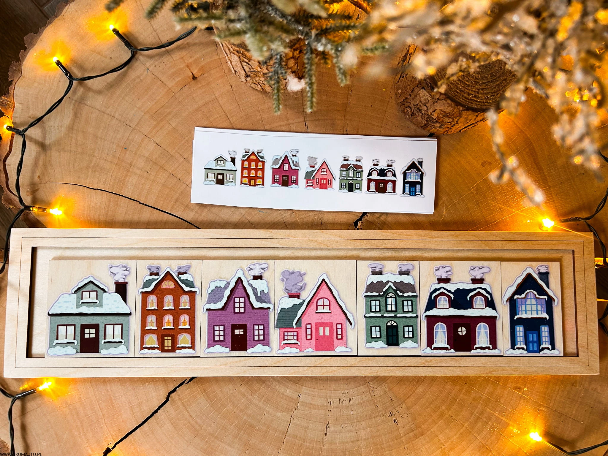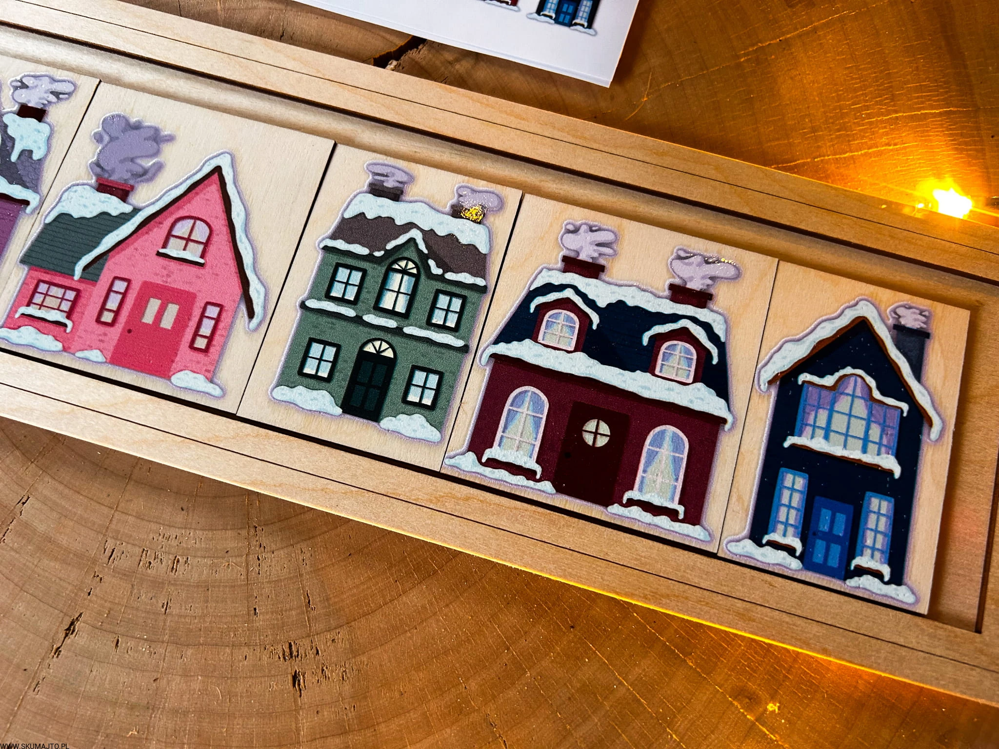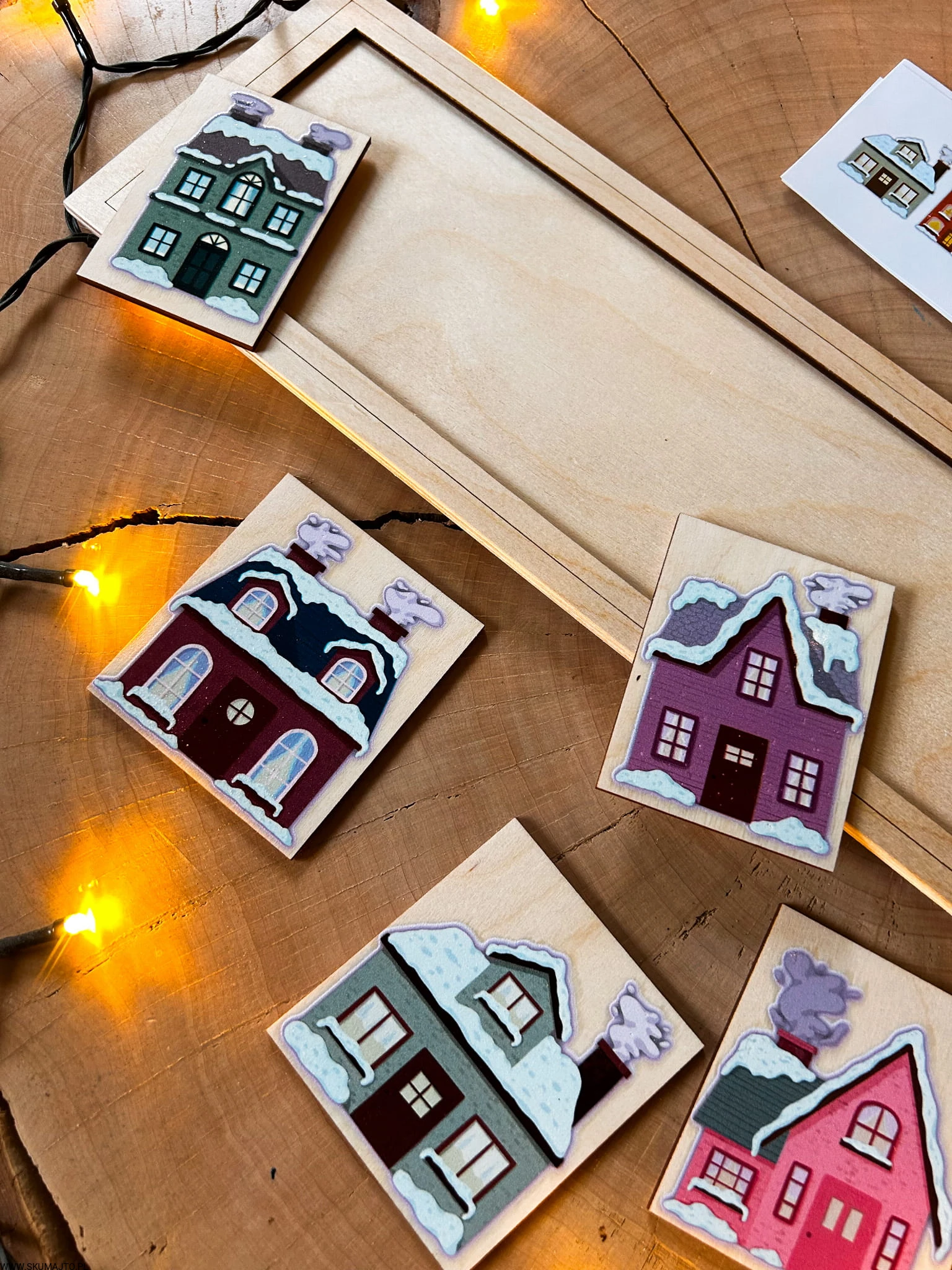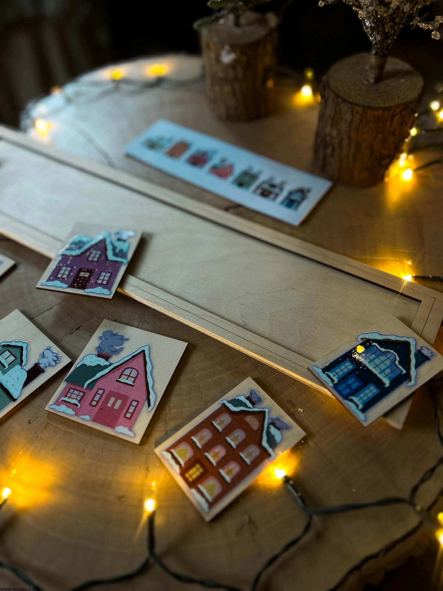 Zimowe domki, drewniana układanka do odwzorowywania