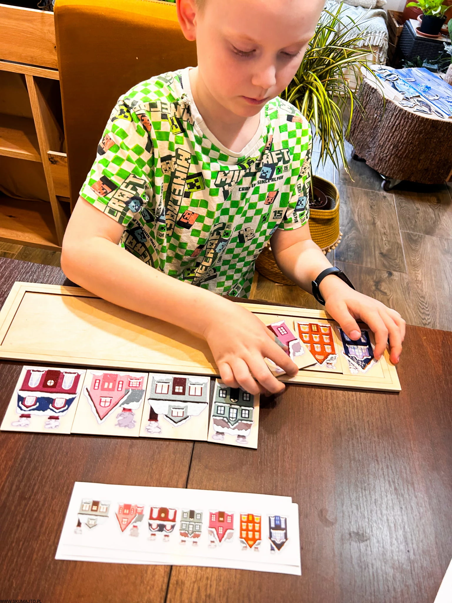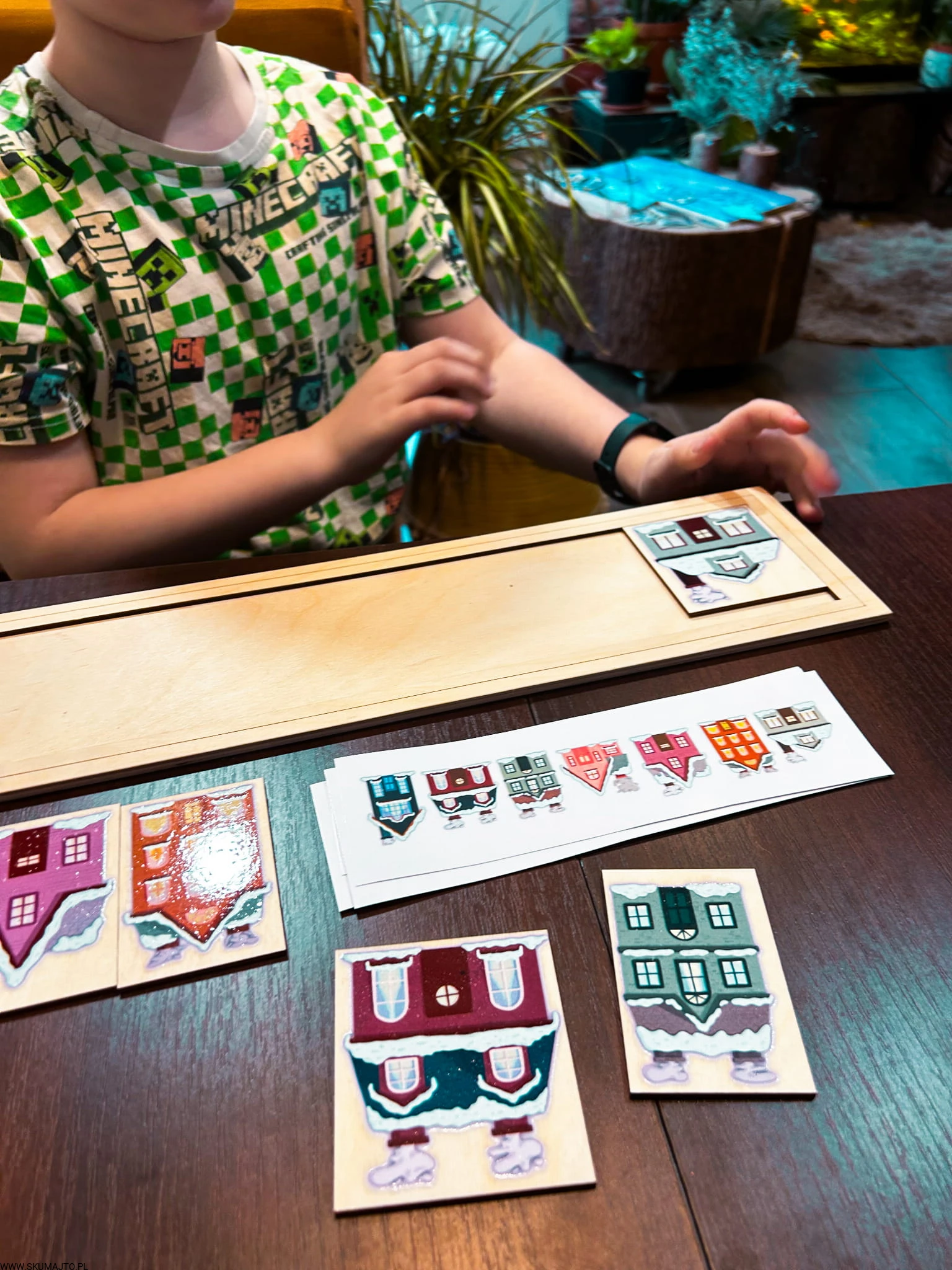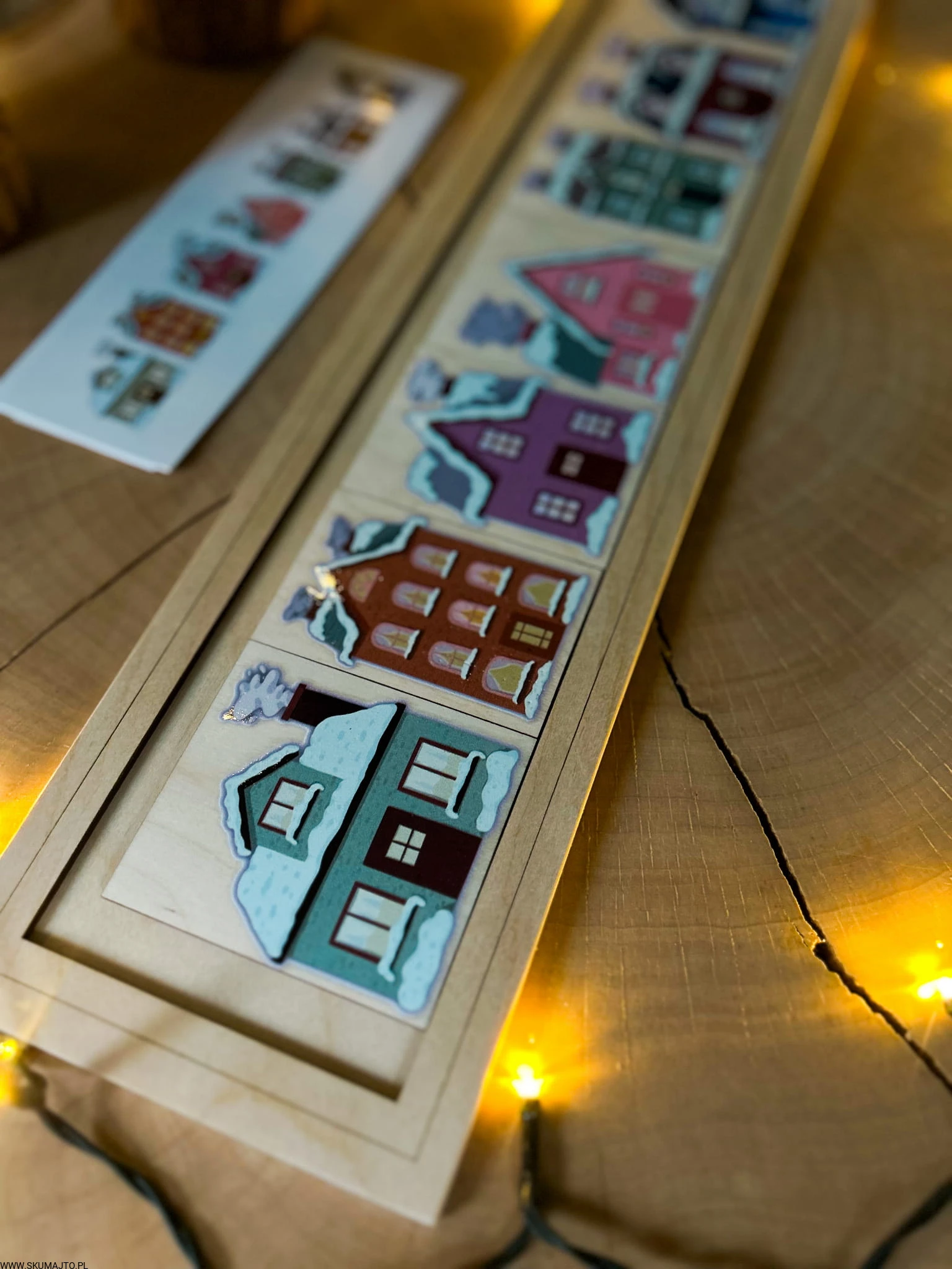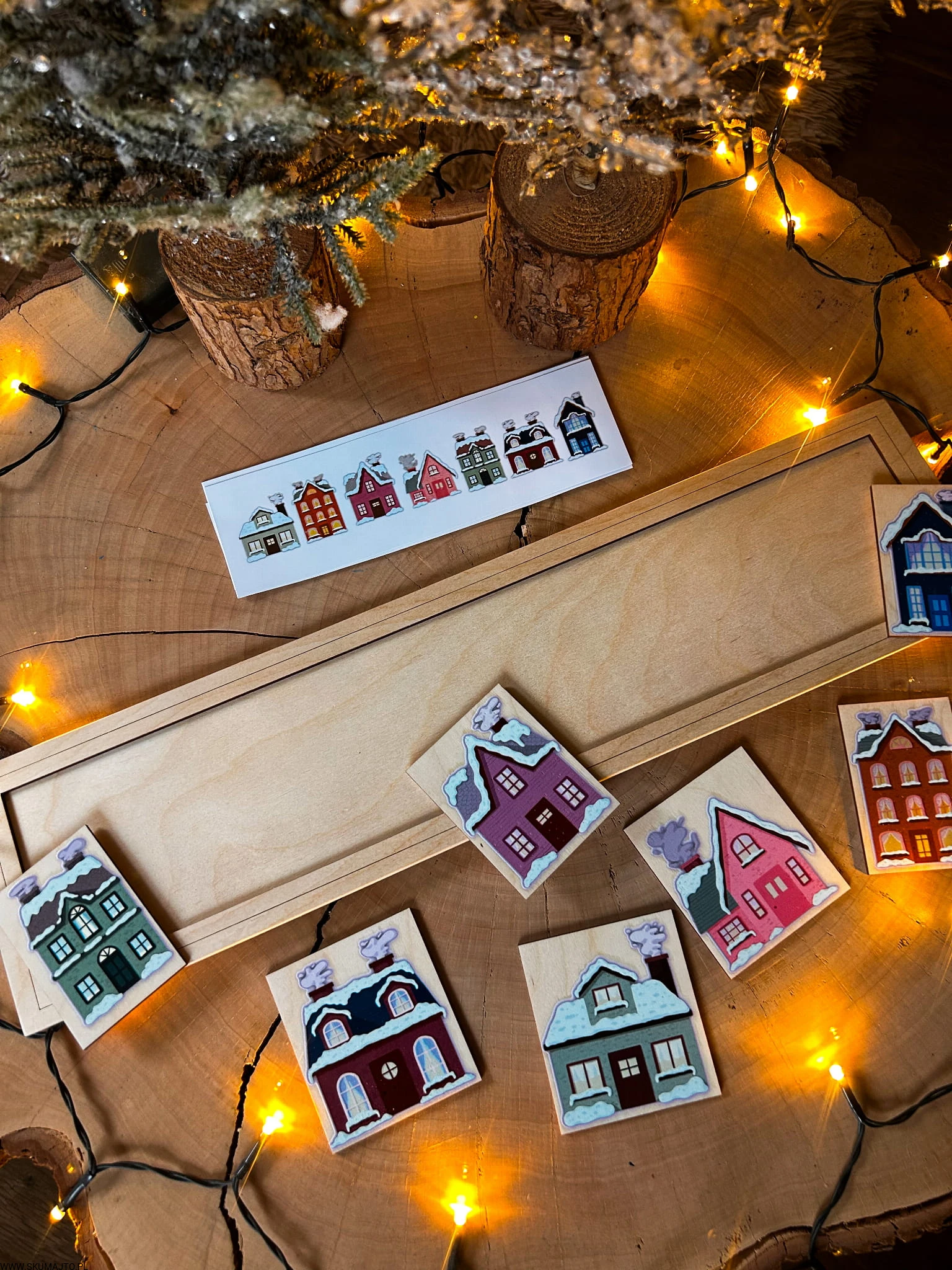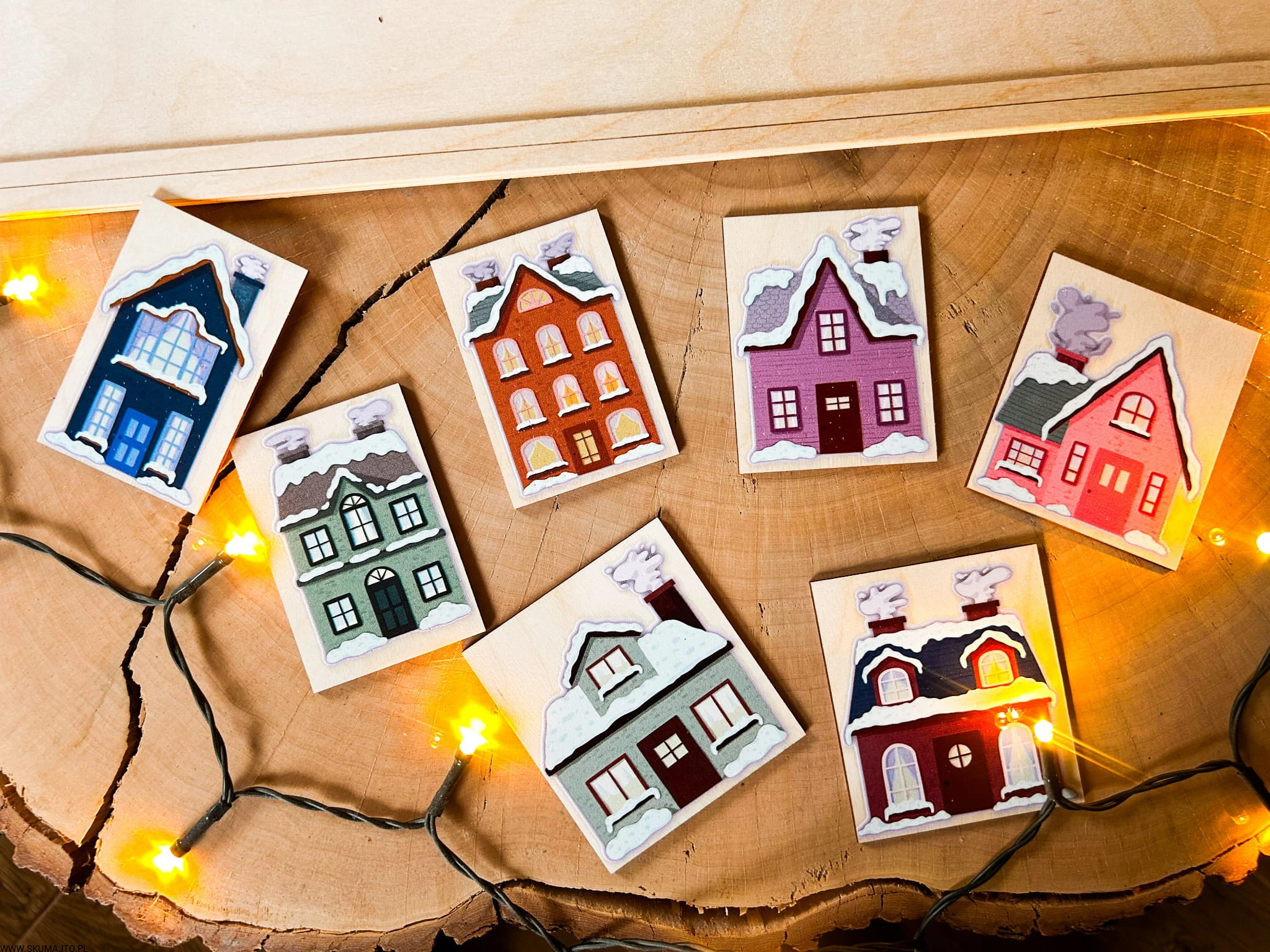 Zimowe domki, drewniana układanka do odwzorowywania
