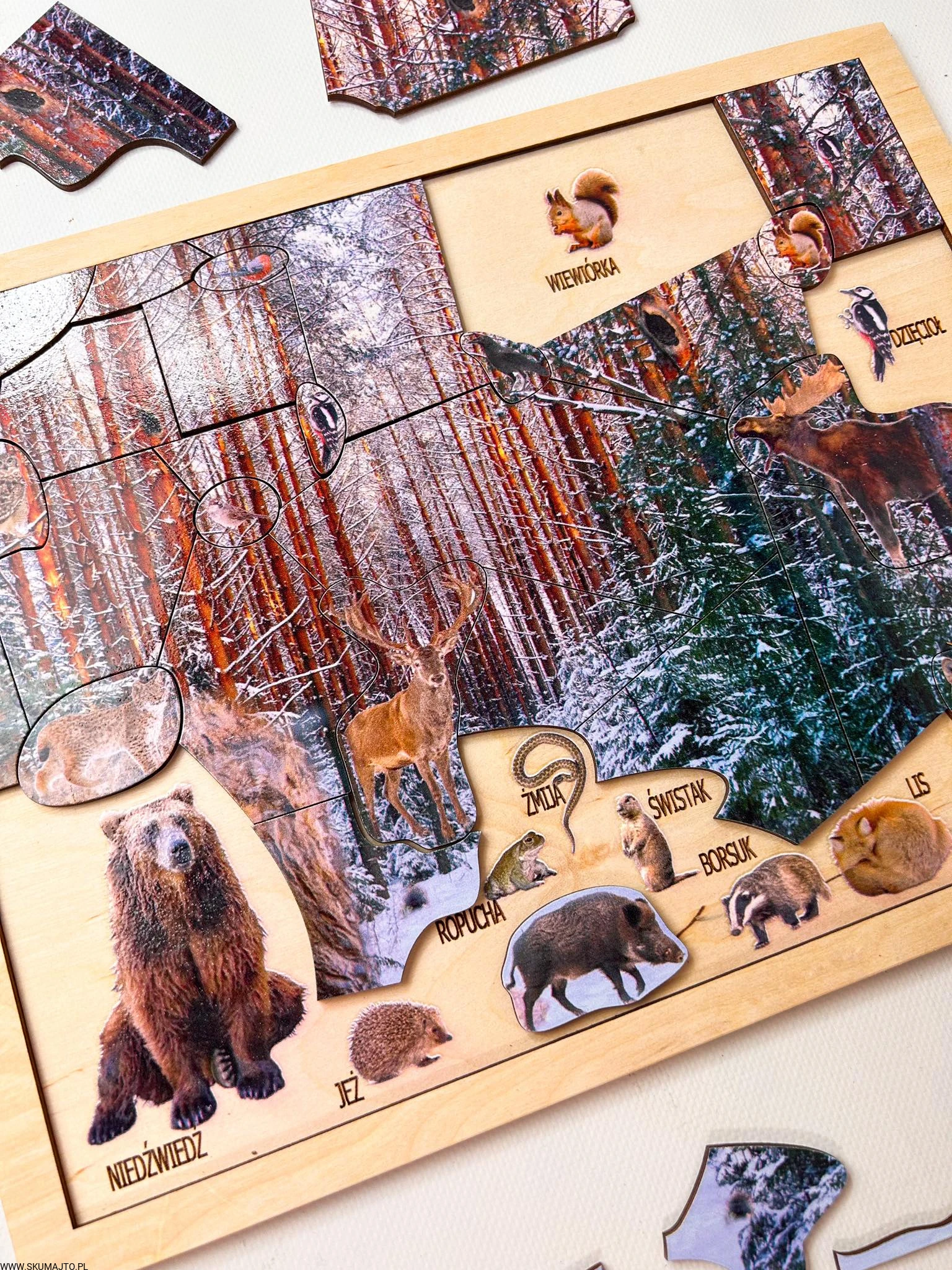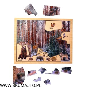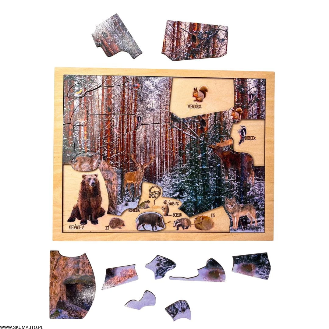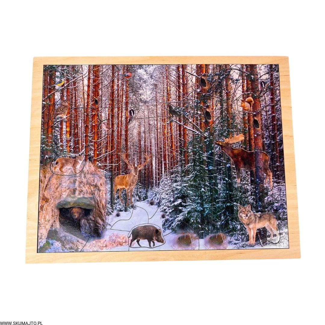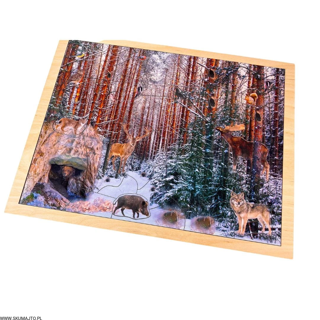 Zimowy las, drewniana układanka o leśnych zwierzętach, las zimą