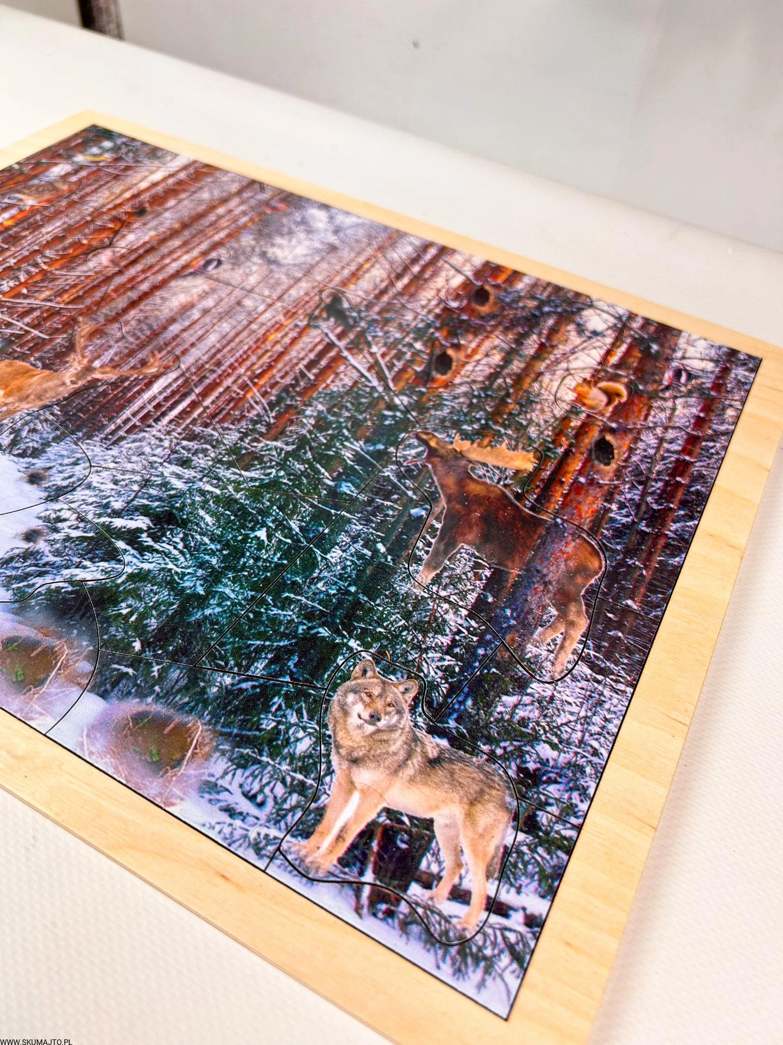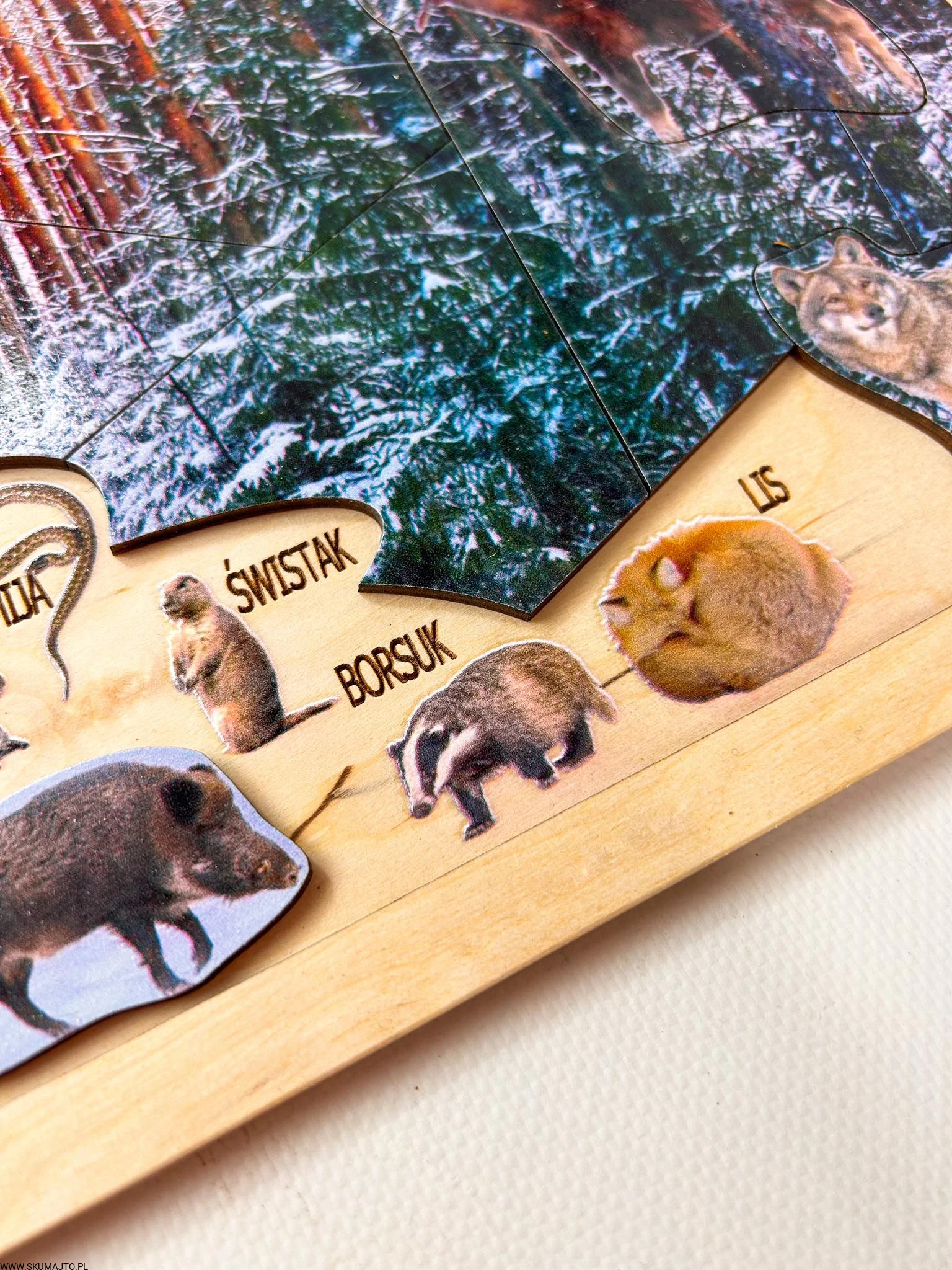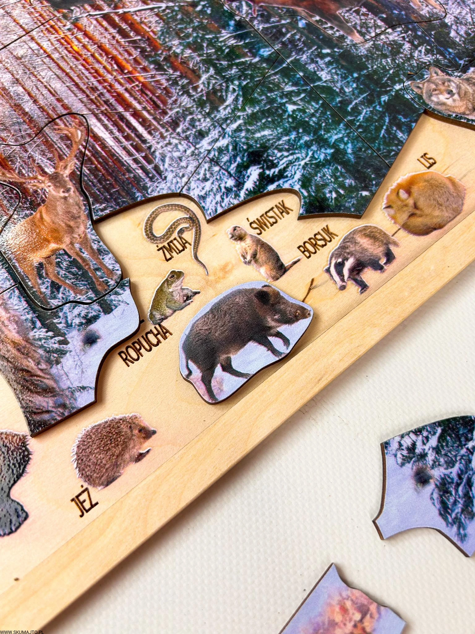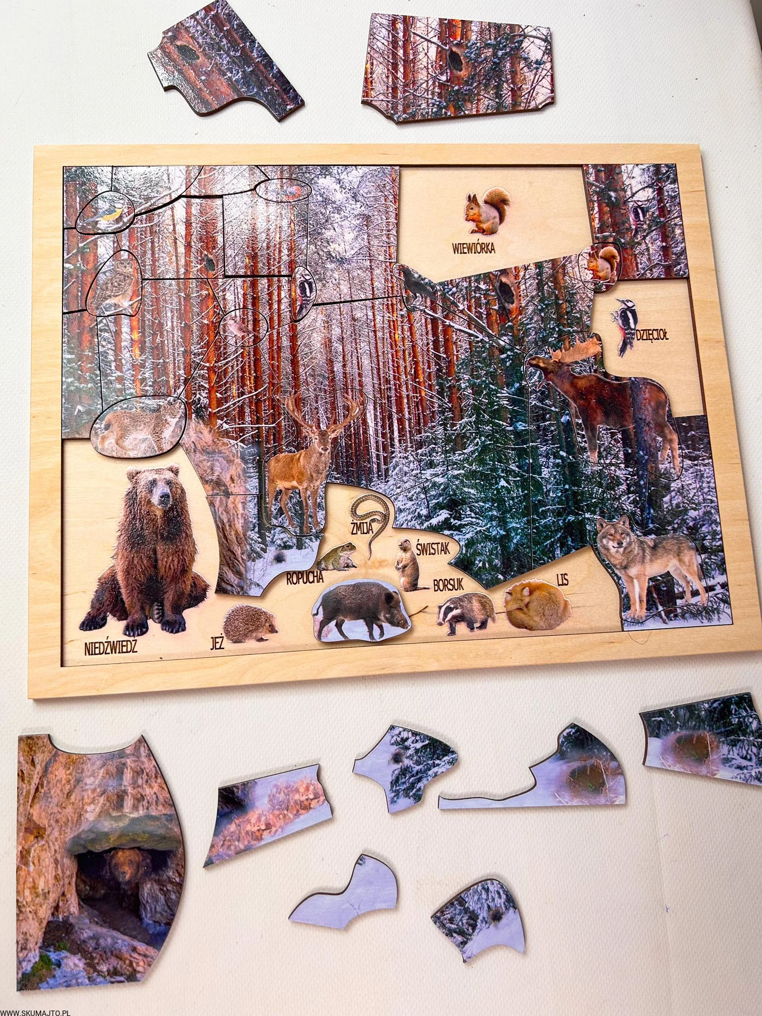 Zimowy las, drewniana układanka o leśnych zwierzętach, las zimą