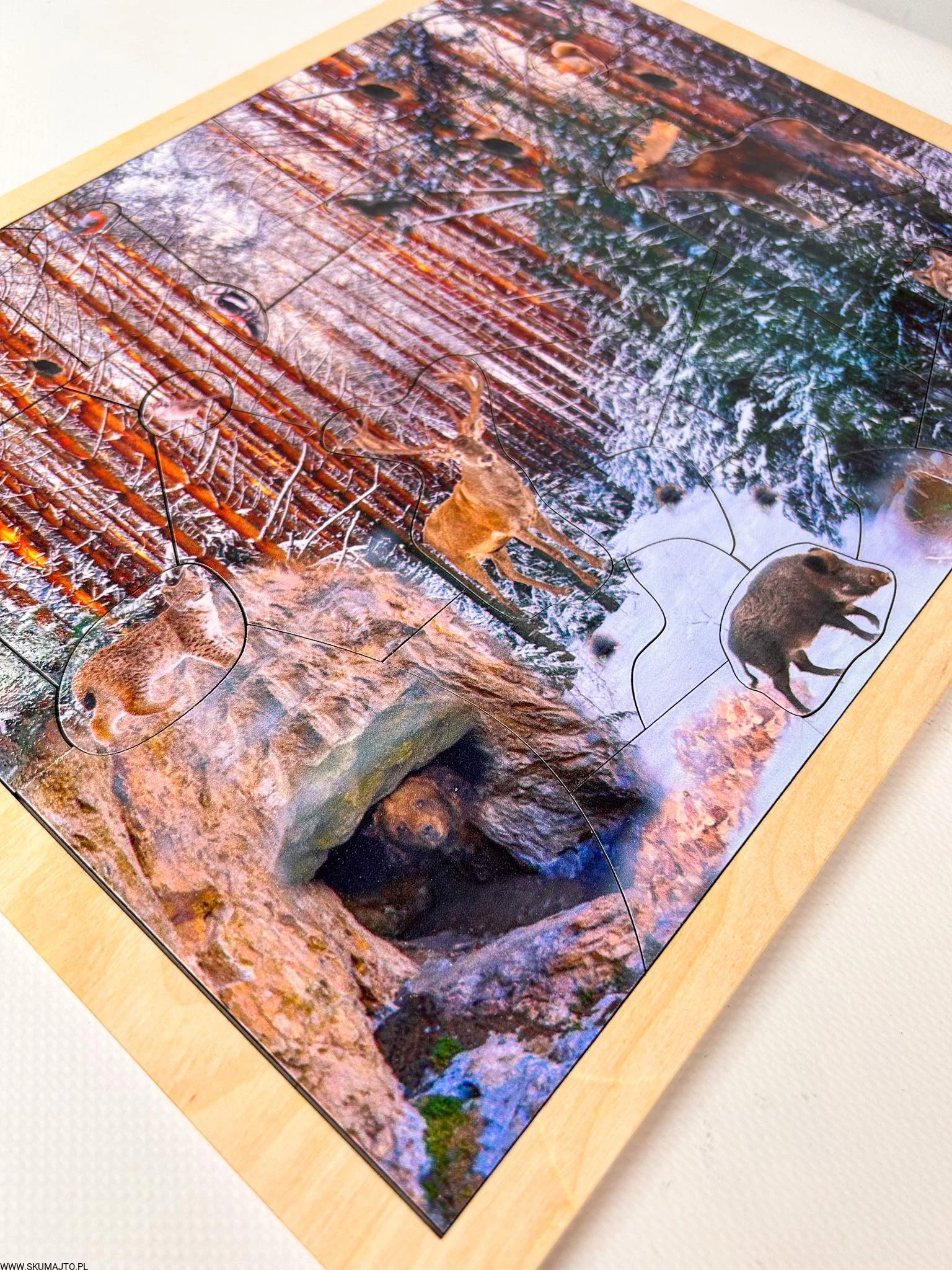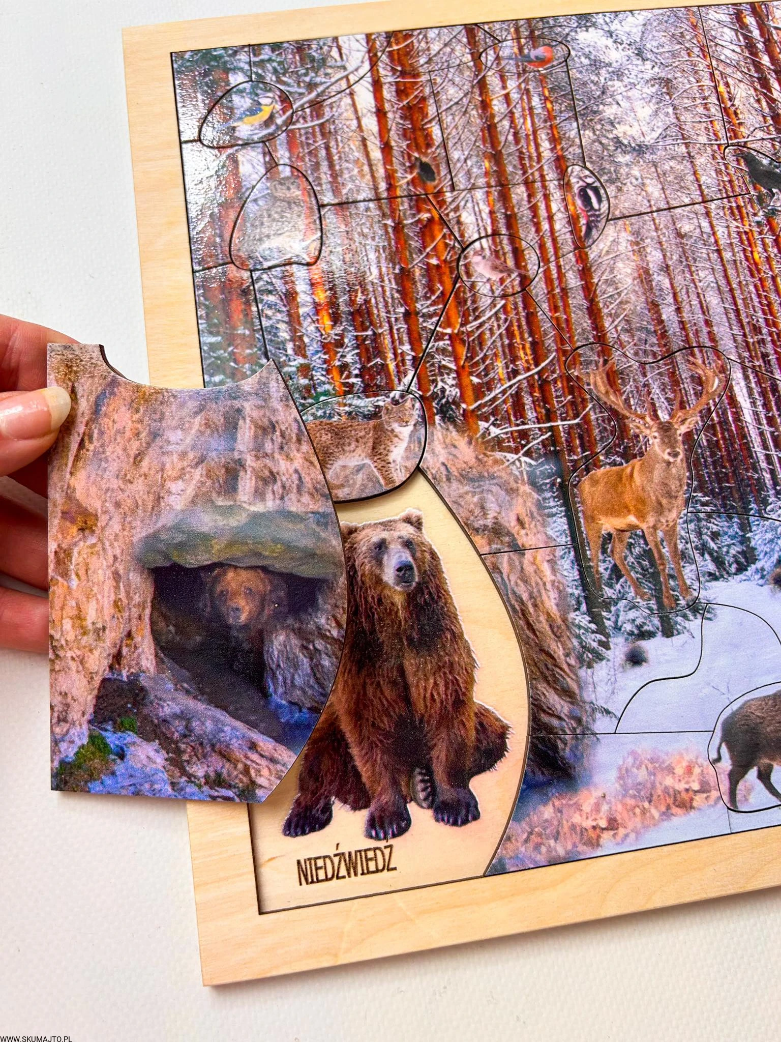 Układanka przedstawia zimowy las, w którym pod stertą liści można znaleźć jeża, a w wielkiej gawrze śpi spokojnie niedźwiedź. Każdy odsłonięty element ukazuje ukryte zwierzę, co czyni zabawę interaktywną i edukacyjną.