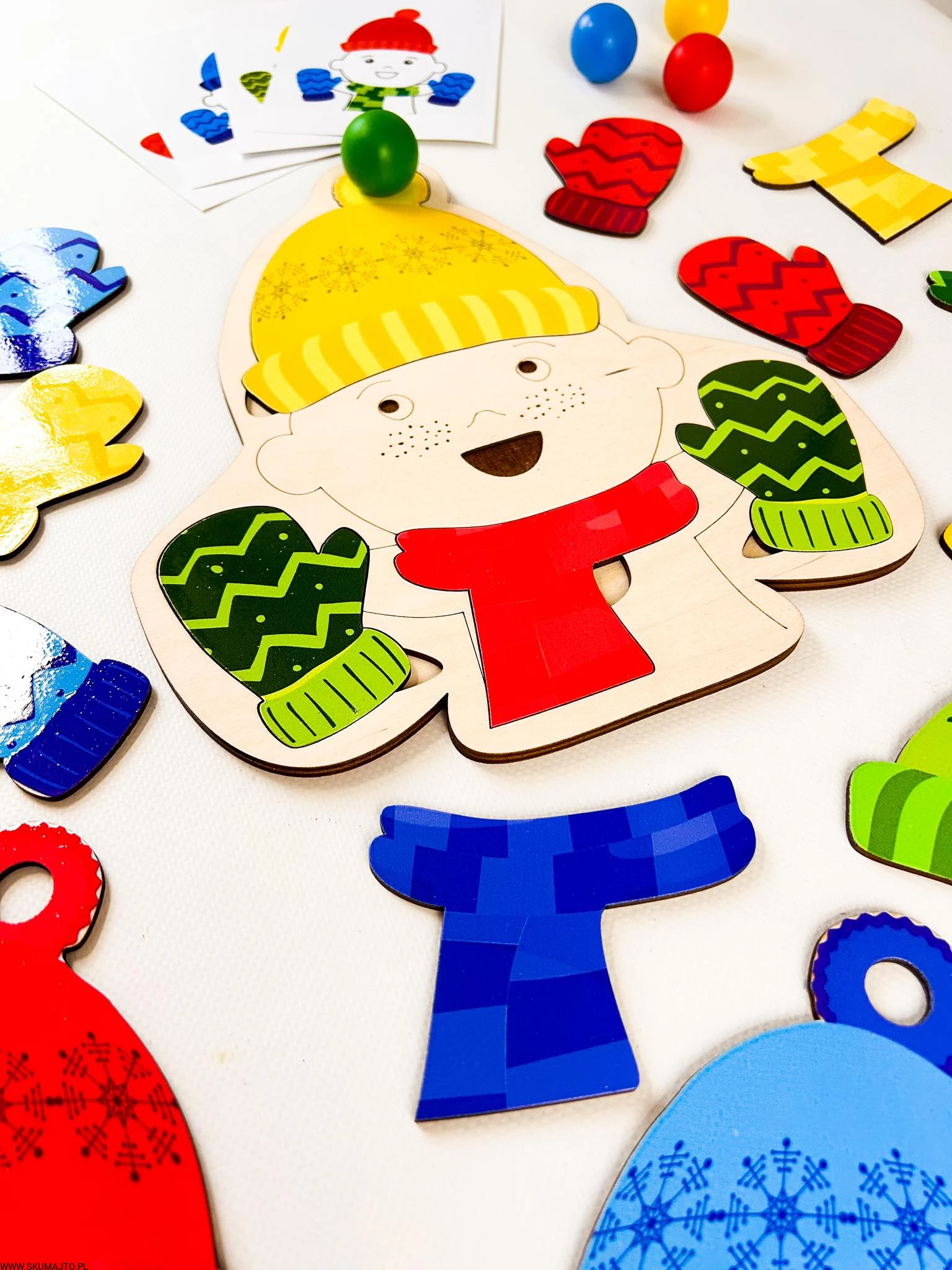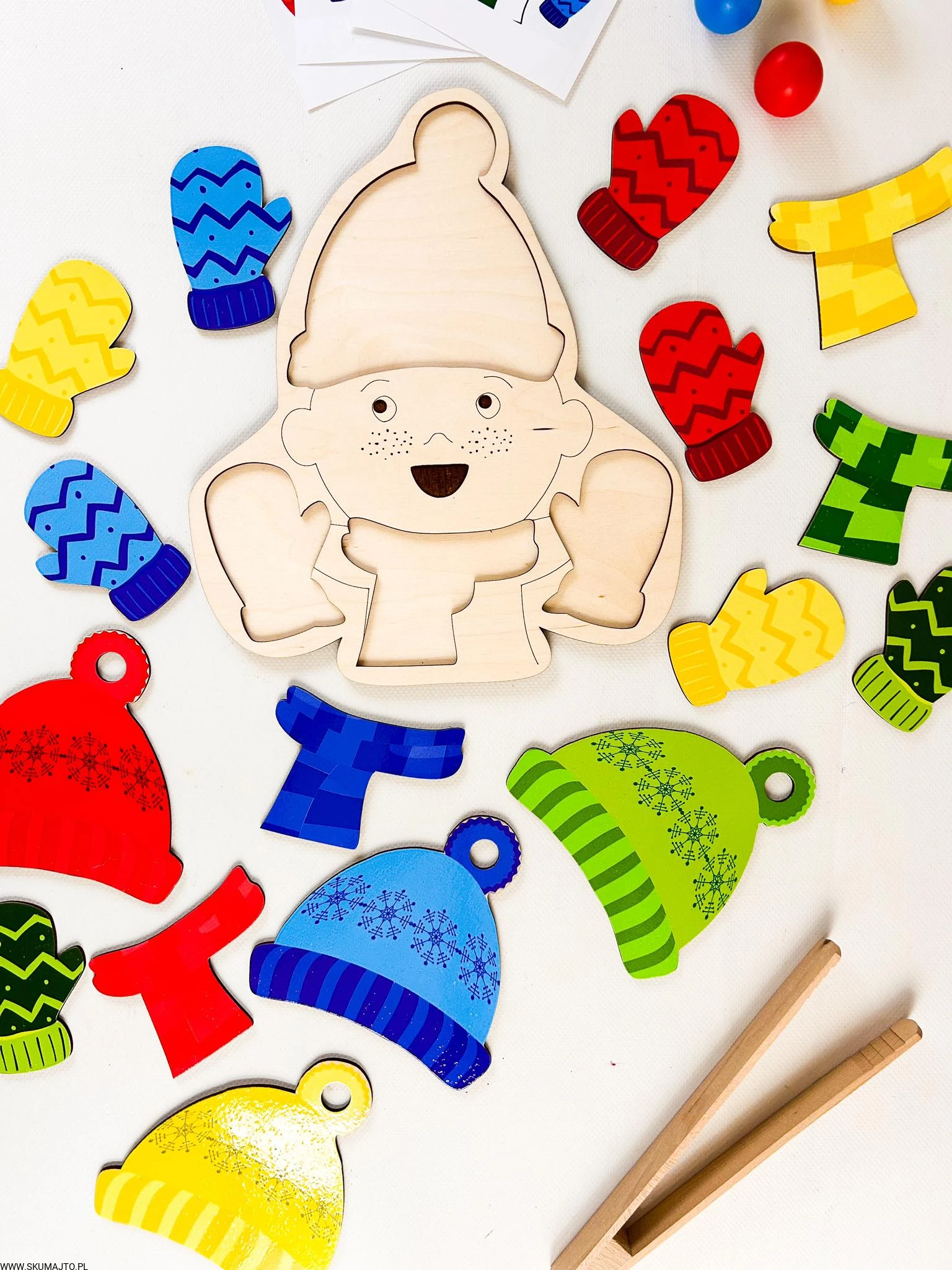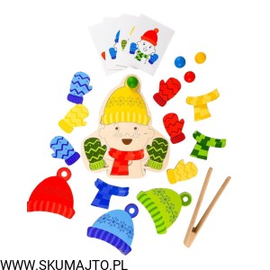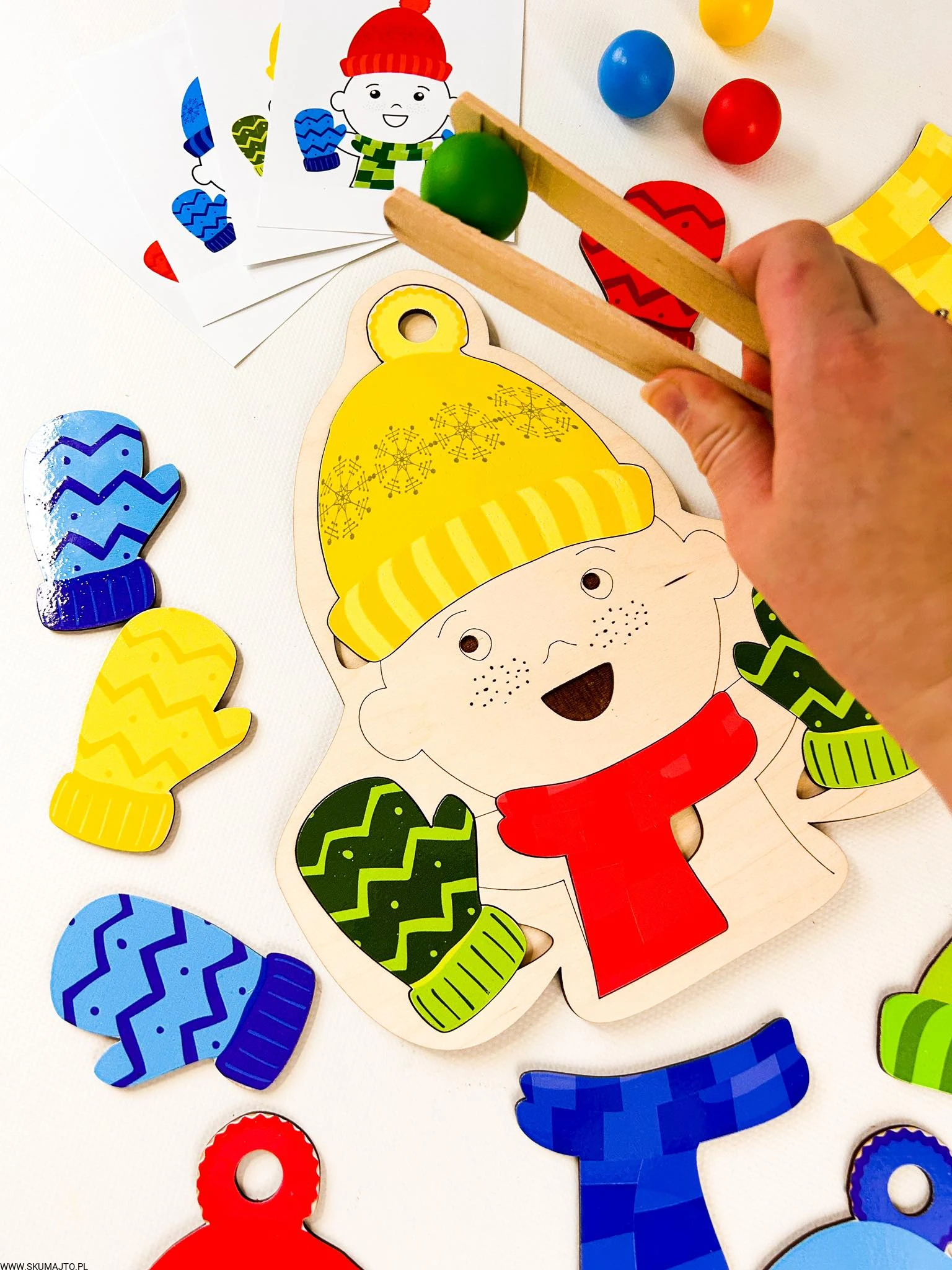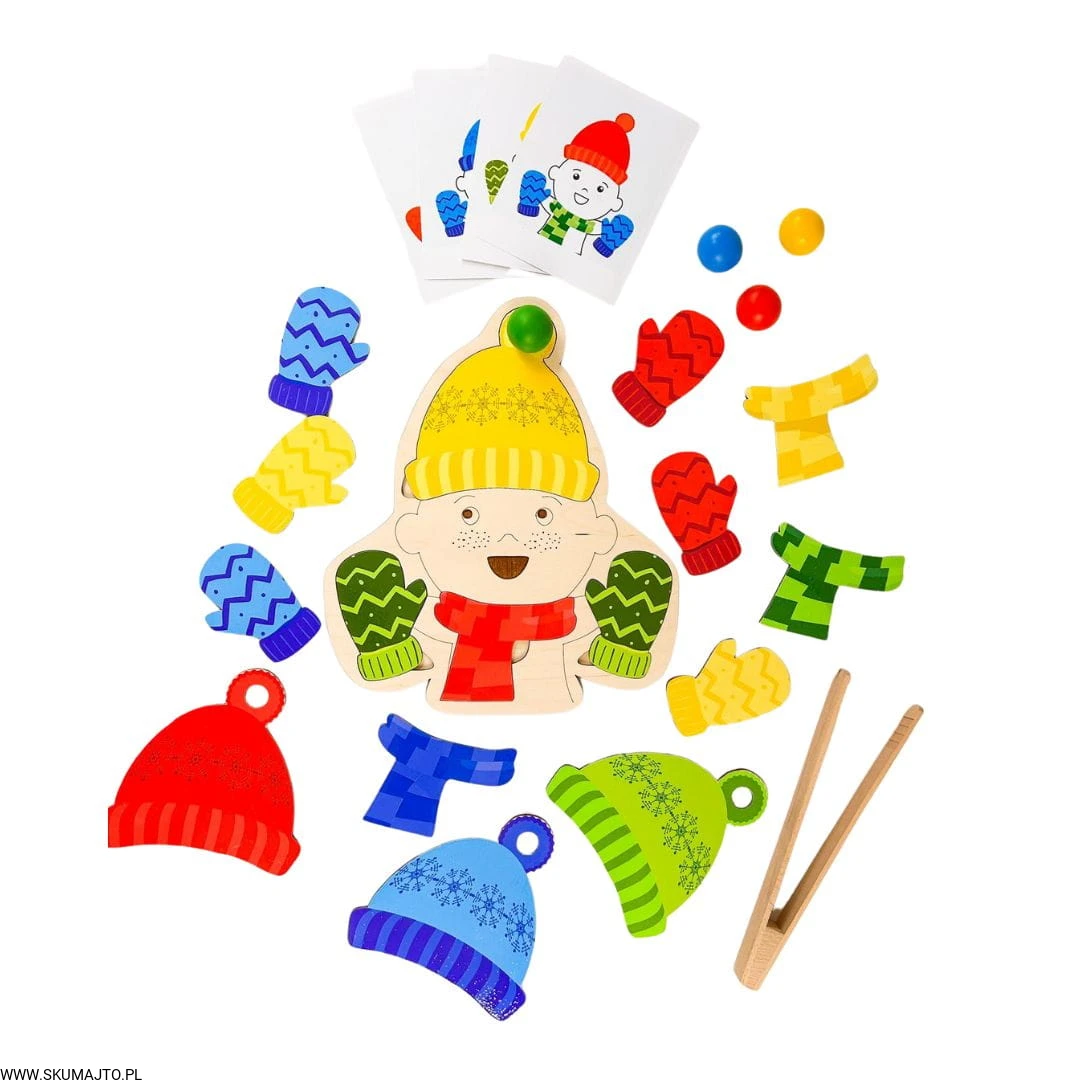 Zimowy spacer, drewniana układanka do odwzorowywania, szczypce, kulki, nauka kolorów
