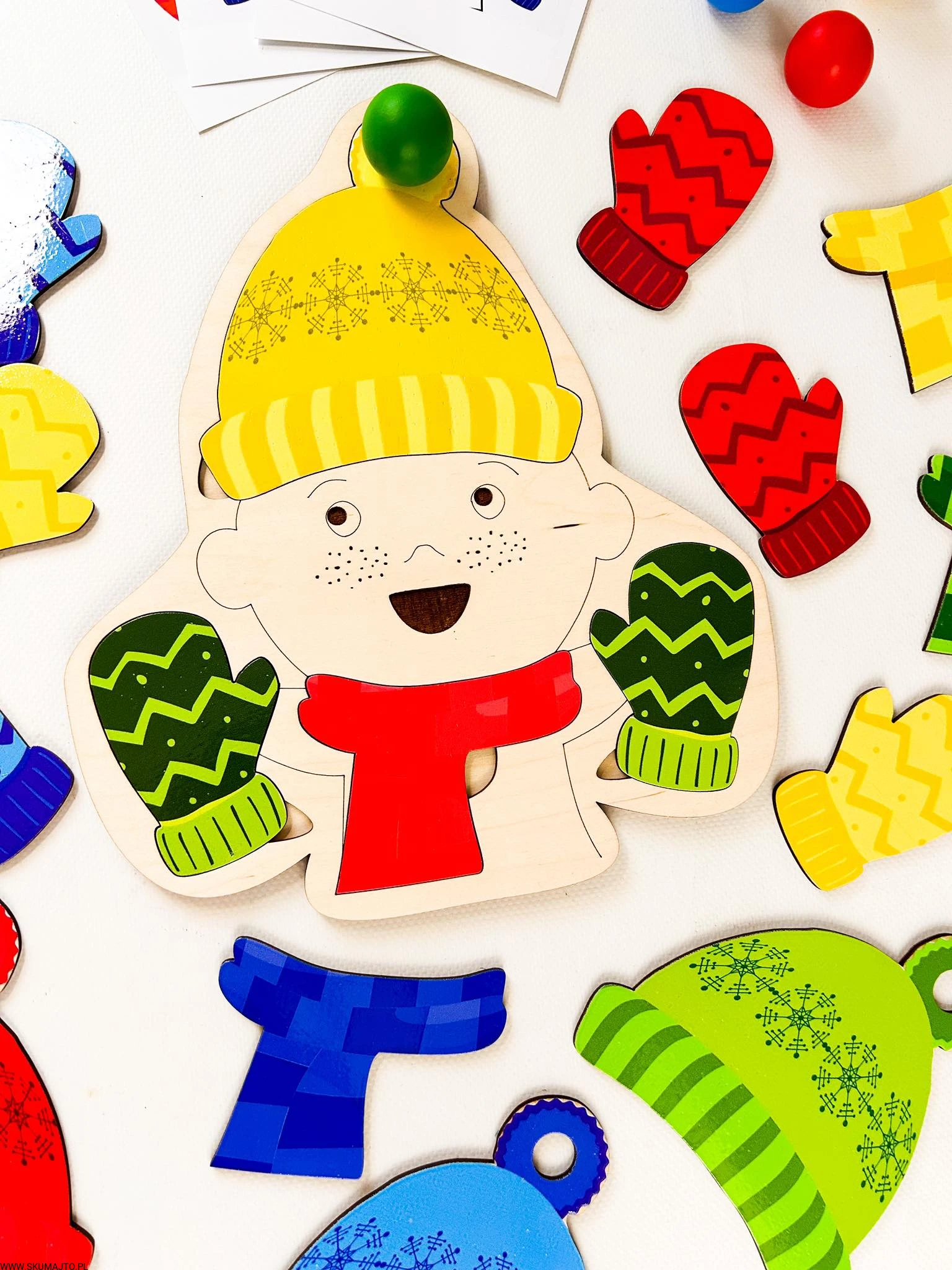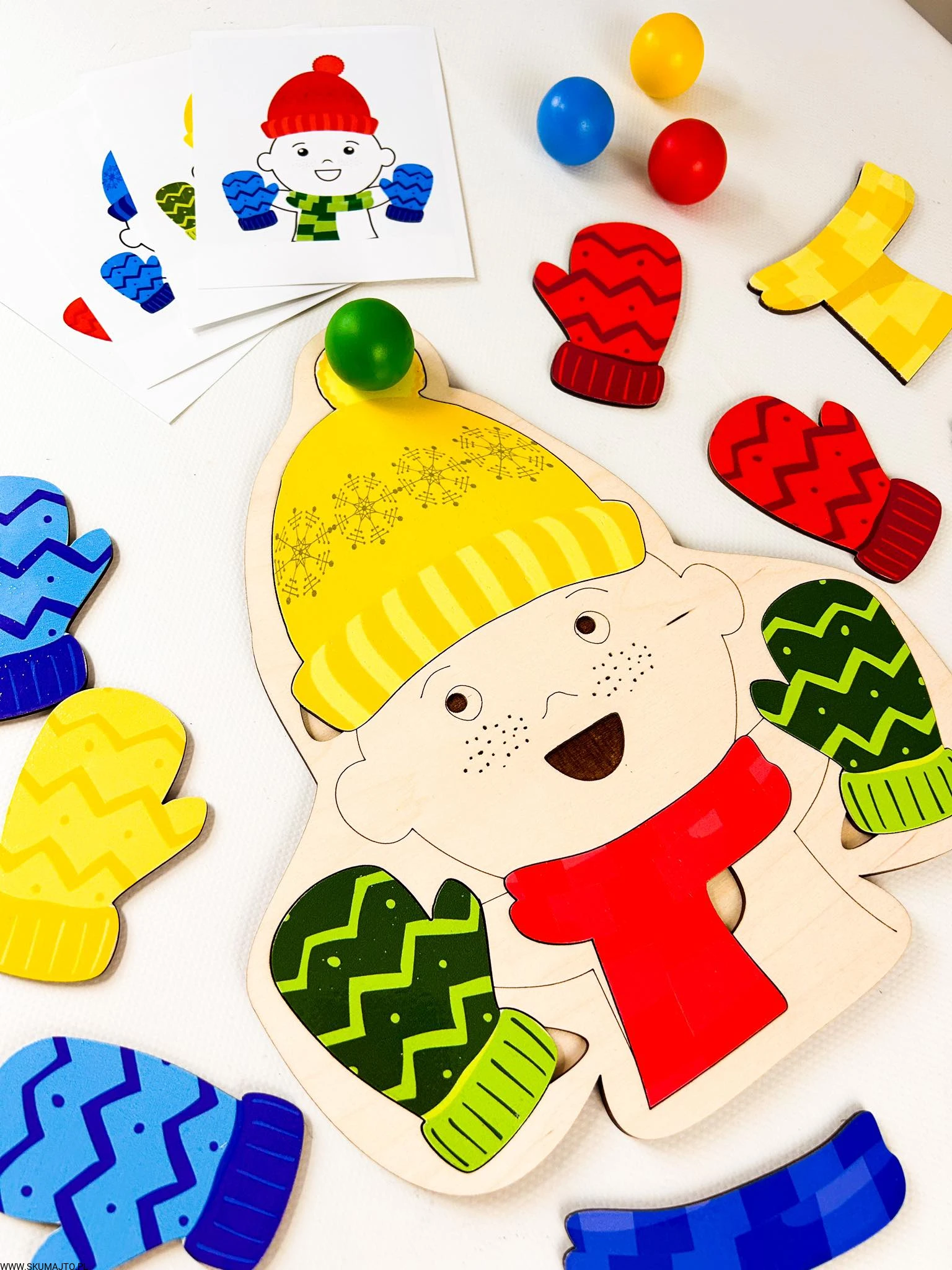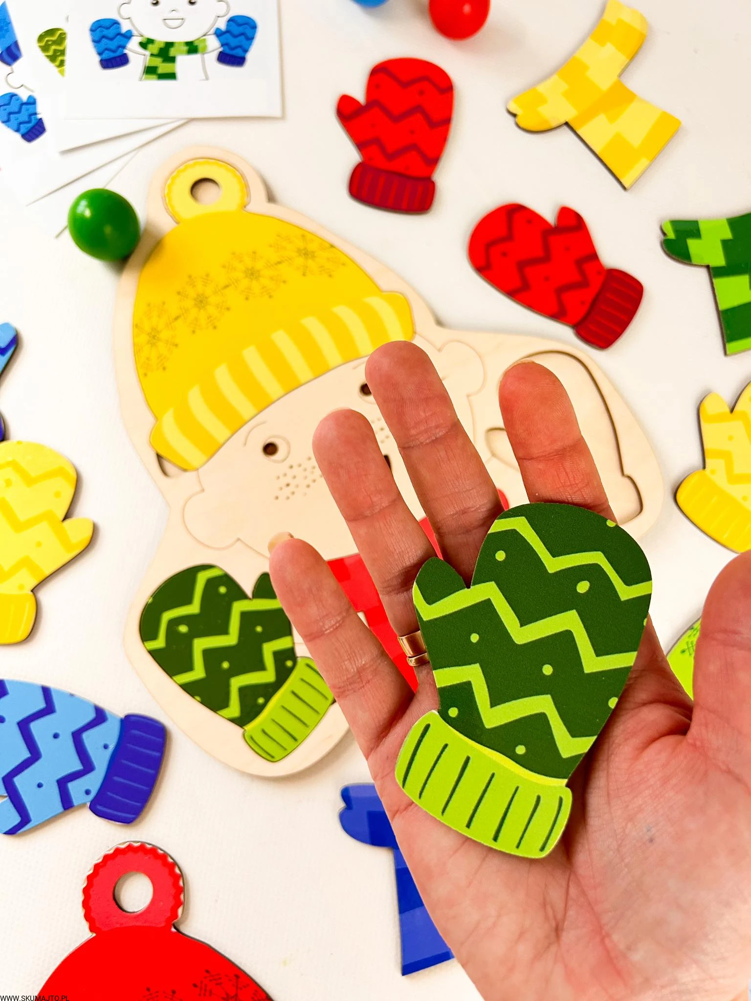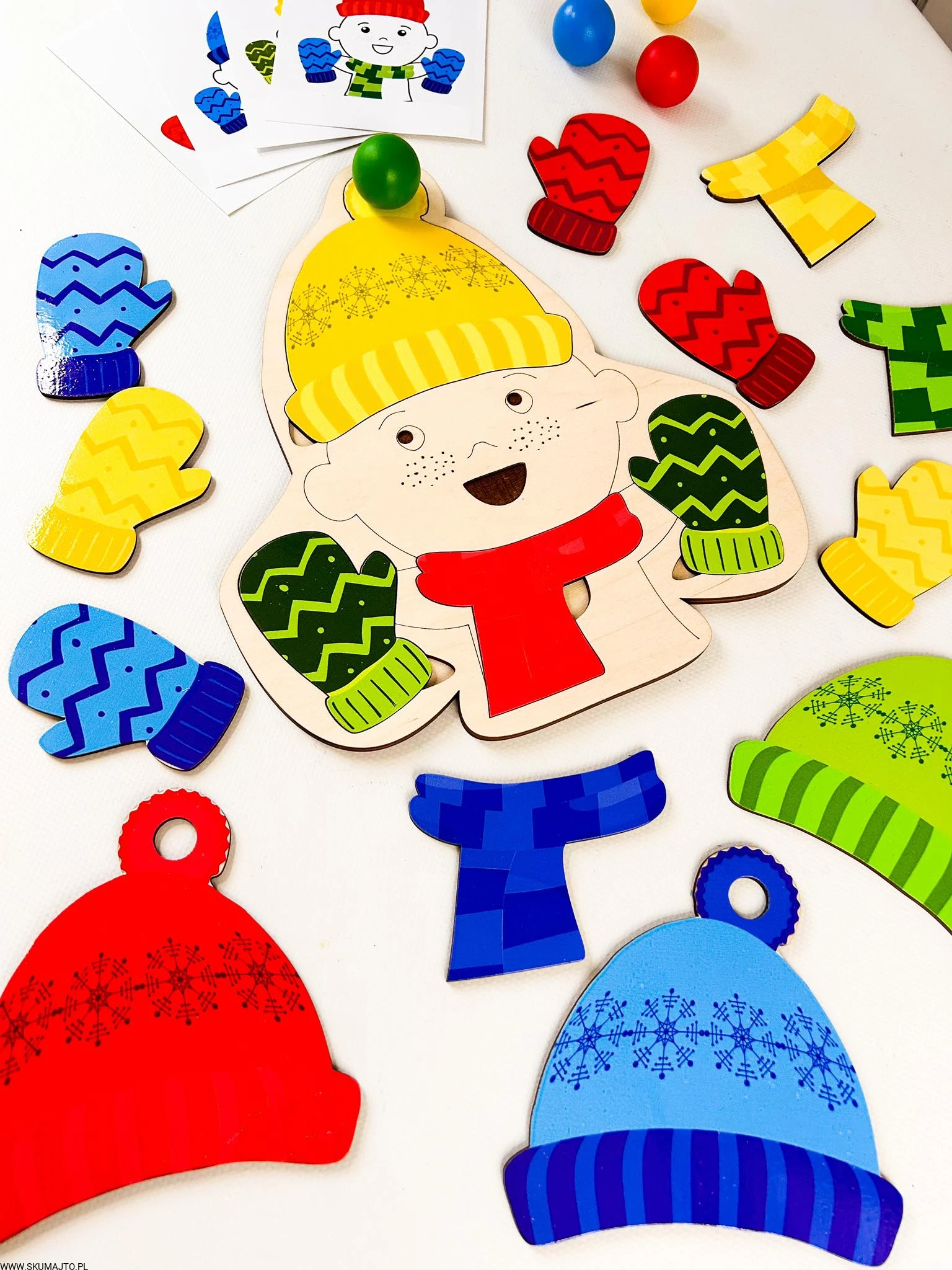Zimowy spacer, drewniana układanka do odwzorowywania, szczypce, kulki, nauka kolorów