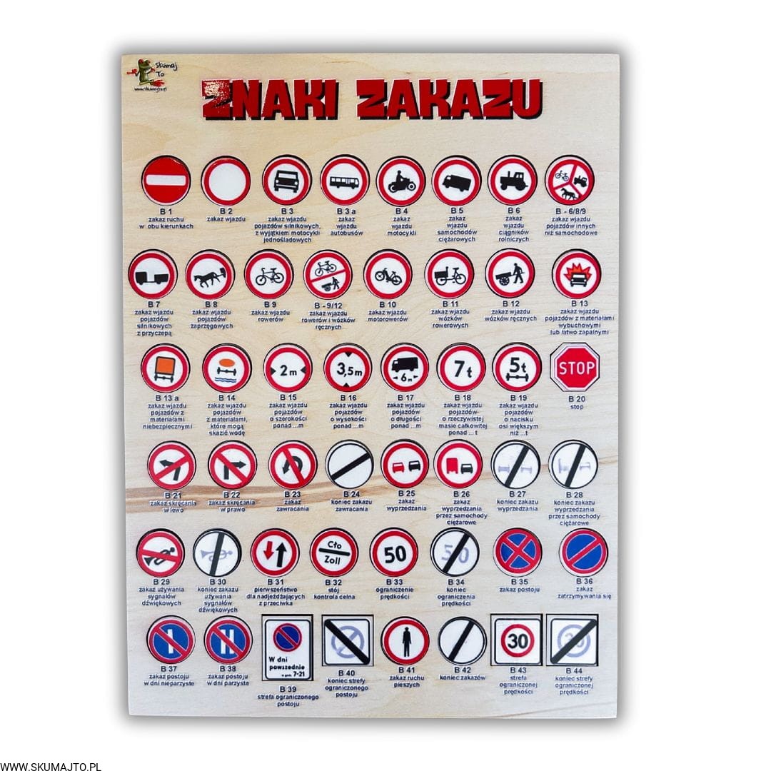 „Znaki zakazu” to duża, solidna układanka drewniana o wymiarach 35 x 45 cm, która zawiera kompletny zestaw znaków zakazu występujących na polskich drogach – aż kilkadziesiąt symboli, każdy z podpisem i miejscem do dopasowania.