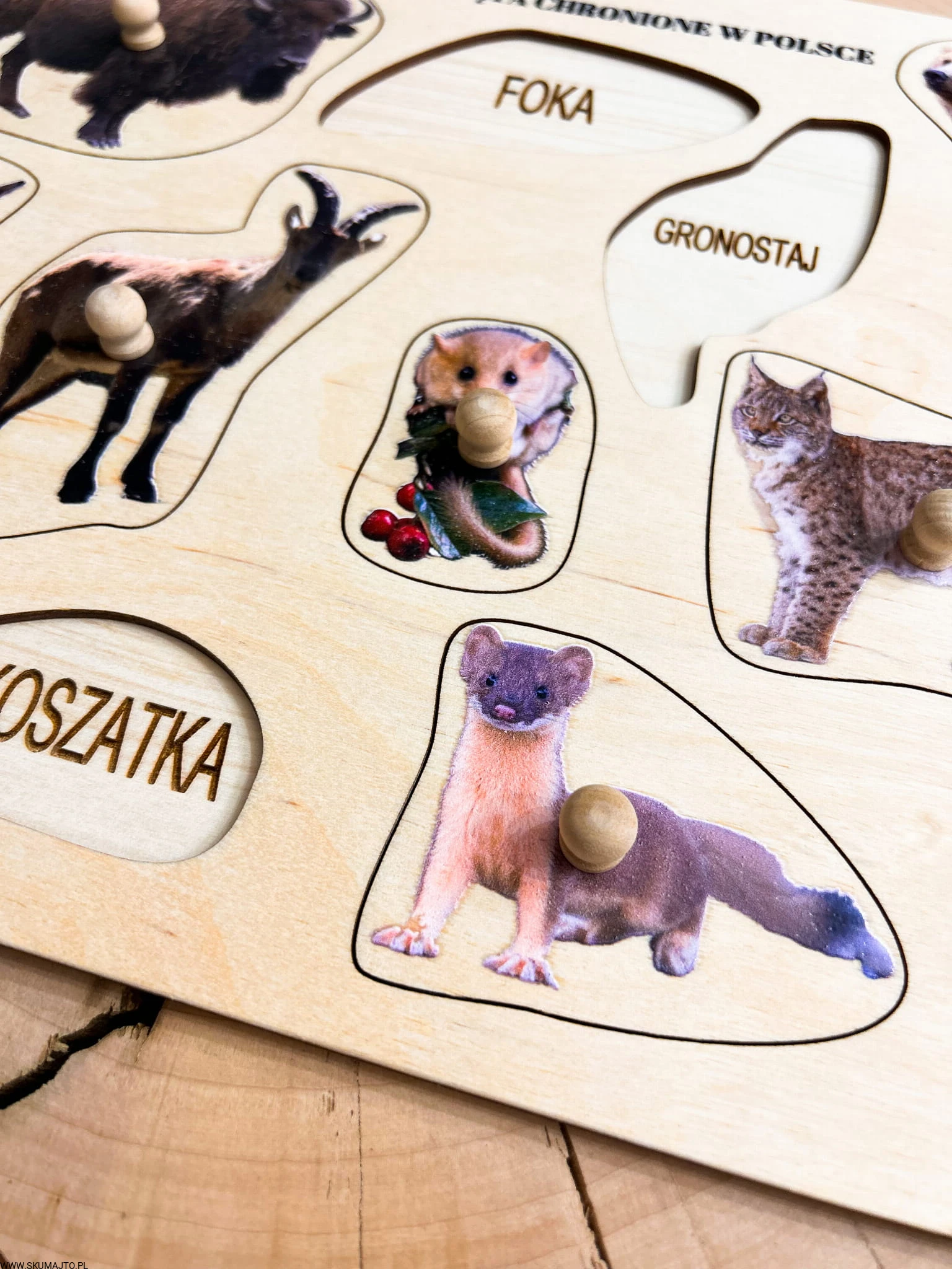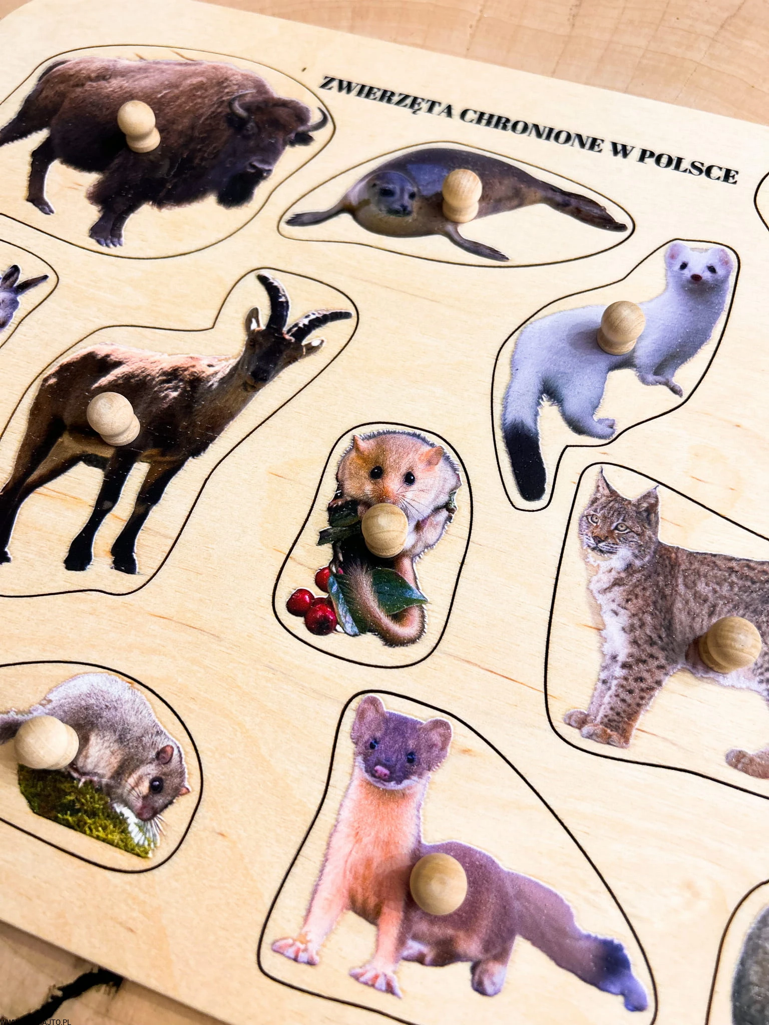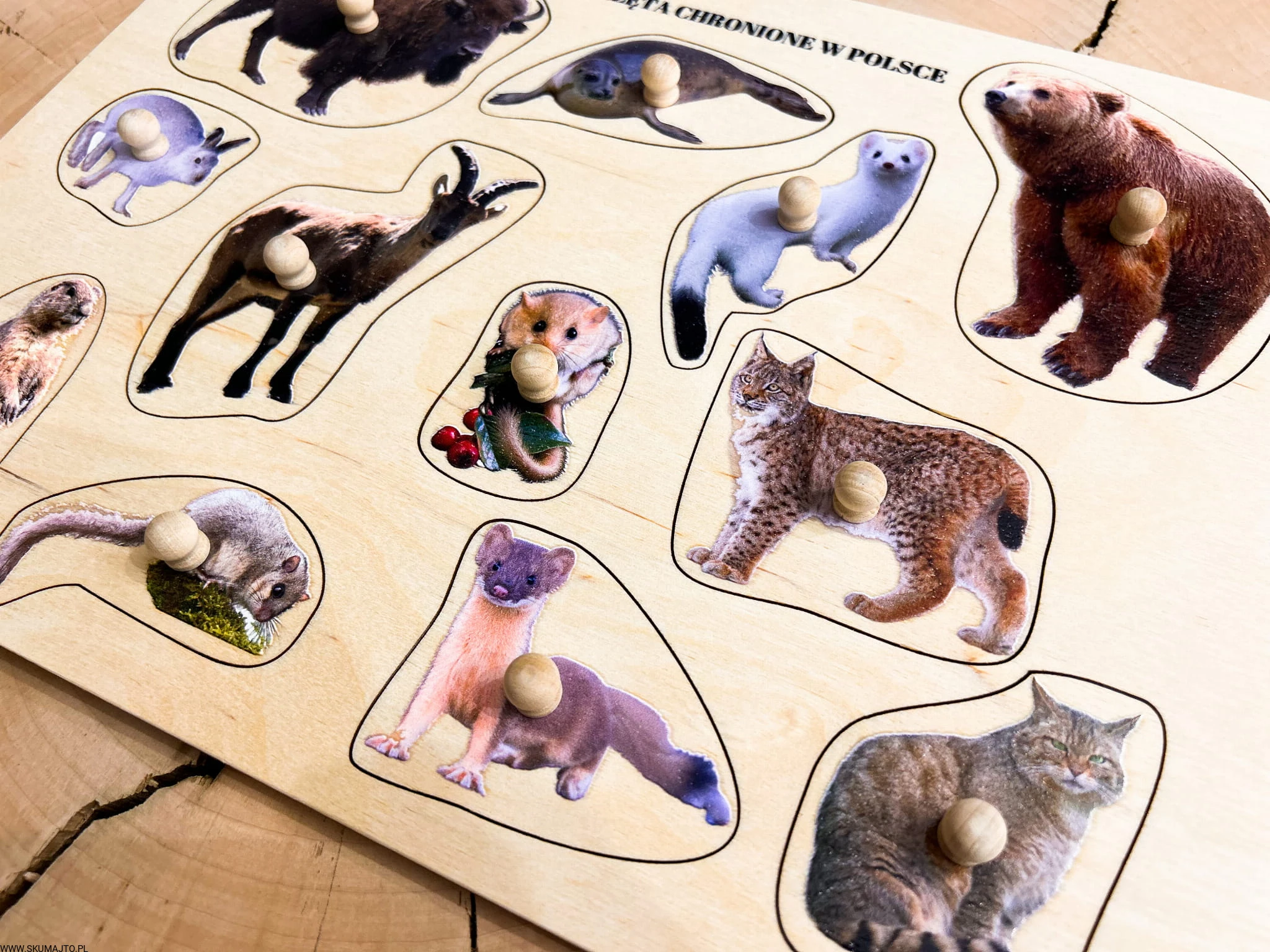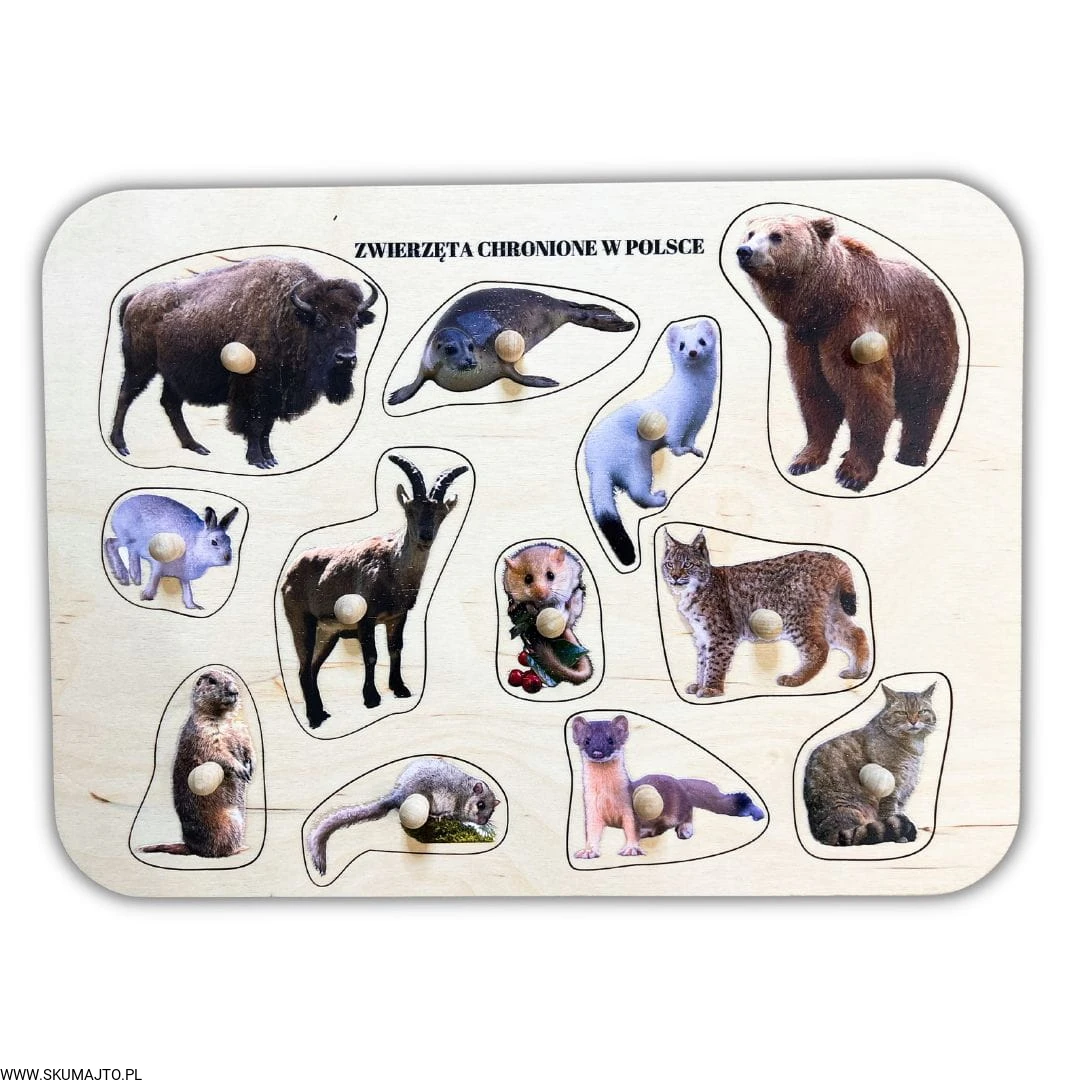 Zwierzęta chronione w Polsce, drewniane puzzle z uchwytami i podpisami, pierwsze puzzle