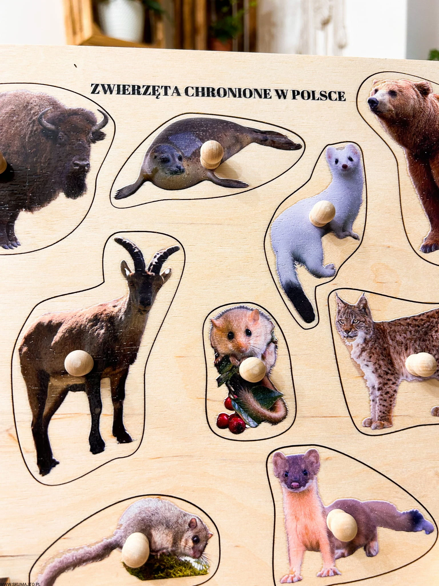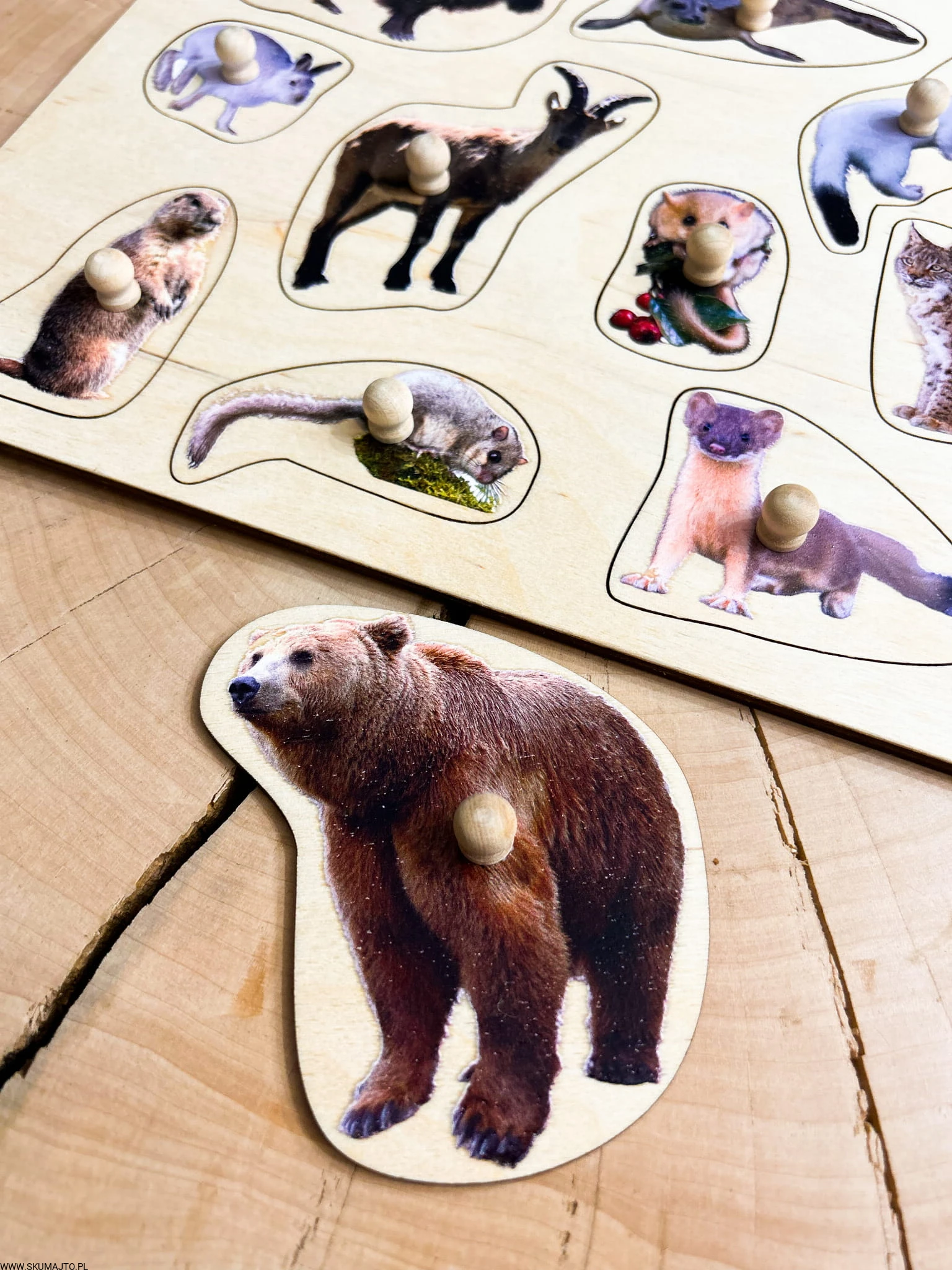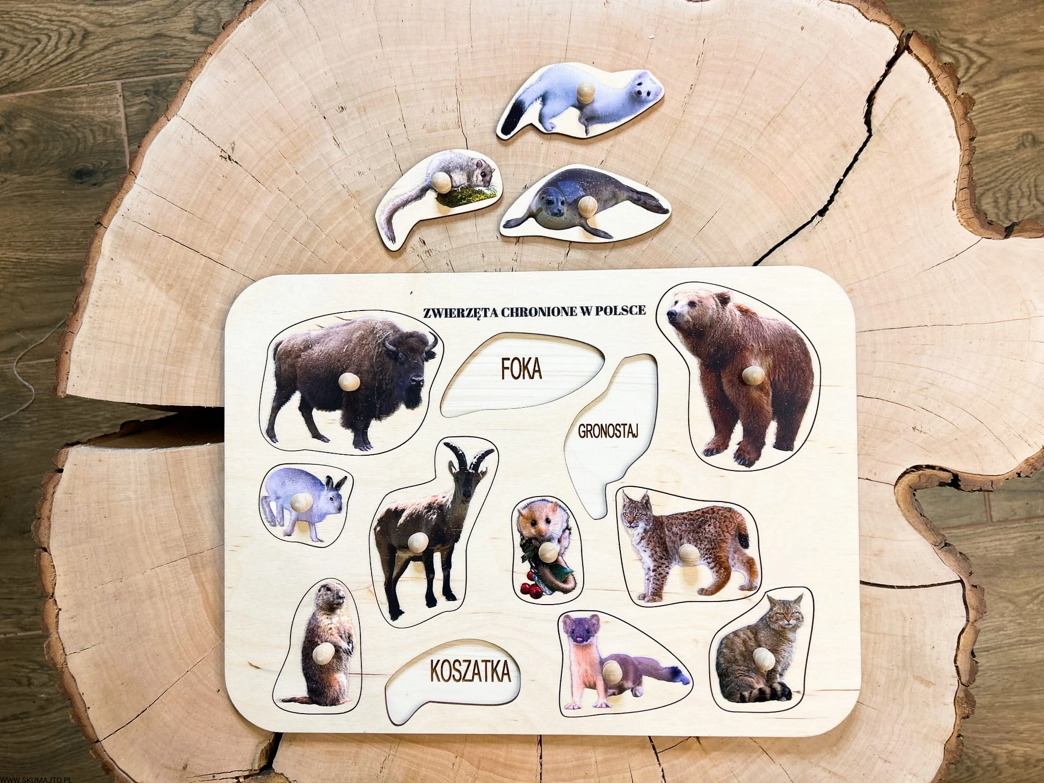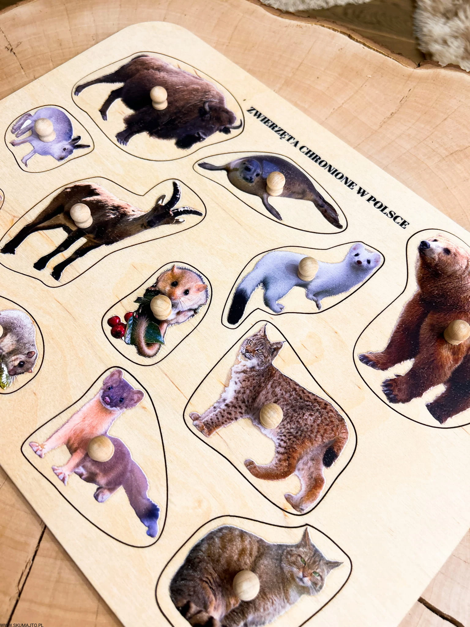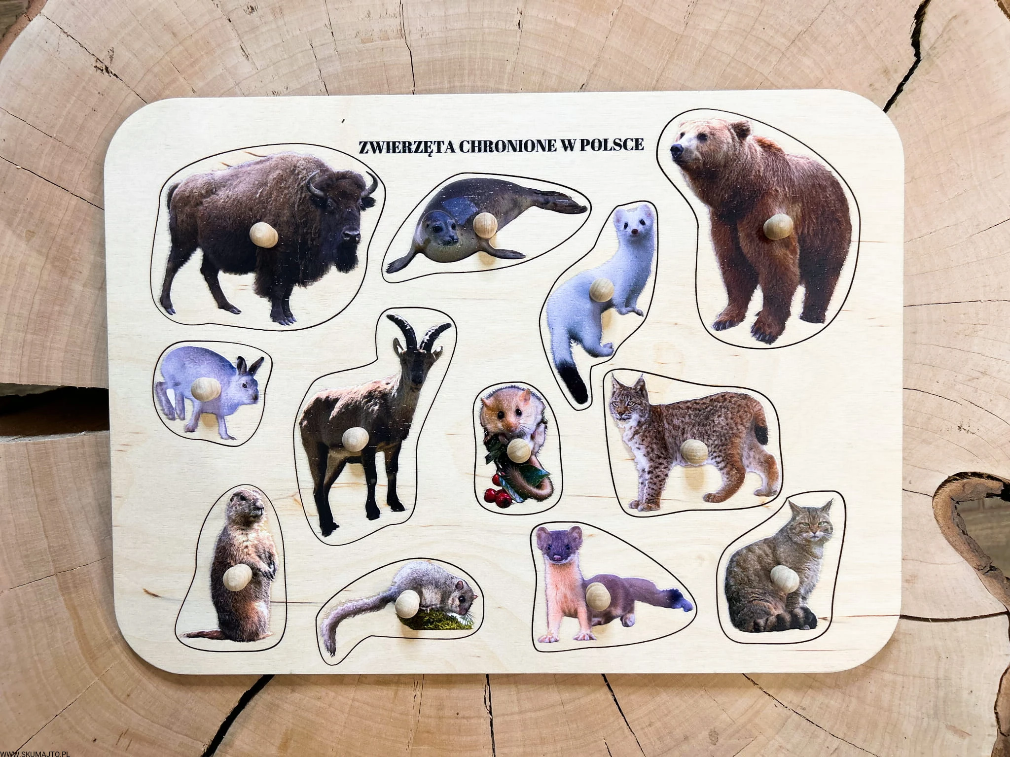 Zwierzęta chronione w Polsce, drewniane puzzle z uchwytami i podpisami, pierwsze puzzle
