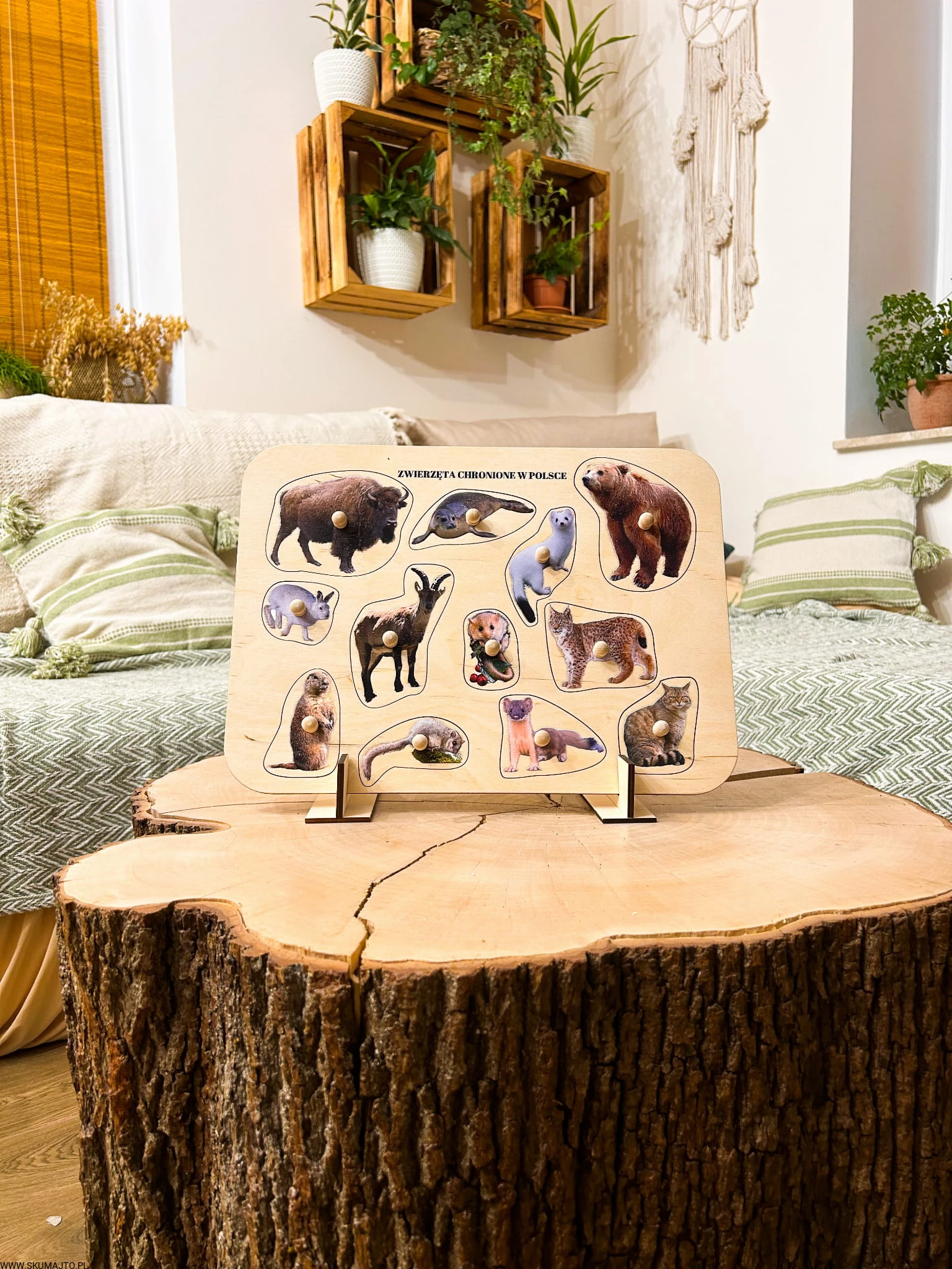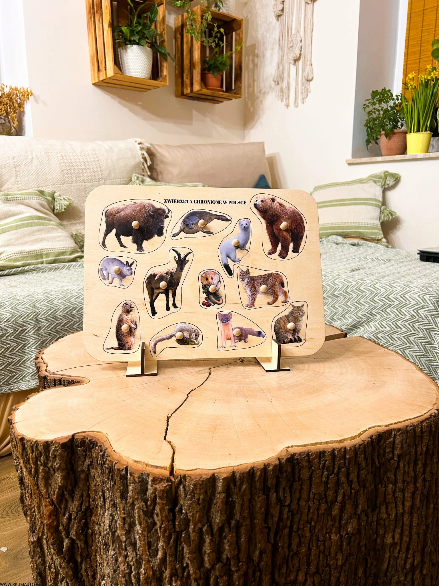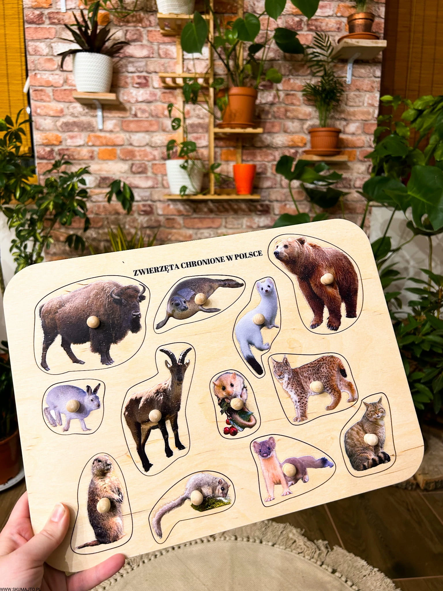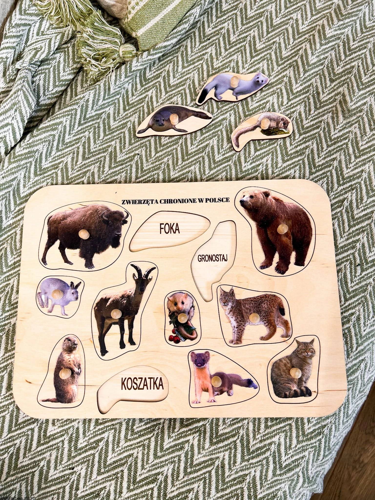 Zwierzęta chronione w Polsce, drewniane puzzle z uchwytami i podpisami, pierwsze puzzle