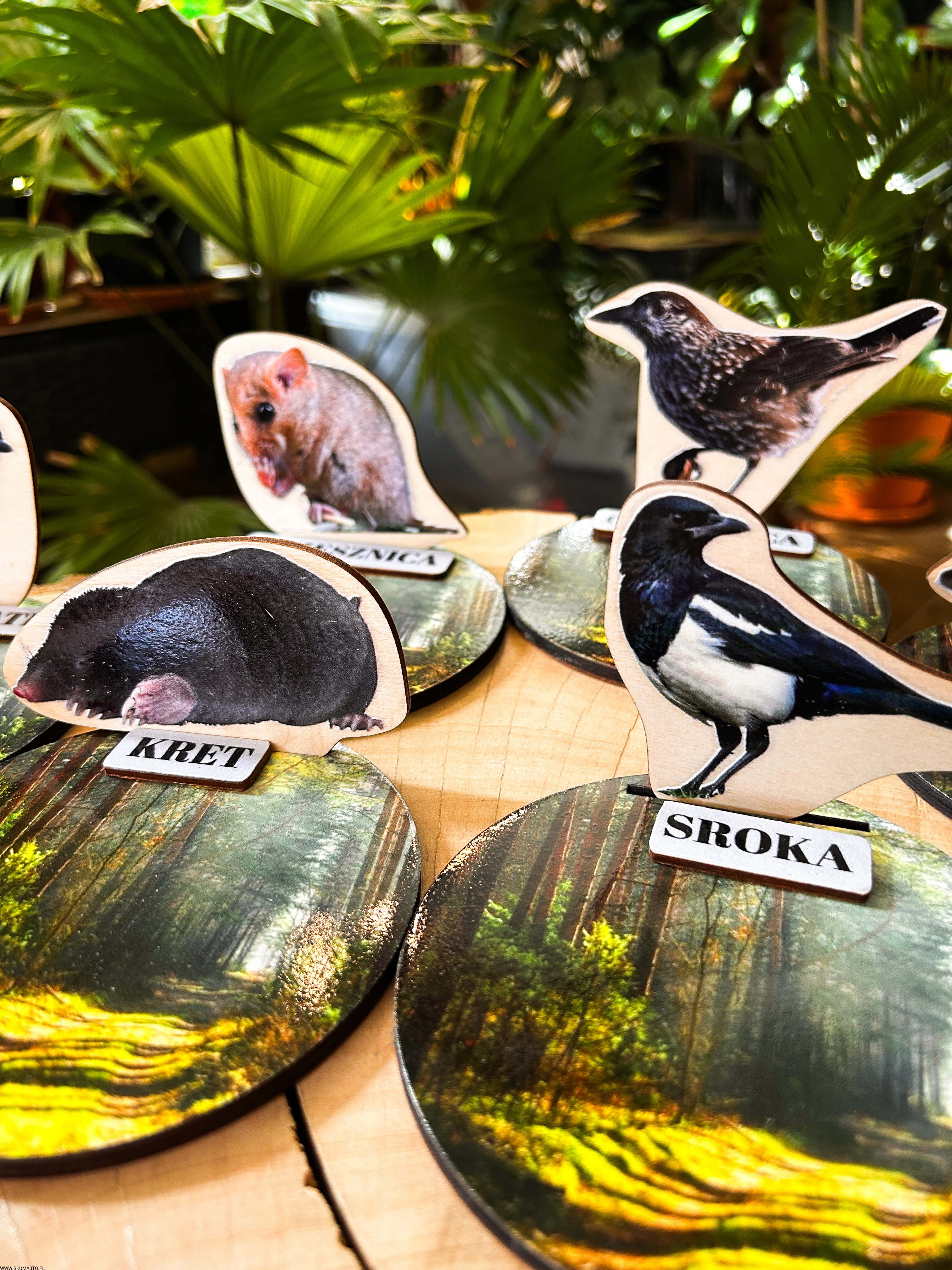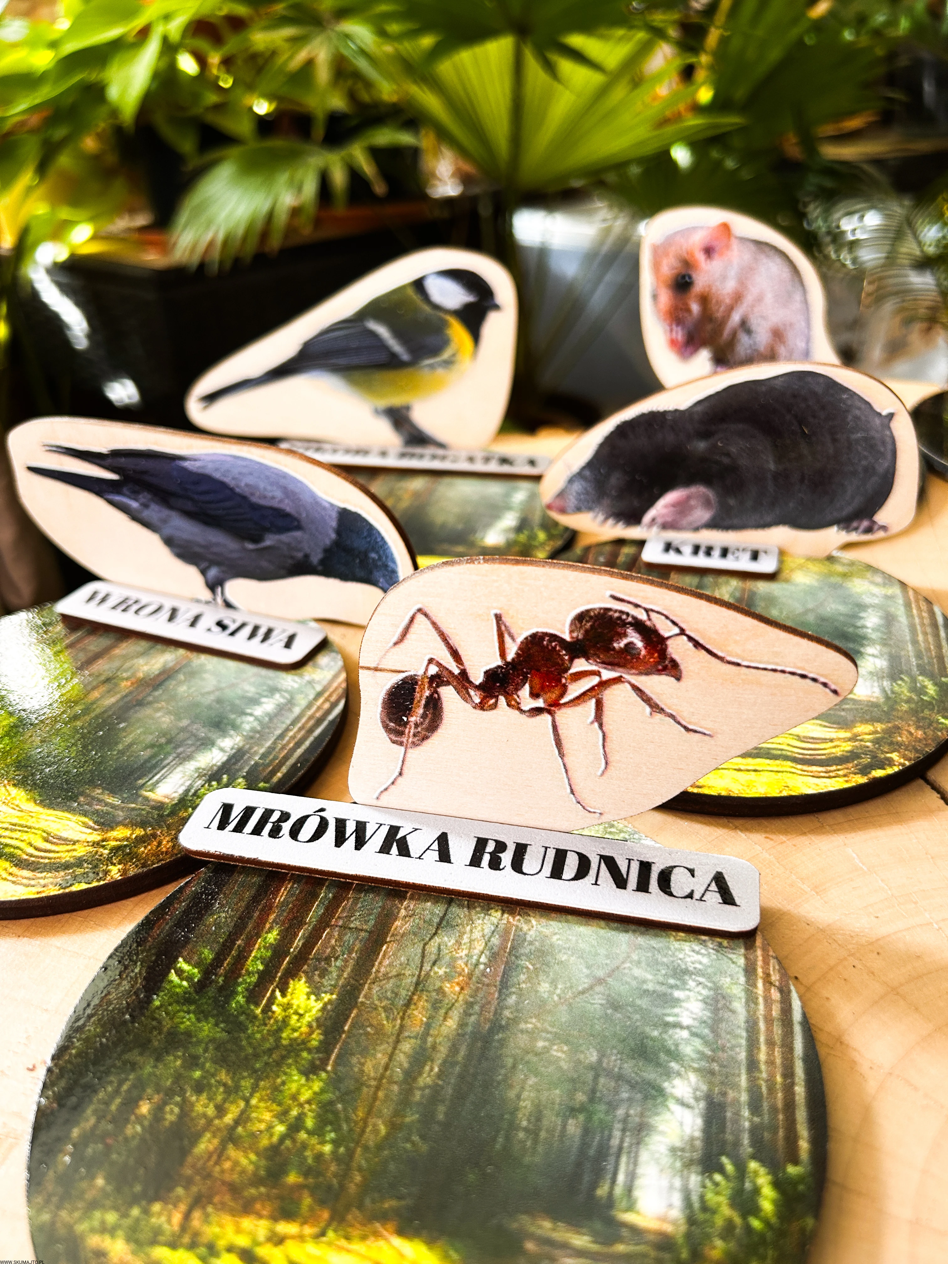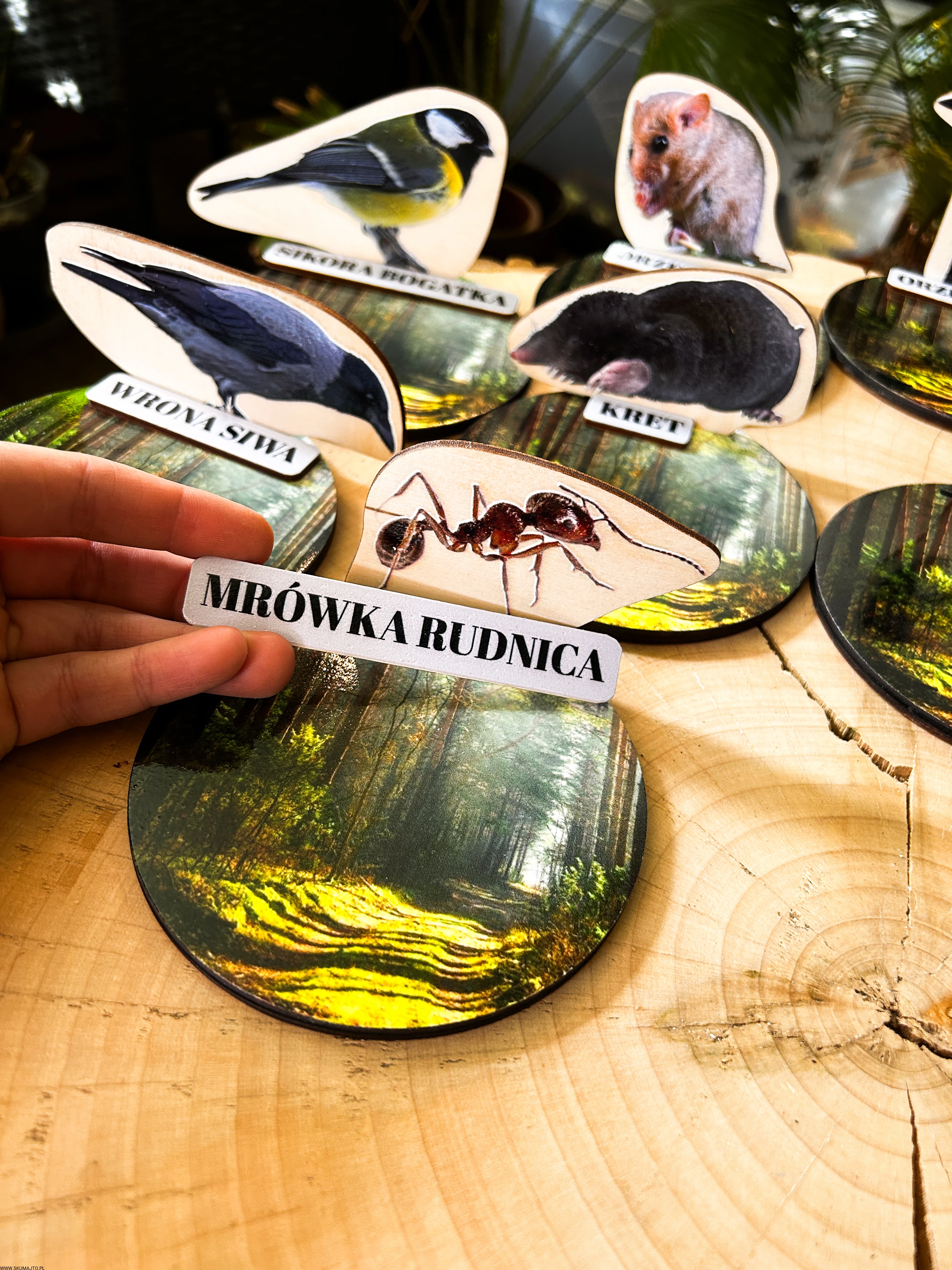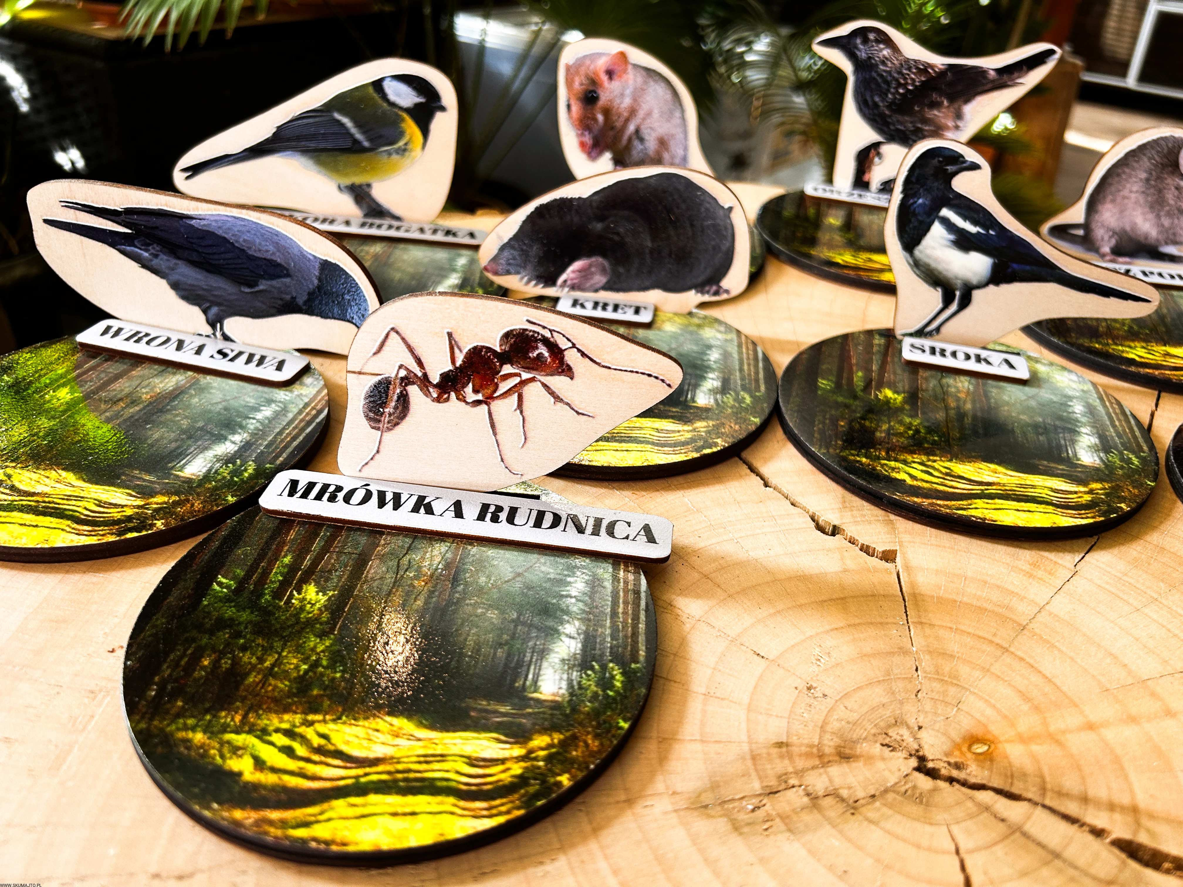 Każde zwierzę ma swój drewniany stojak o średnicy 12 cm, przedstawiający leśne tło oraz podpis z nazwą gatunku.