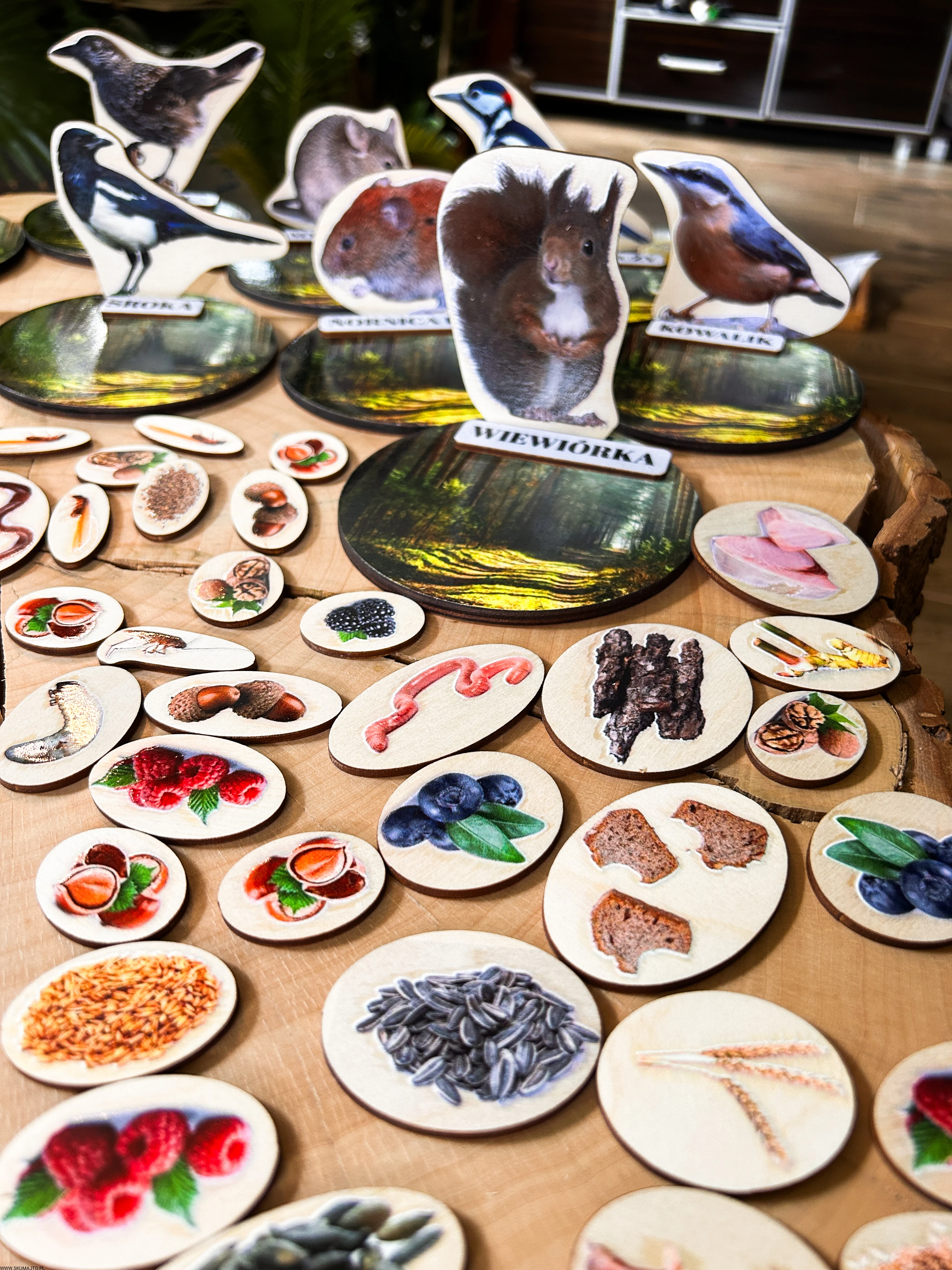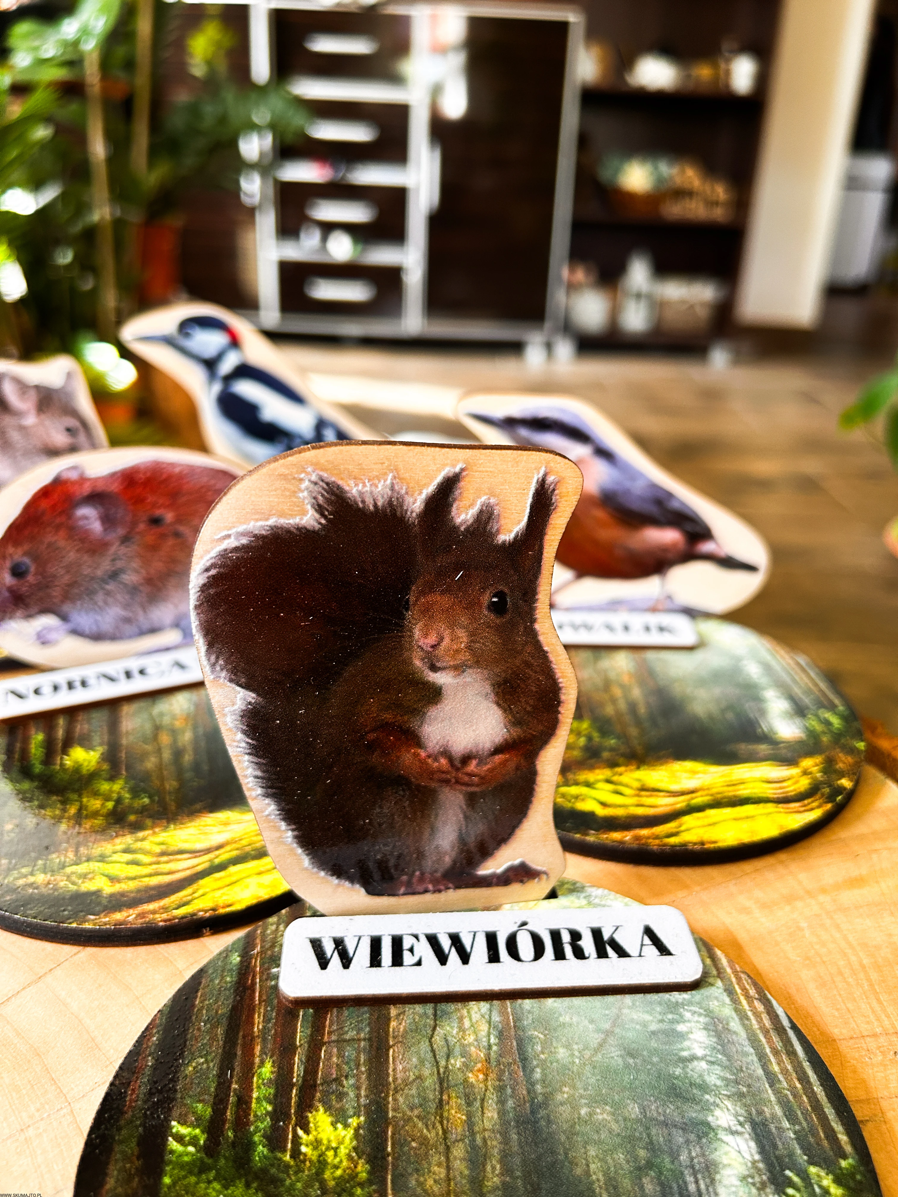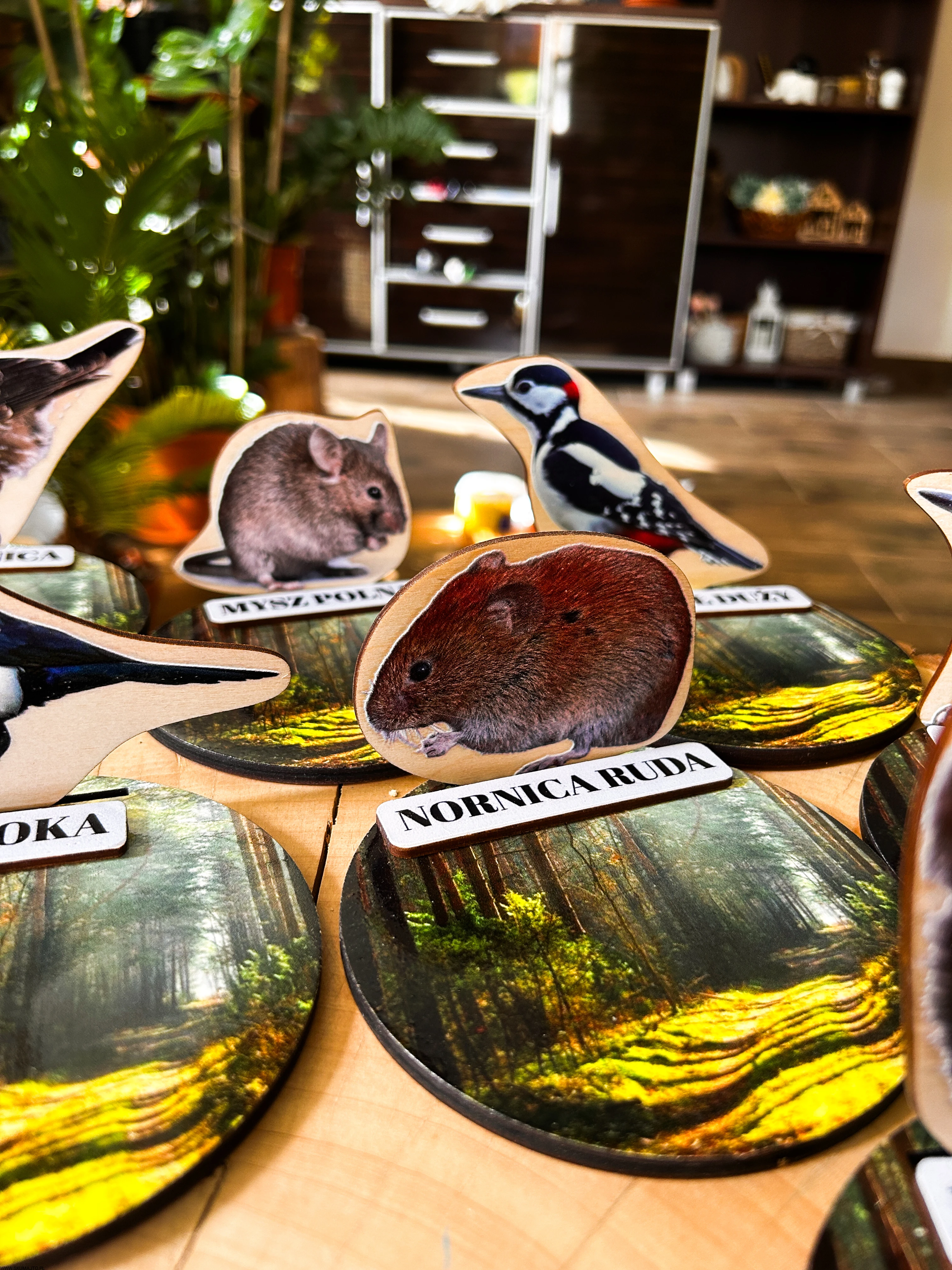 Każde zwierzę ma swój drewniany stojak o średnicy 12 cm, przedstawiający leśne tło oraz podpis z nazwą gatunku.