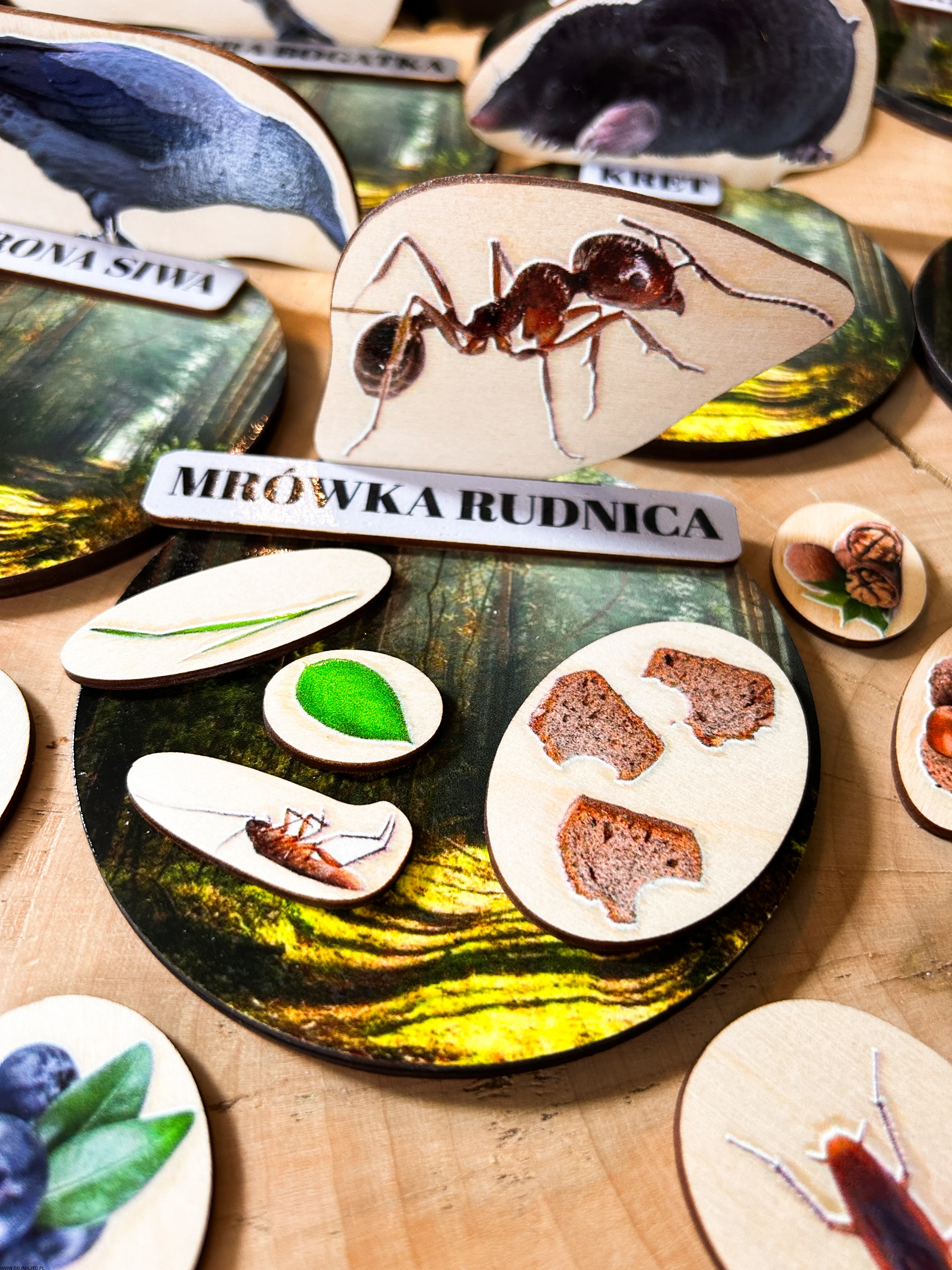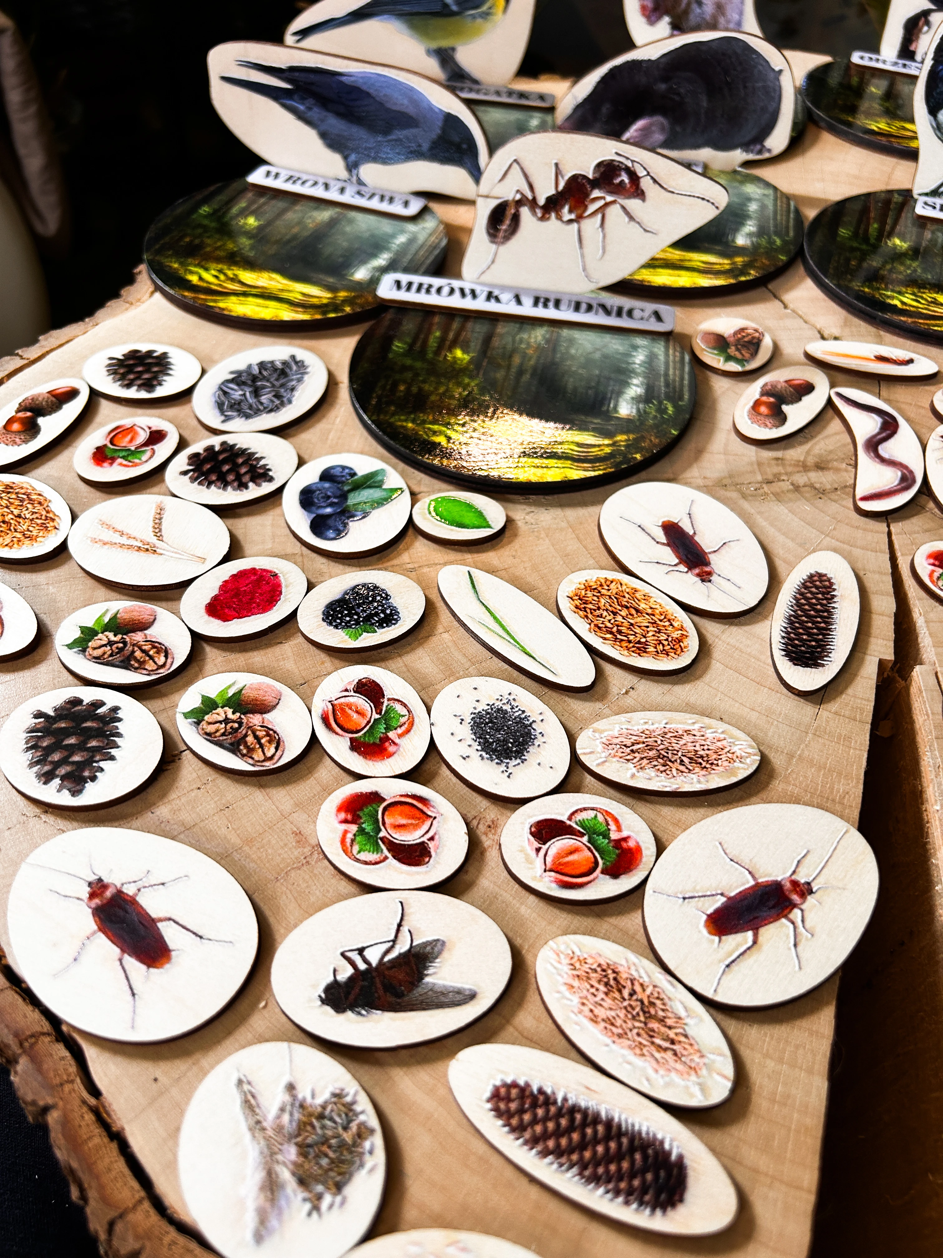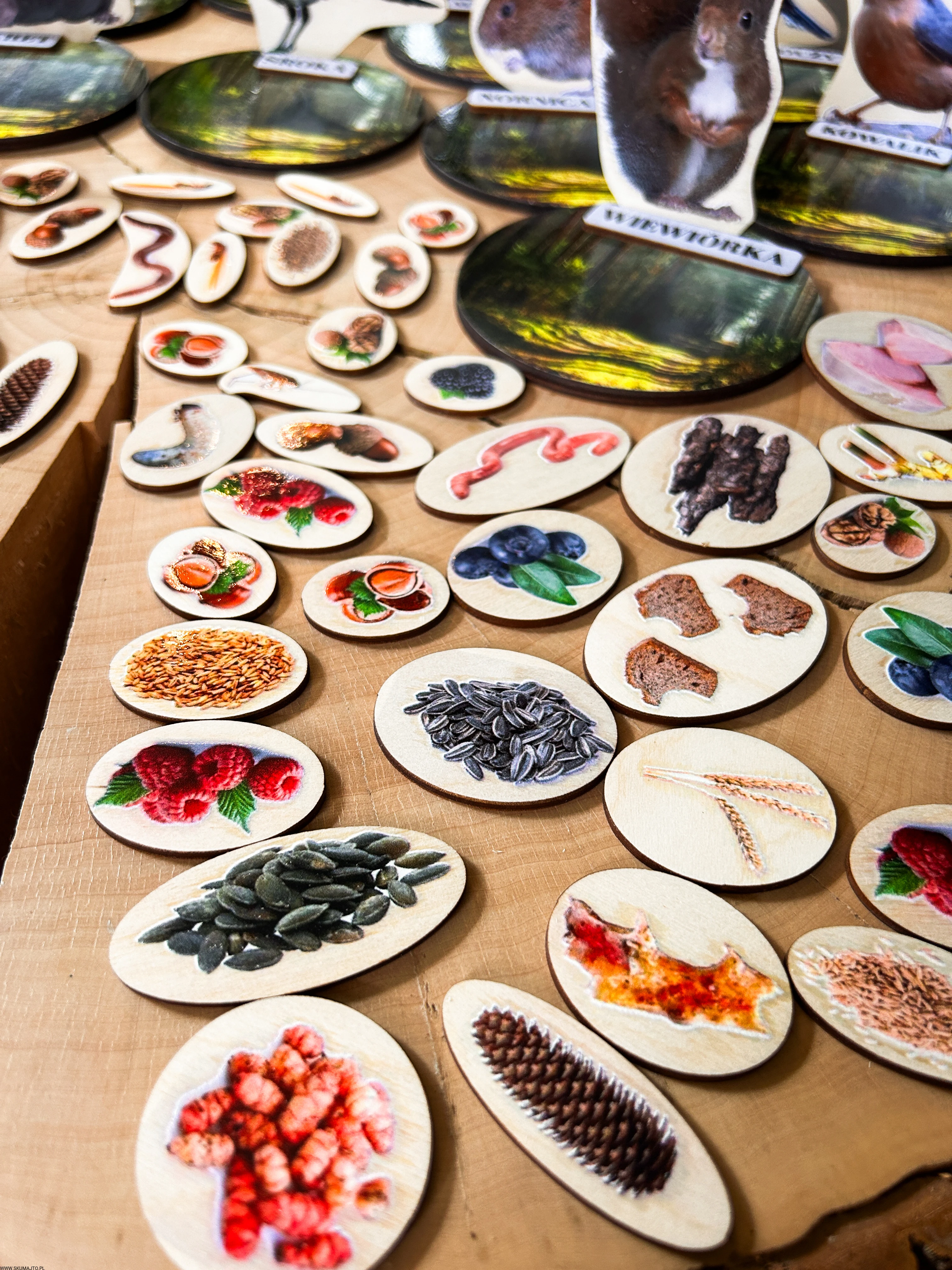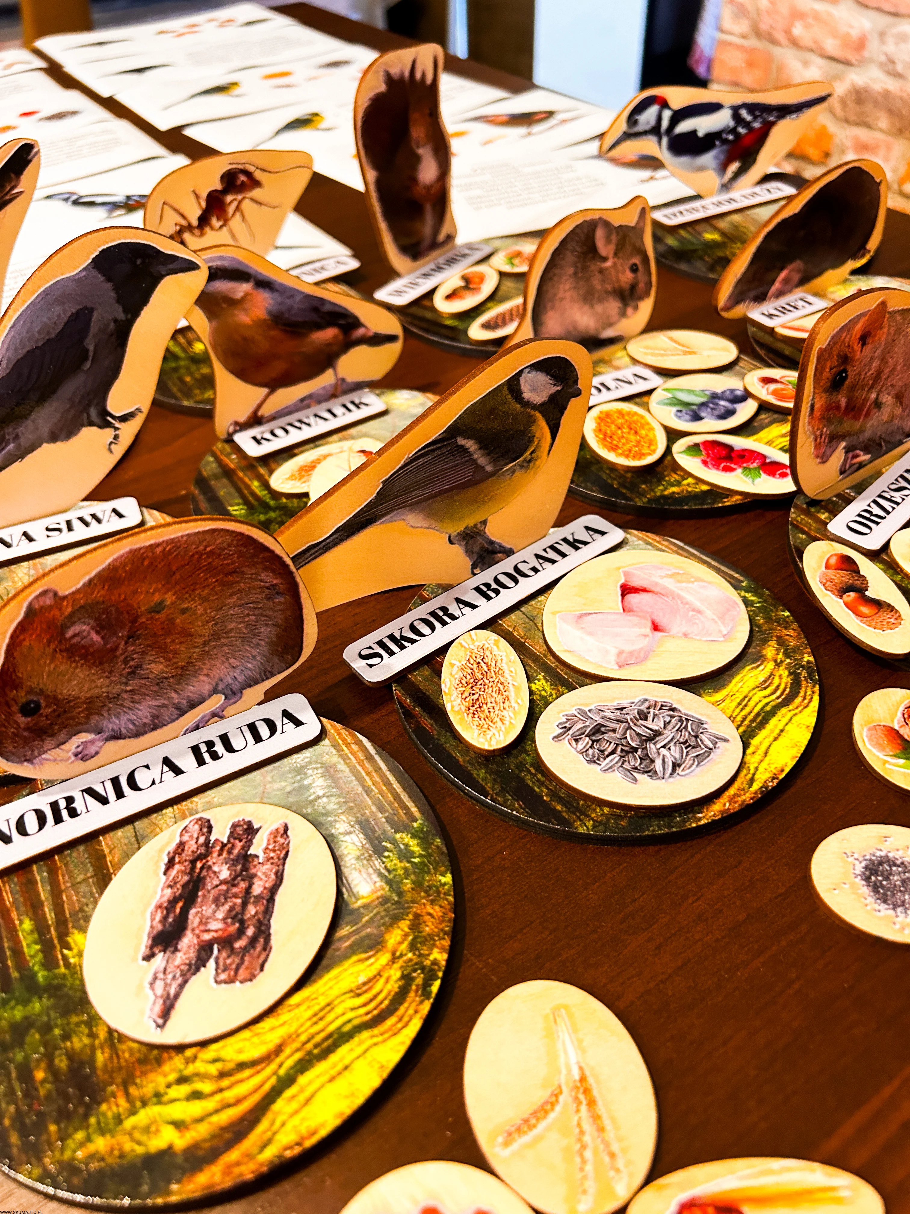 Każde zwierzę ma swój drewniany stojak o średnicy 12 cm, przedstawiający leśne tło oraz podpis z nazwą gatunku.