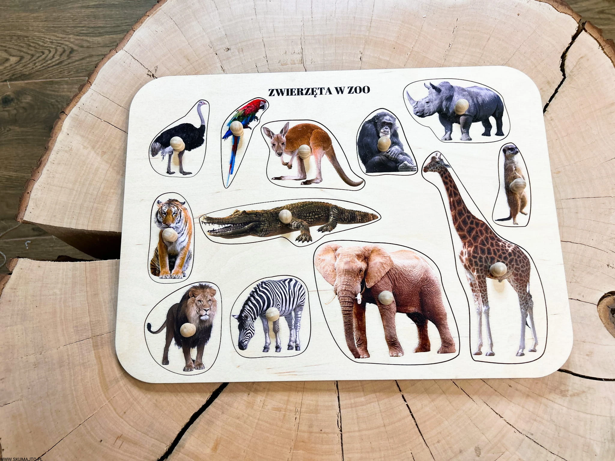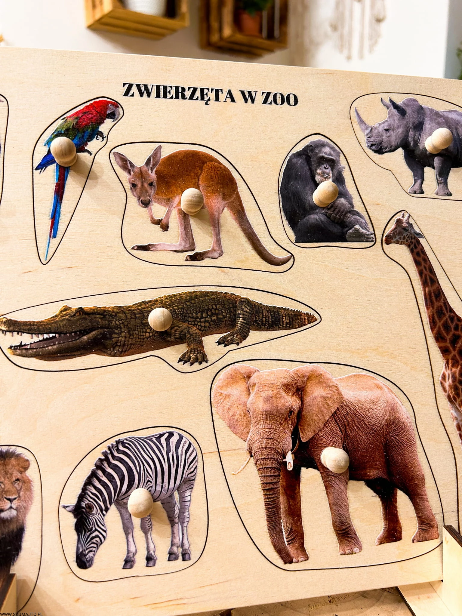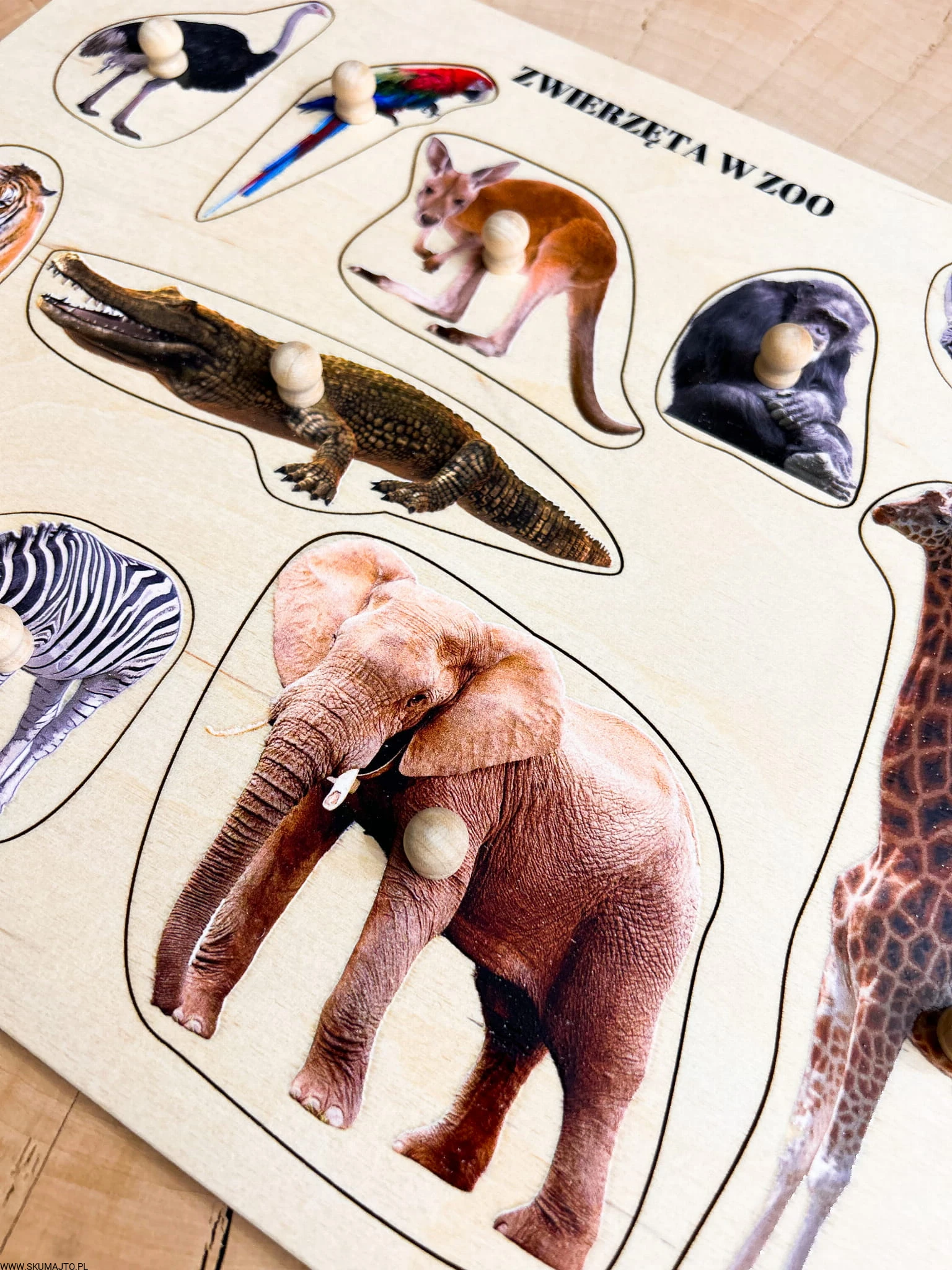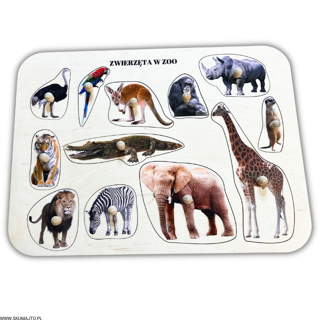 Zwierzęta w ZOO, drewniane puzzle z uchwytami i podpisami, pierwsze puzzle