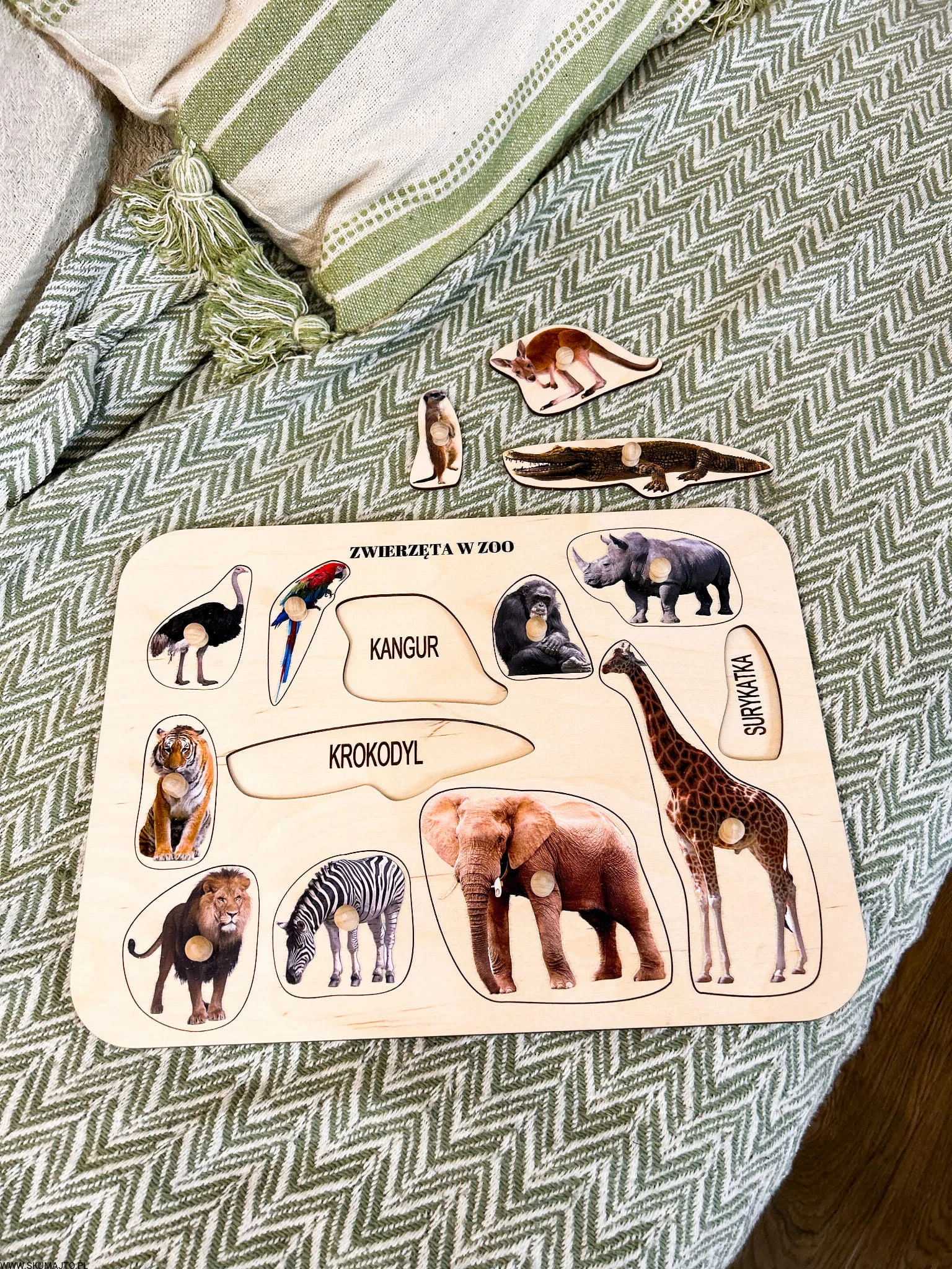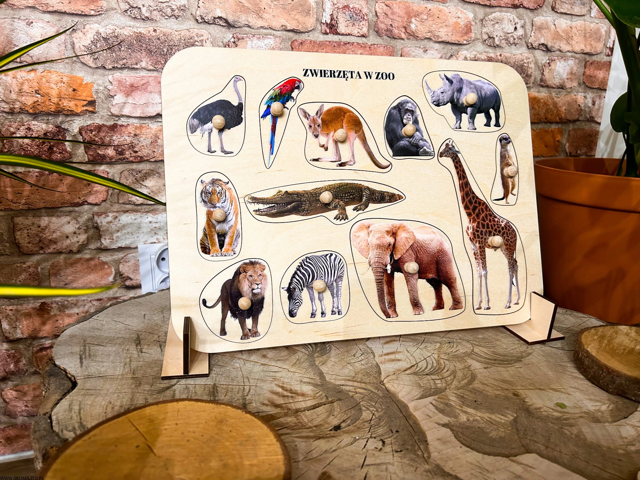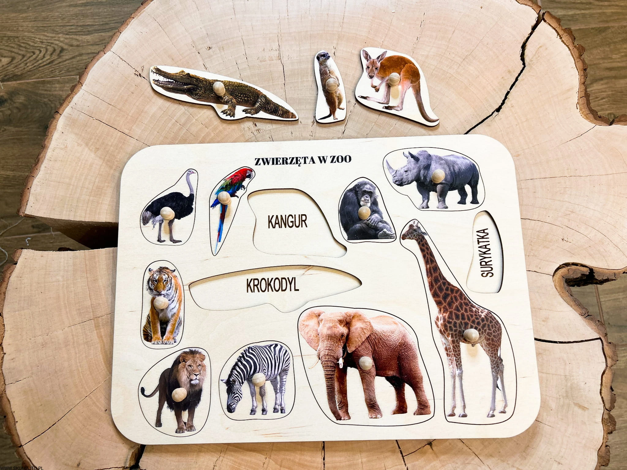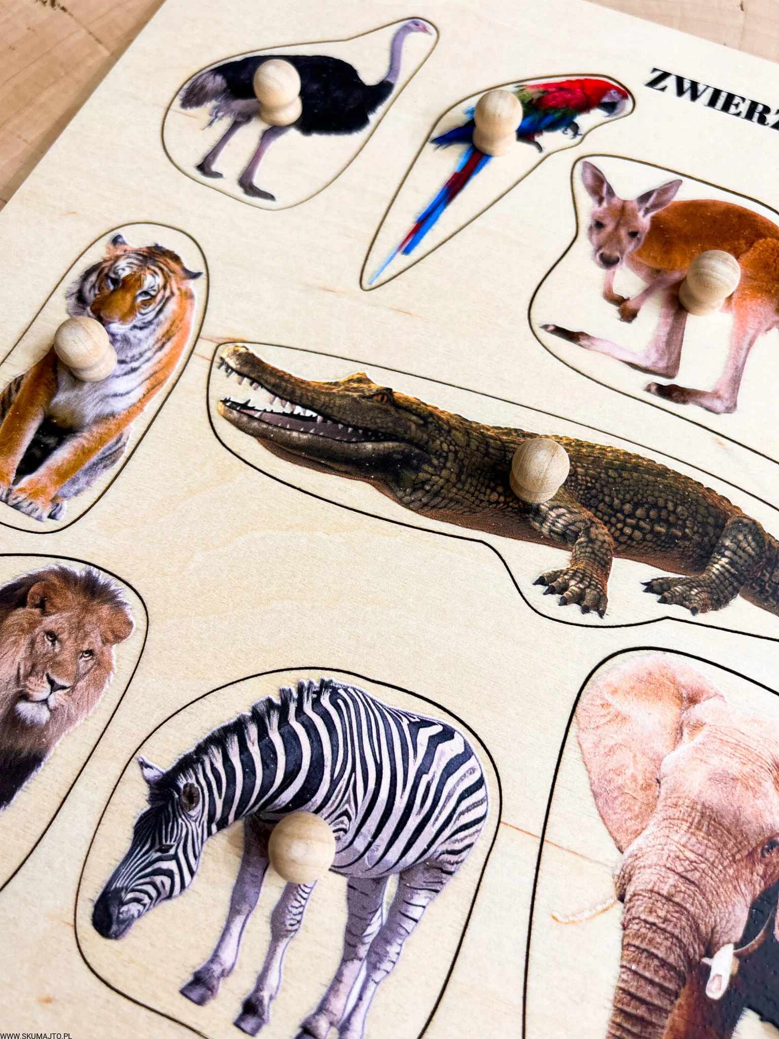 Zwierzęta w ZOO, drewniane puzzle z uchwytami i podpisami, pierwsze puzzle