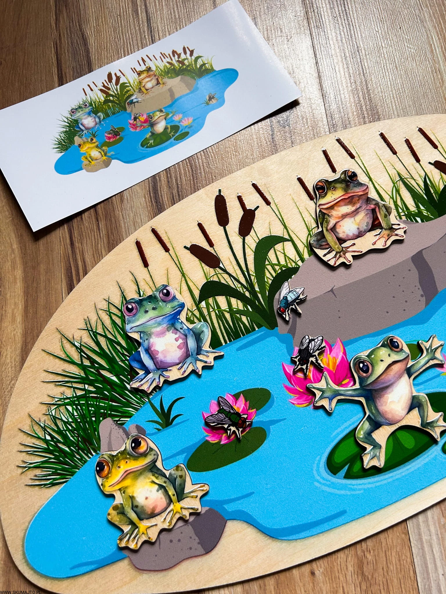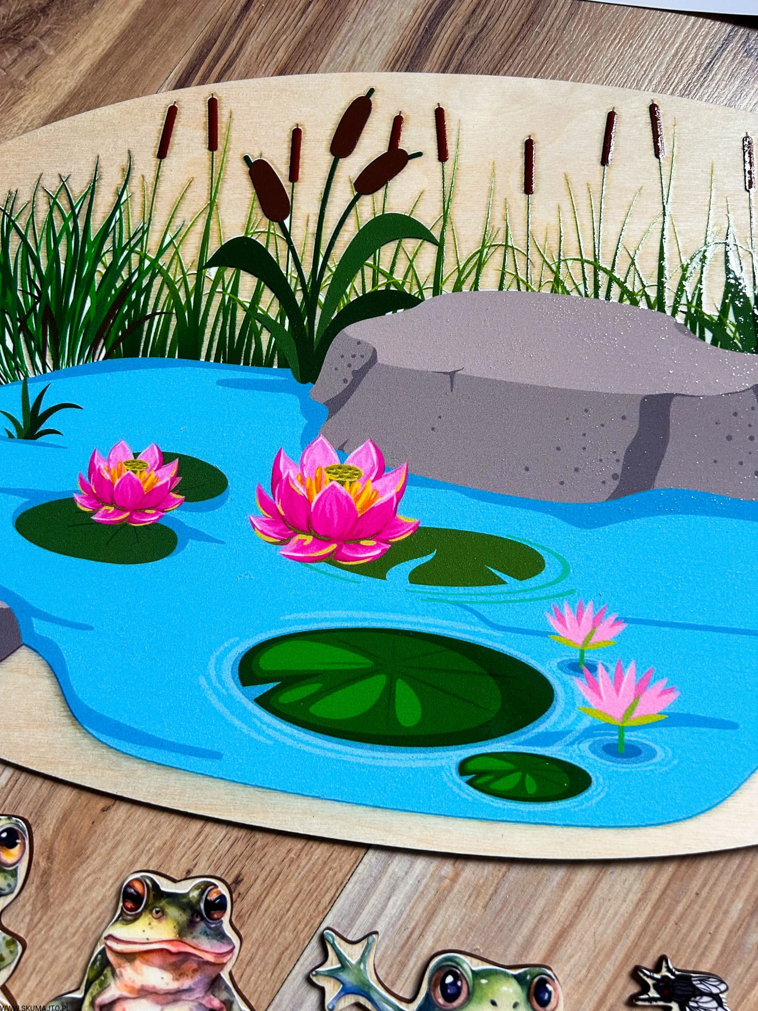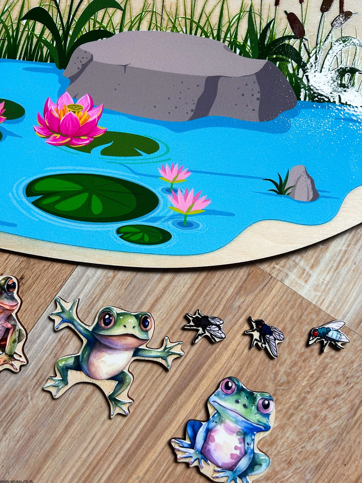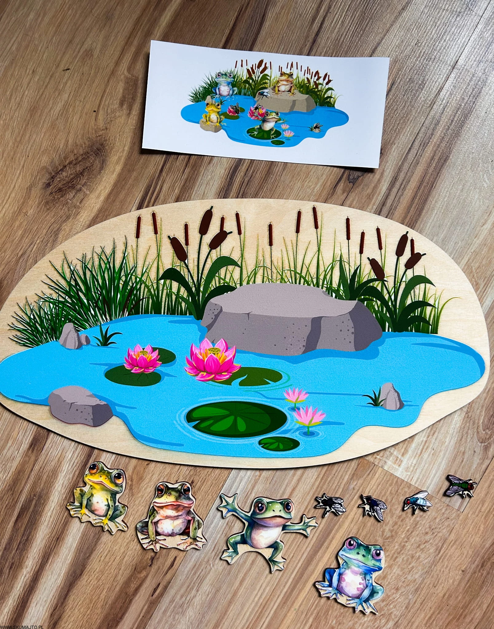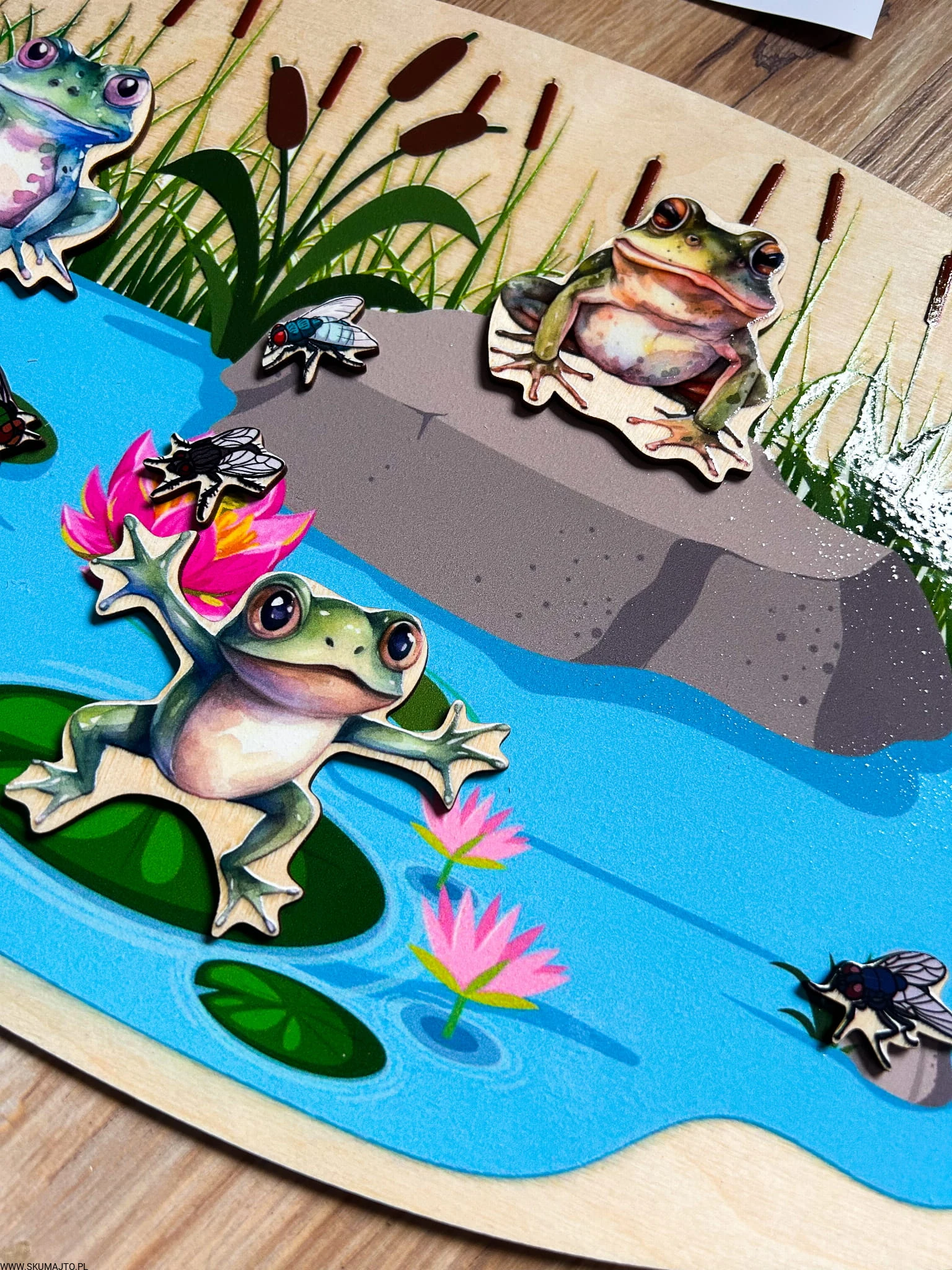 - Podstawa z Nadrukiem Stawu: Pełen zieleni, wody i życia – idealne tło dla naszych żabich przygód.