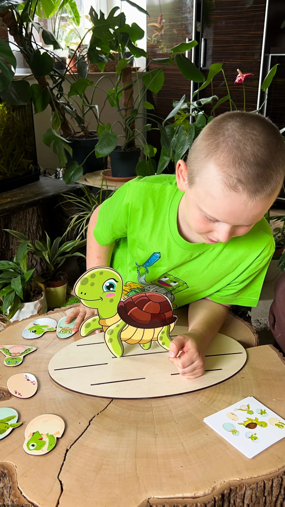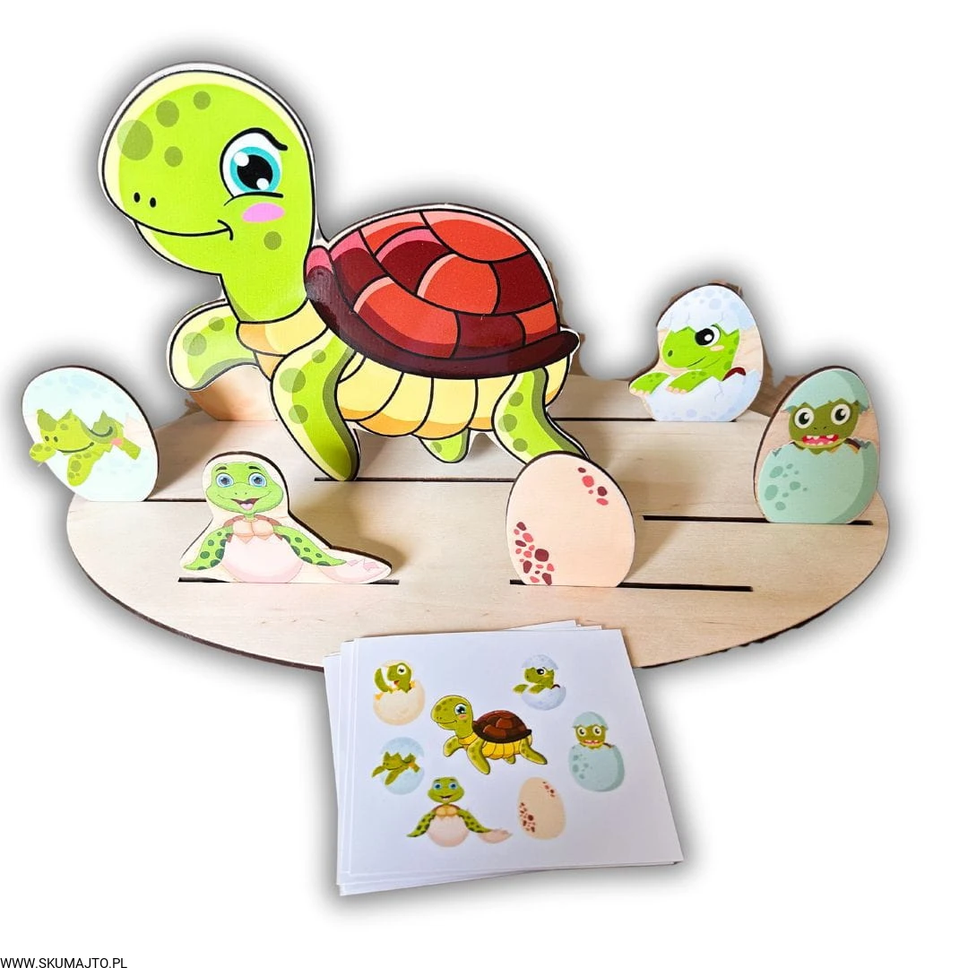 Edukacyjna Zabawka: Zadaniem dziecka jest ułożenie małych żółwików wykluwających się z jajek wokół dorosłego żółwia, który znajduje się w swoim wykopanym w piasku gnieździe. Dziecko korzysta z kart do odwzorowywania, co pozwala mu na ćwiczenie umiejętności analitycznych, logicznego myślenia oraz rozwija wyobraźnię i zmysł przestrzenny.