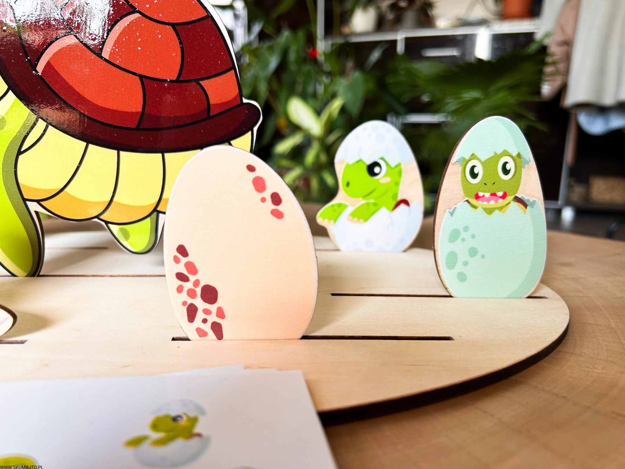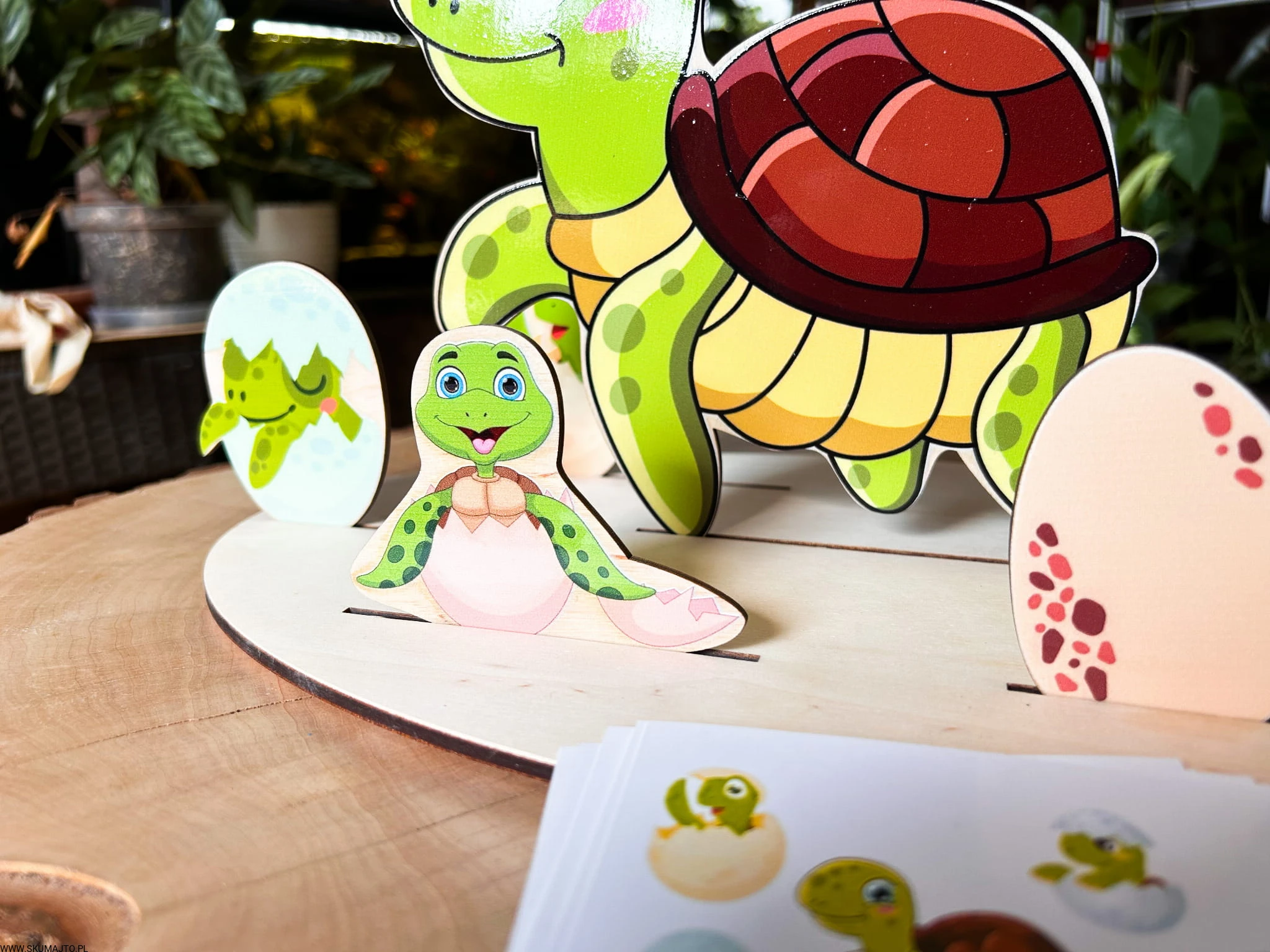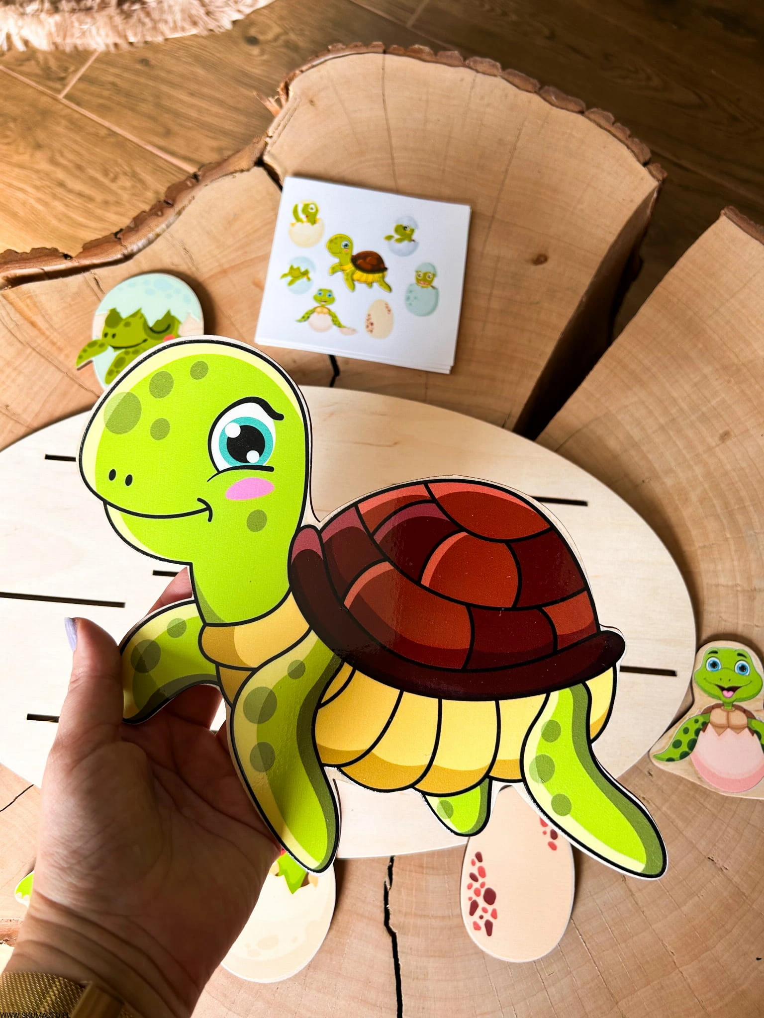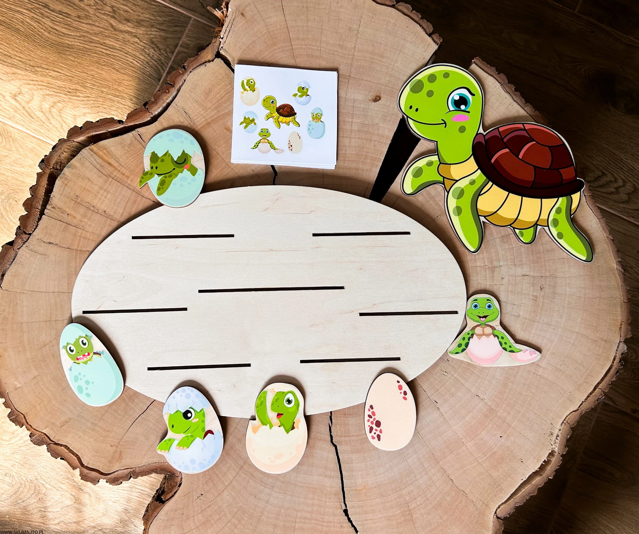 - 6 małych żółwików w jajach, które dziecko musi ułożyć według wzorów na kartach