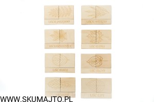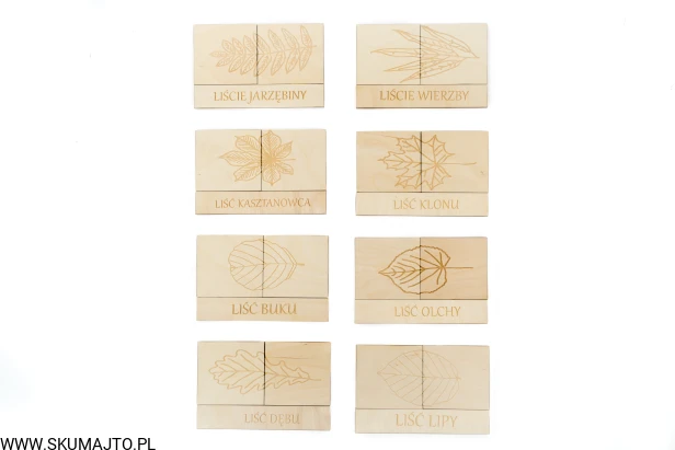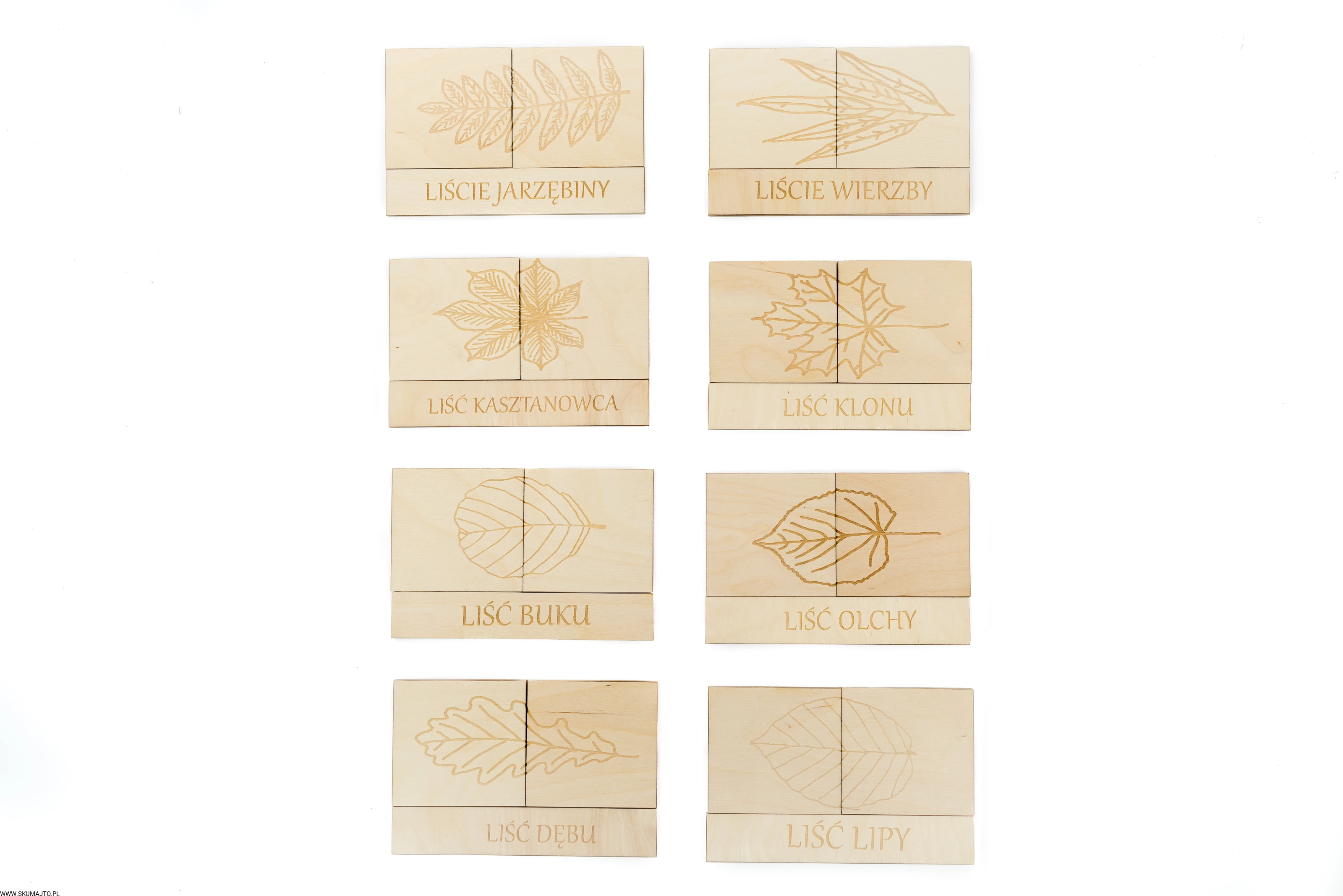 - 16 Elementów Liści: Które po połączeniu tworzą 8 różnych liści poszczególnych gatunków drzew (wymiary po złożeniu: 16,5x7,5cm).