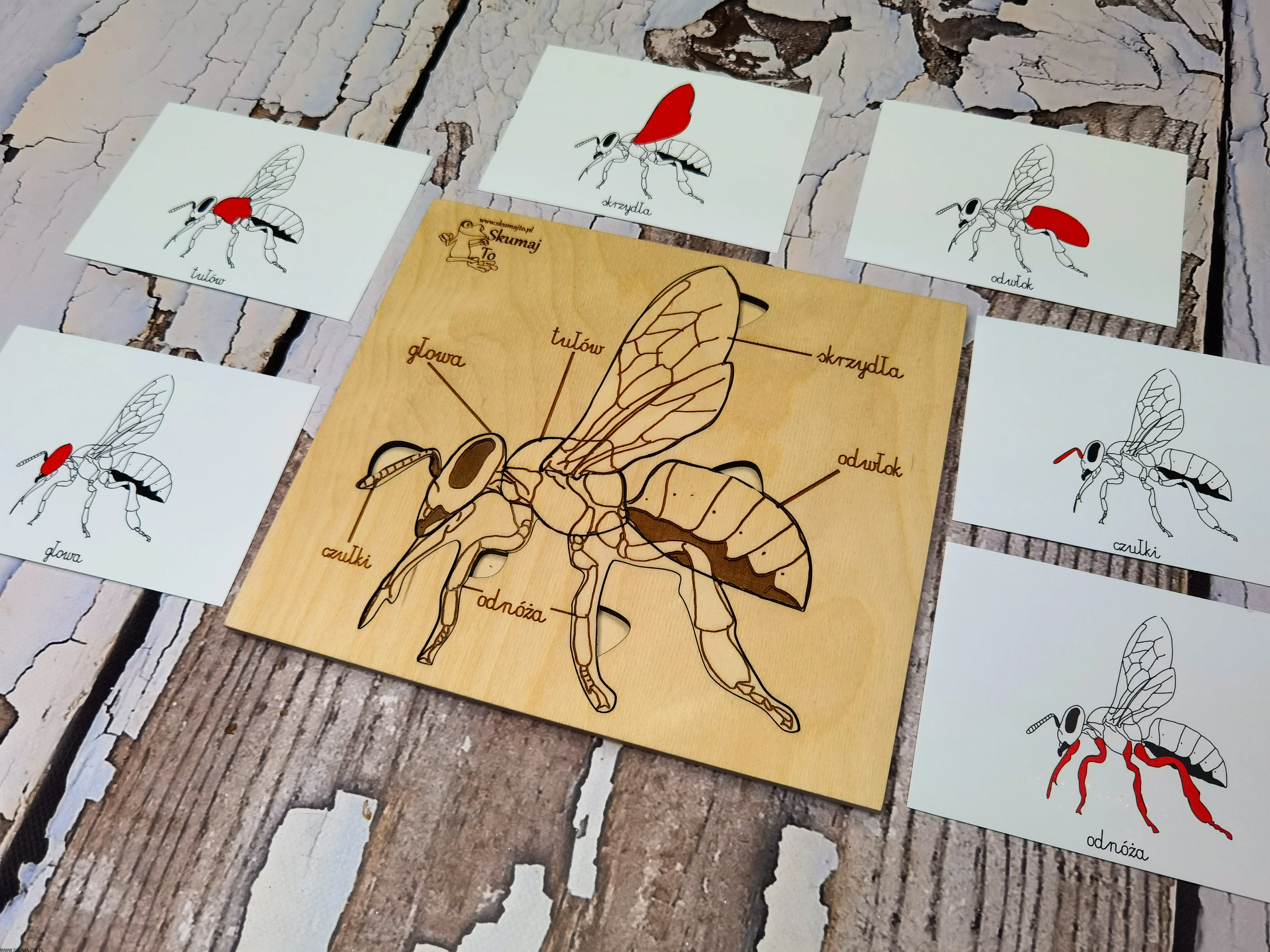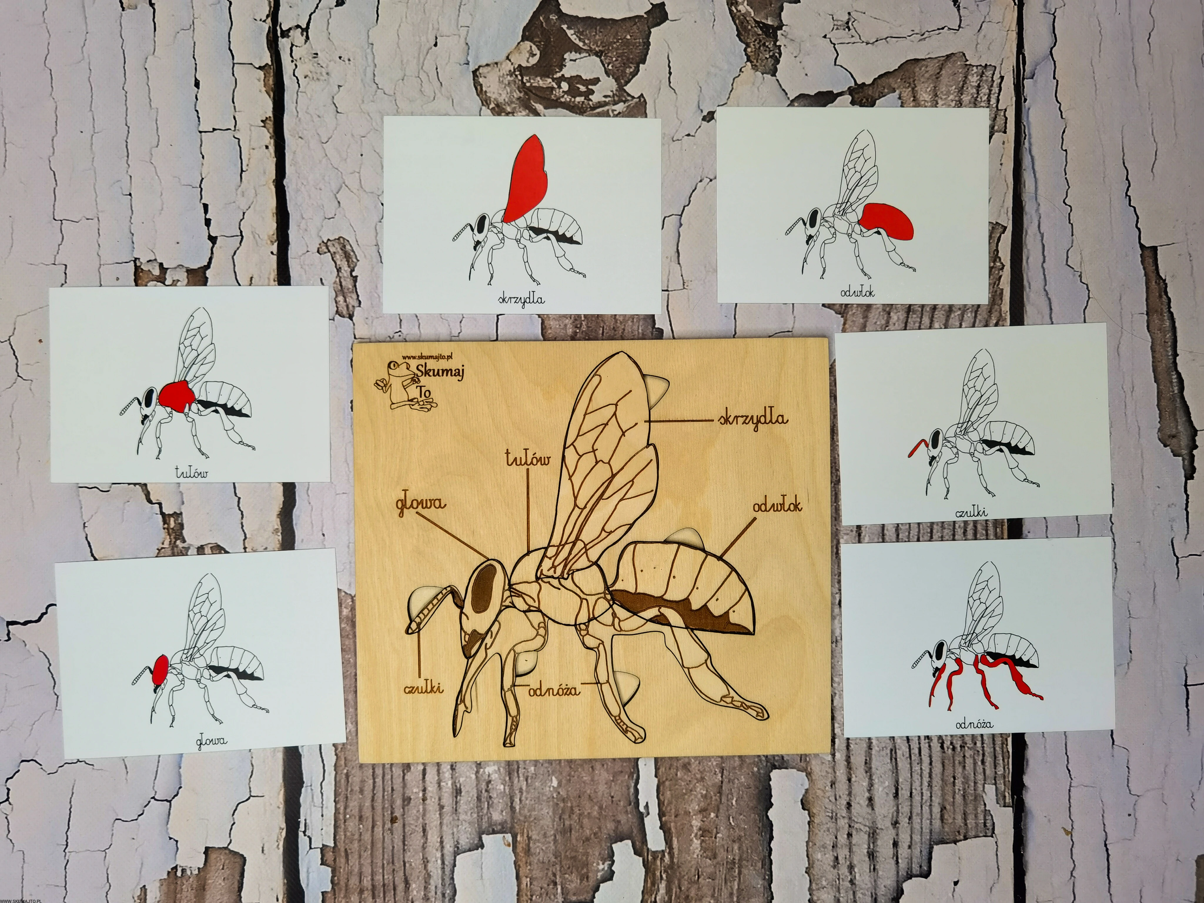 - Karty z nazwami poszczególnych części ciała pszczoły.