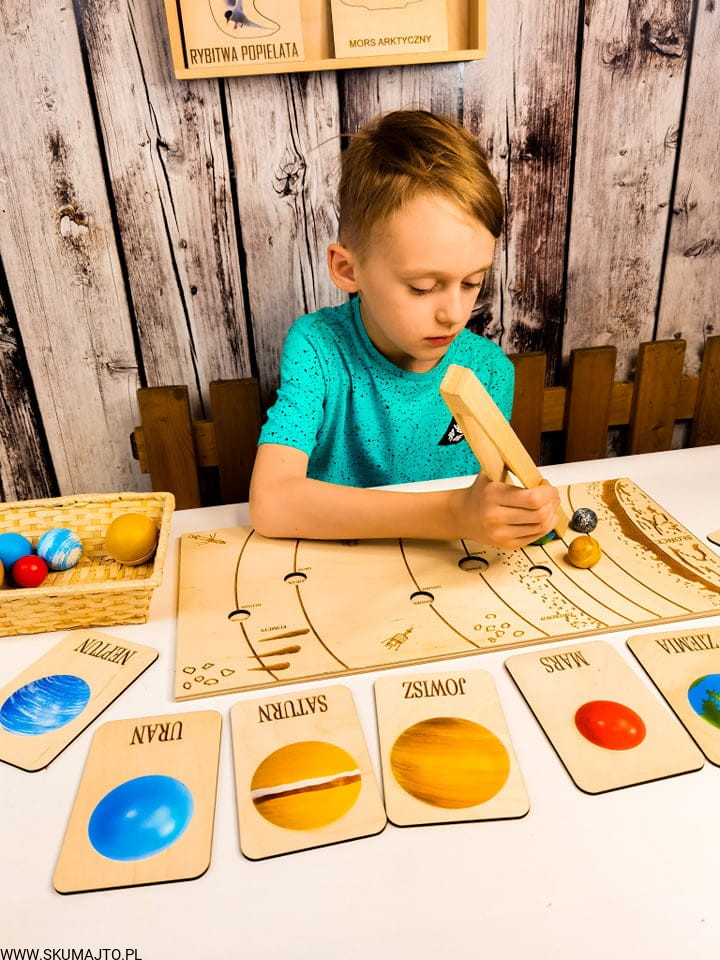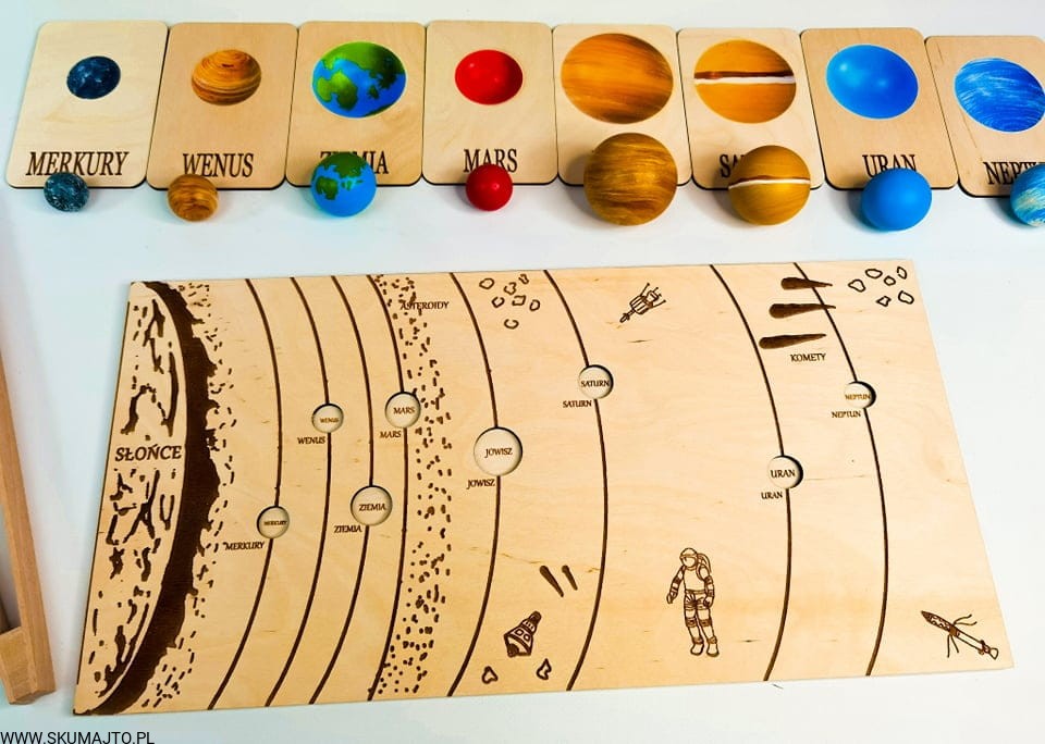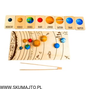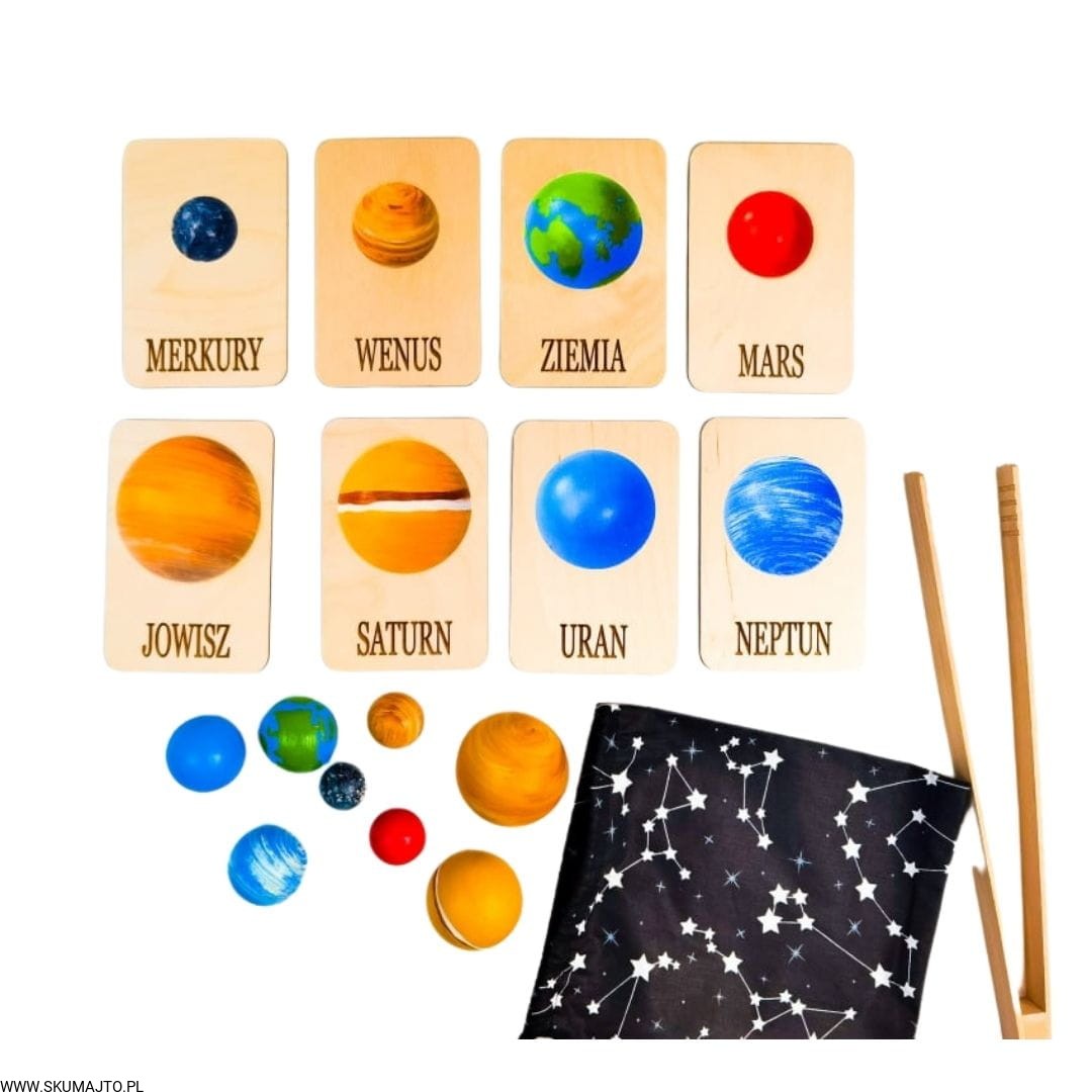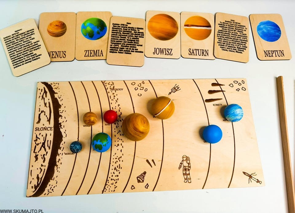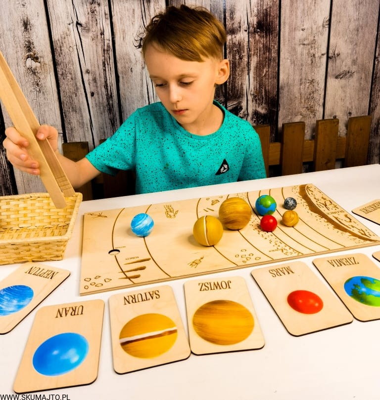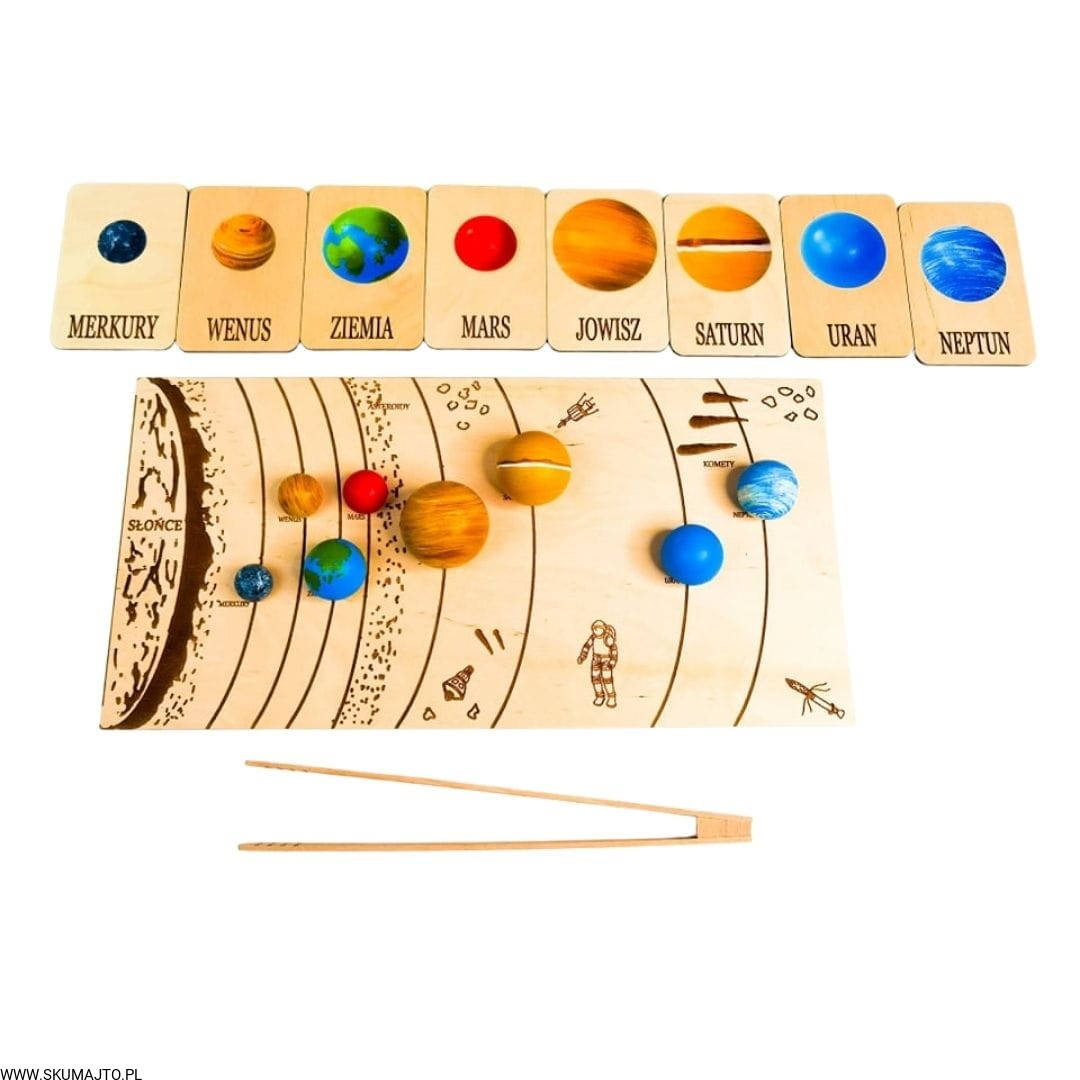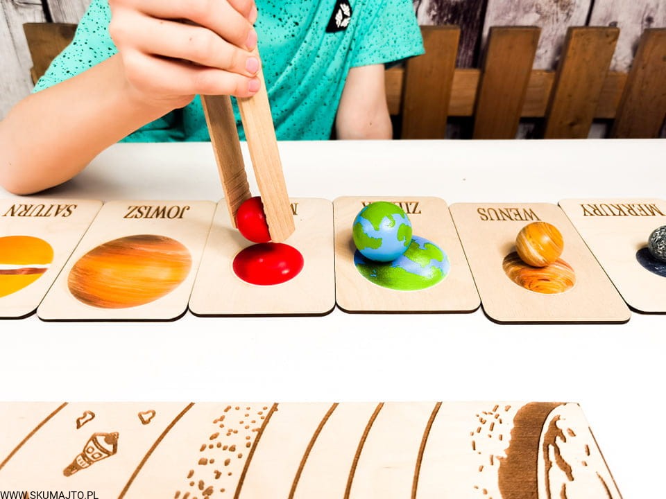Układ słoneczny według naszego projektu ma za zadanie przybliżyć dziecku wygląd, wielkość i kolejność planet. Dzięki temu, że są ręcznie malowane na bukowym drewnie dziecko może również poczuć ich ciężar- może ich dotknąć! Do zestawu dołączone są szczypce dzięki, którym dziecko przenosi poszczególne planety i układa je w odpowiednim miejscu- ale to nie koniec! Szczypce mają za zadanie wspierać małą motorykę dziecka tak ważną we wczesnym rozwoju dziecka. Dołączone karty z nazwami i zdjęciami planet wspierają koordynację ręka-oko kiedy dziecko musi rozpoznać planetę i ułożyć ją w odpowiedniej kolejności. Karty nadrukowane są na sklejce co sprawia, że nie zniszczą się po kilkukrotnym użyciu. Dodatkowo każda tabliczka ma na odwrocie opis każdej planety.