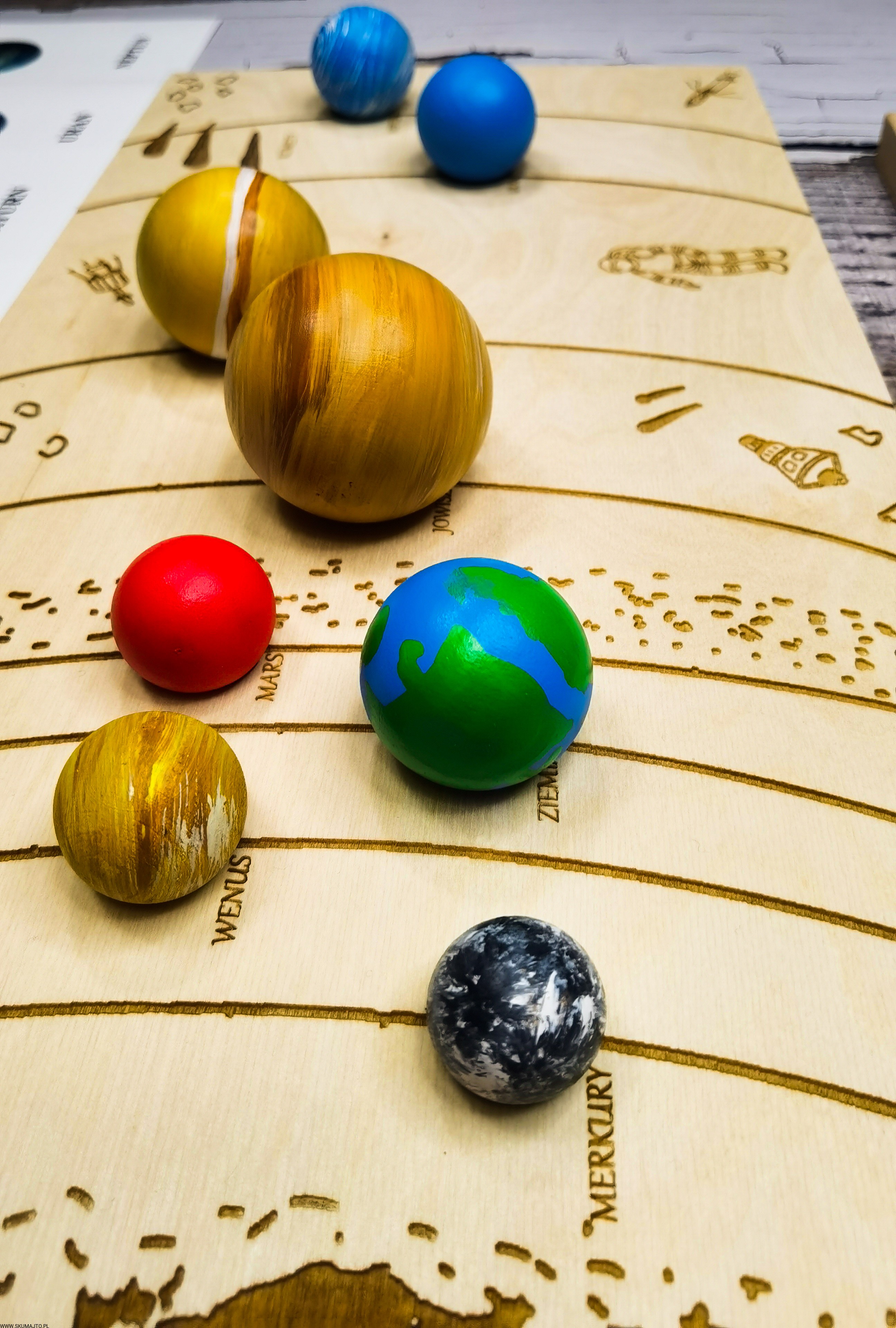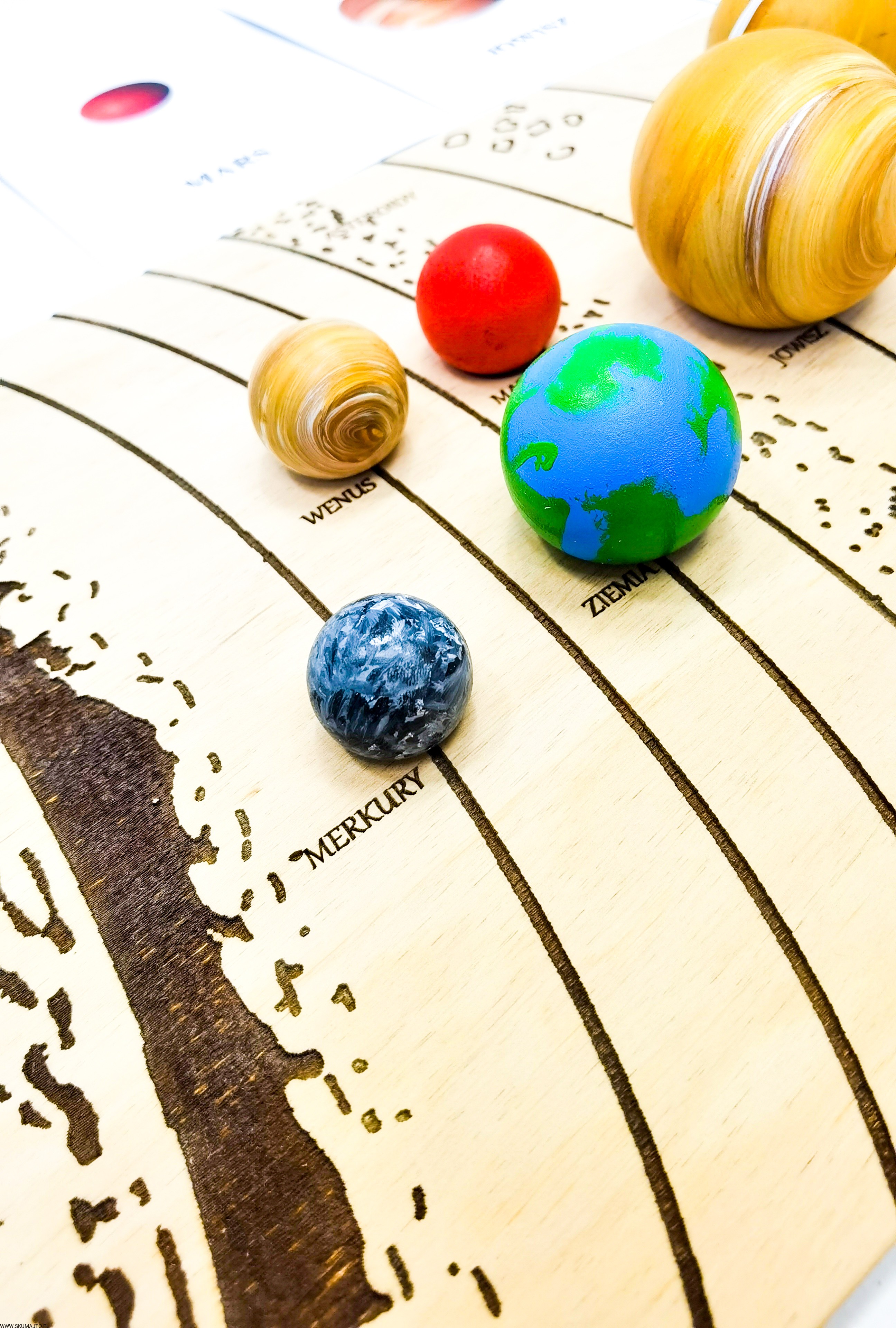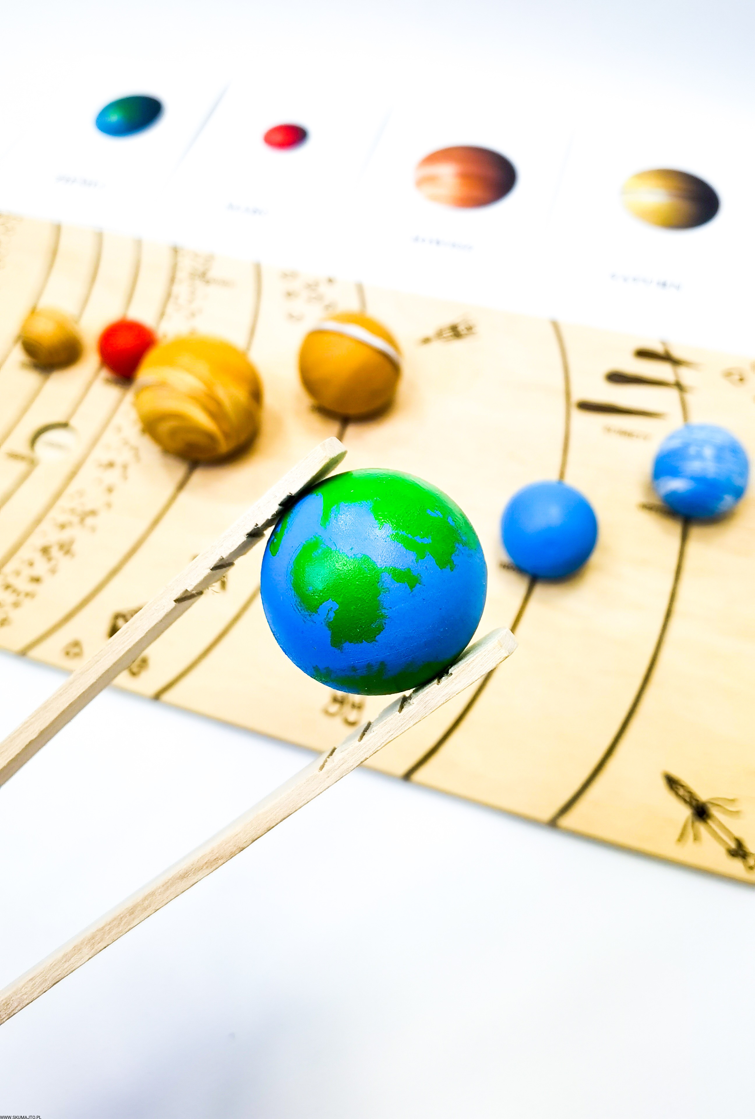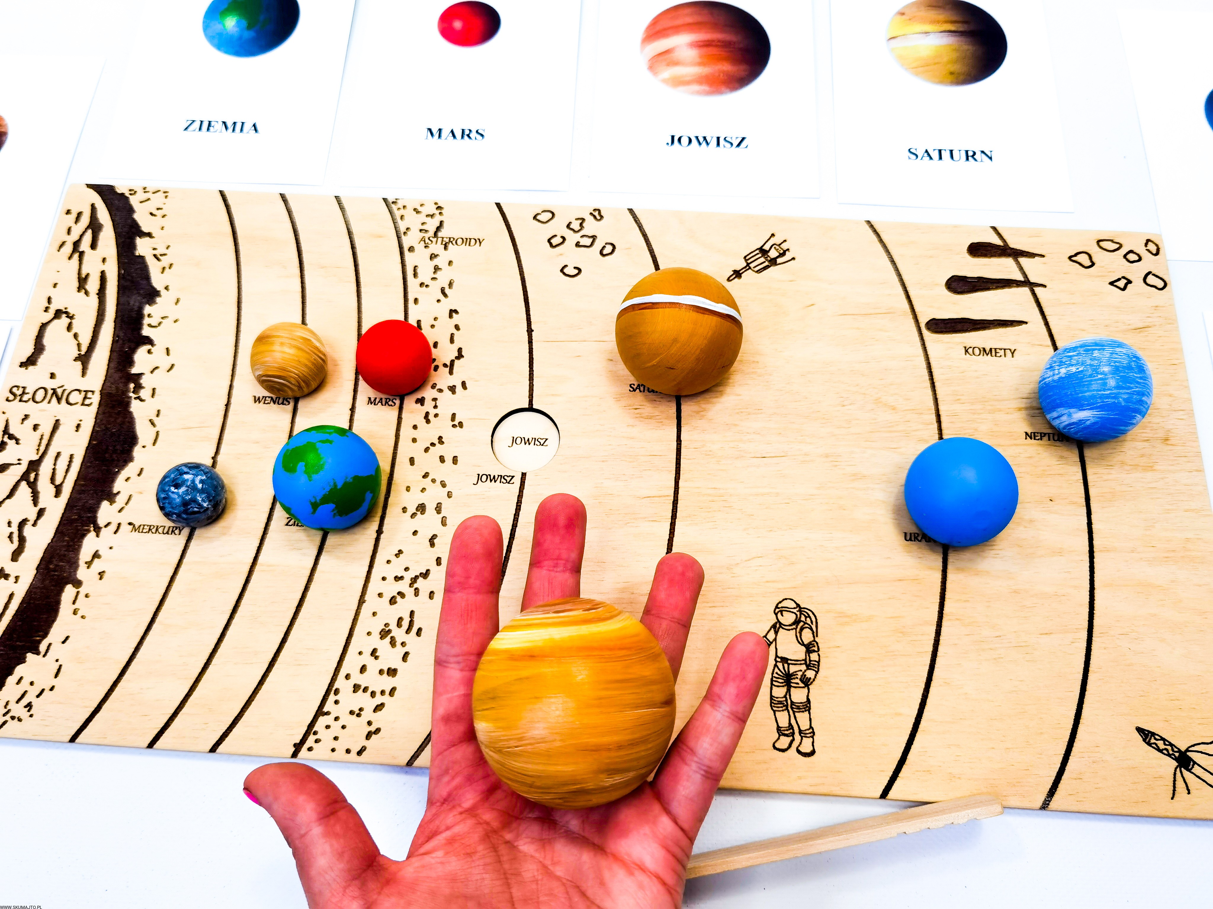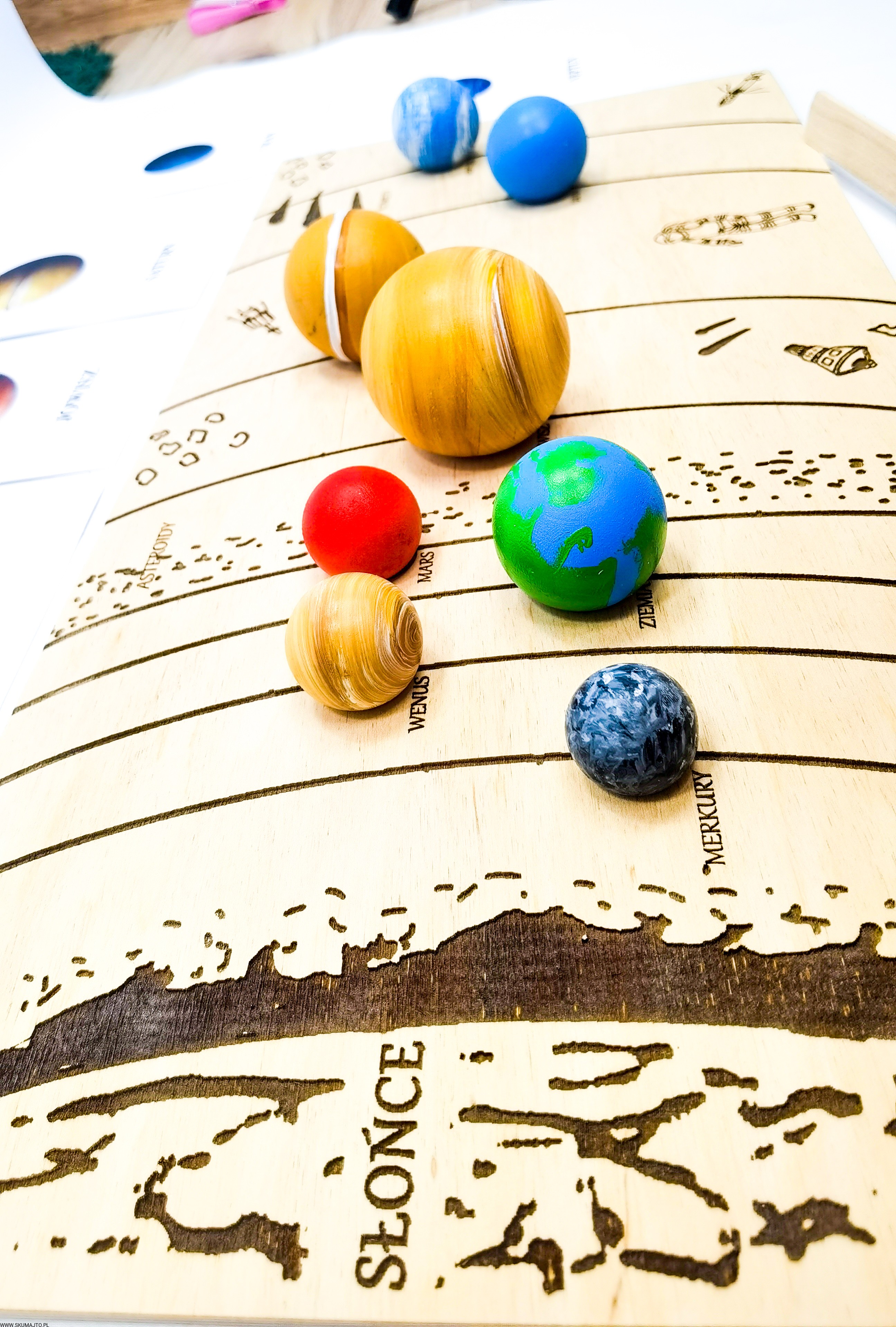 Układ słoneczny według naszego projektu ma za zadanie przybliżyć dziecku wygląd, wielkość i kolejność planet. Dzięki temu, że są ręcznie malowane na bukowym drewnie dziecko może również poczuć ich ciężar- może ich dotknąć! Do zestawu dołączone są szczypce dzięki, którym dziecko przenosi poszczególne planety i układa je w odpowiednim miejscu- ale to nie koniec! Szczypce mają za zadanie wspierać małą motorykę dziecka tak ważną we wczesnym rozwoju dziecka. Dołączone karty z nazwami i zdjęciami planet wspierają koordynację ręka-oko kiedy dziecko musi rozpoznać planetę i ułożyć ją w odpowiedniej kolejności. Karty nadrukowane są na sklejce co sprawia, że nie zniszczą się po kilkukrotnym użyciu. Dodatkowo każda tabliczka ma na odwrocie opis każdej planety.
