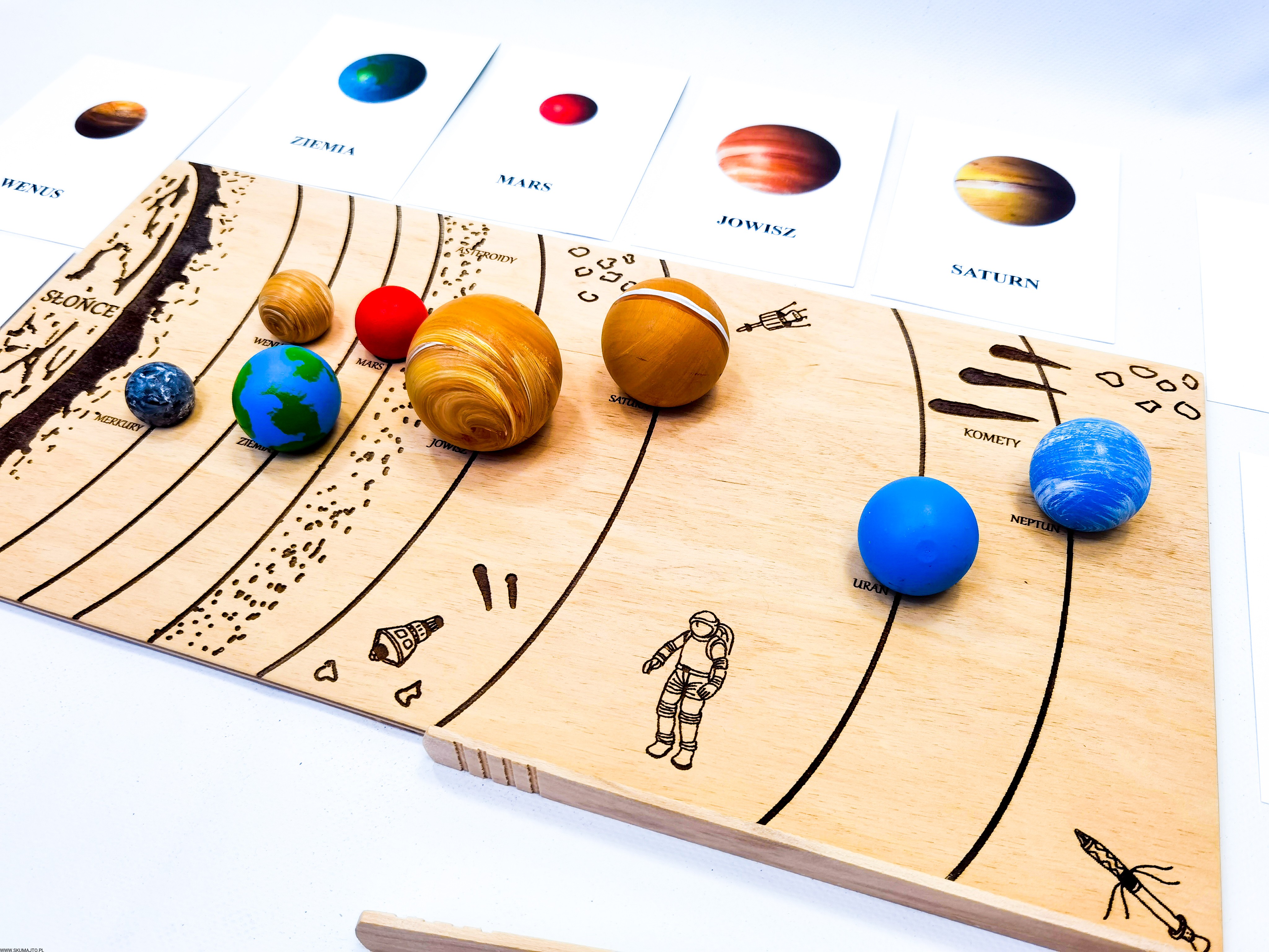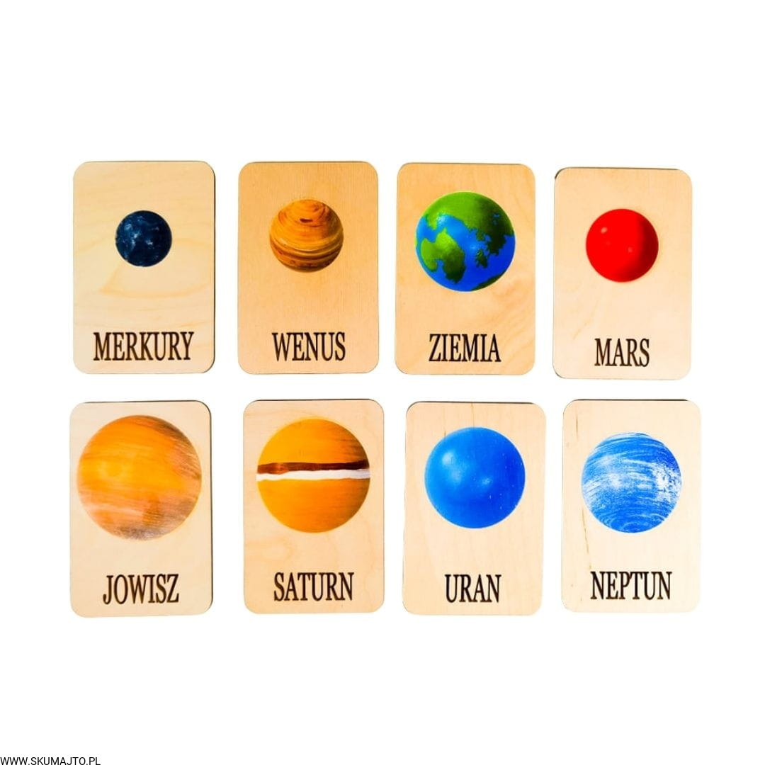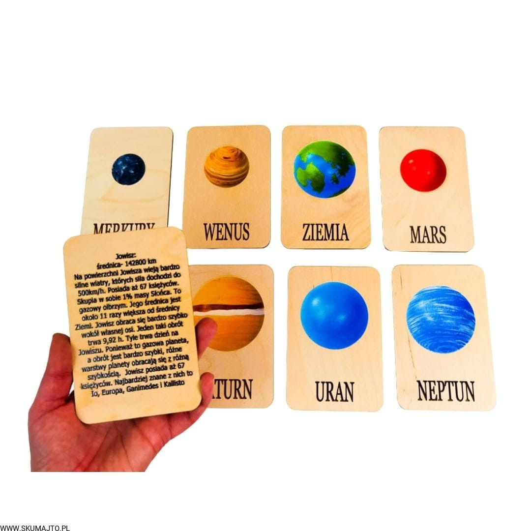 -8 drewnianych kart z nazwą planety, zdjęciem i opisem na odwrocie