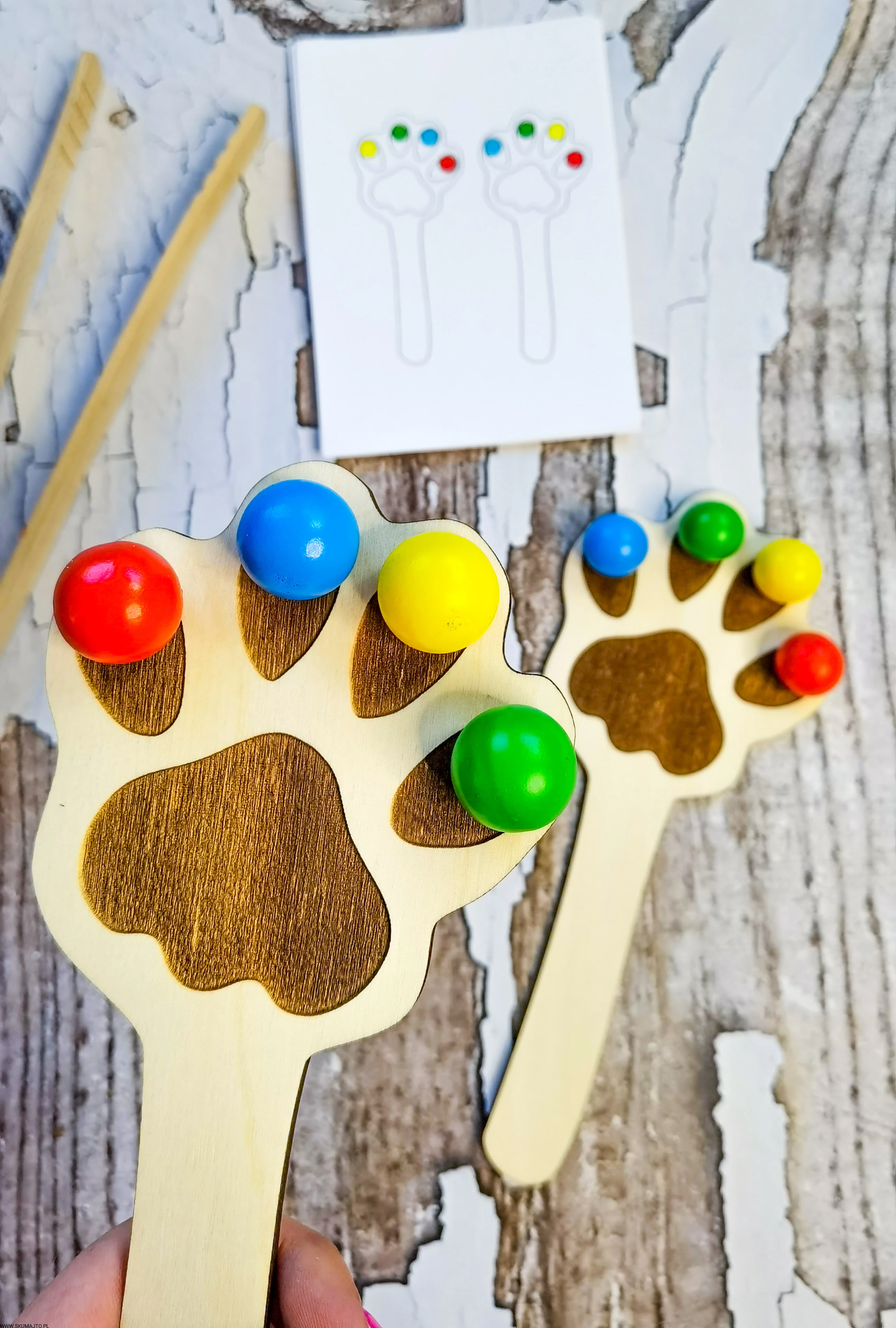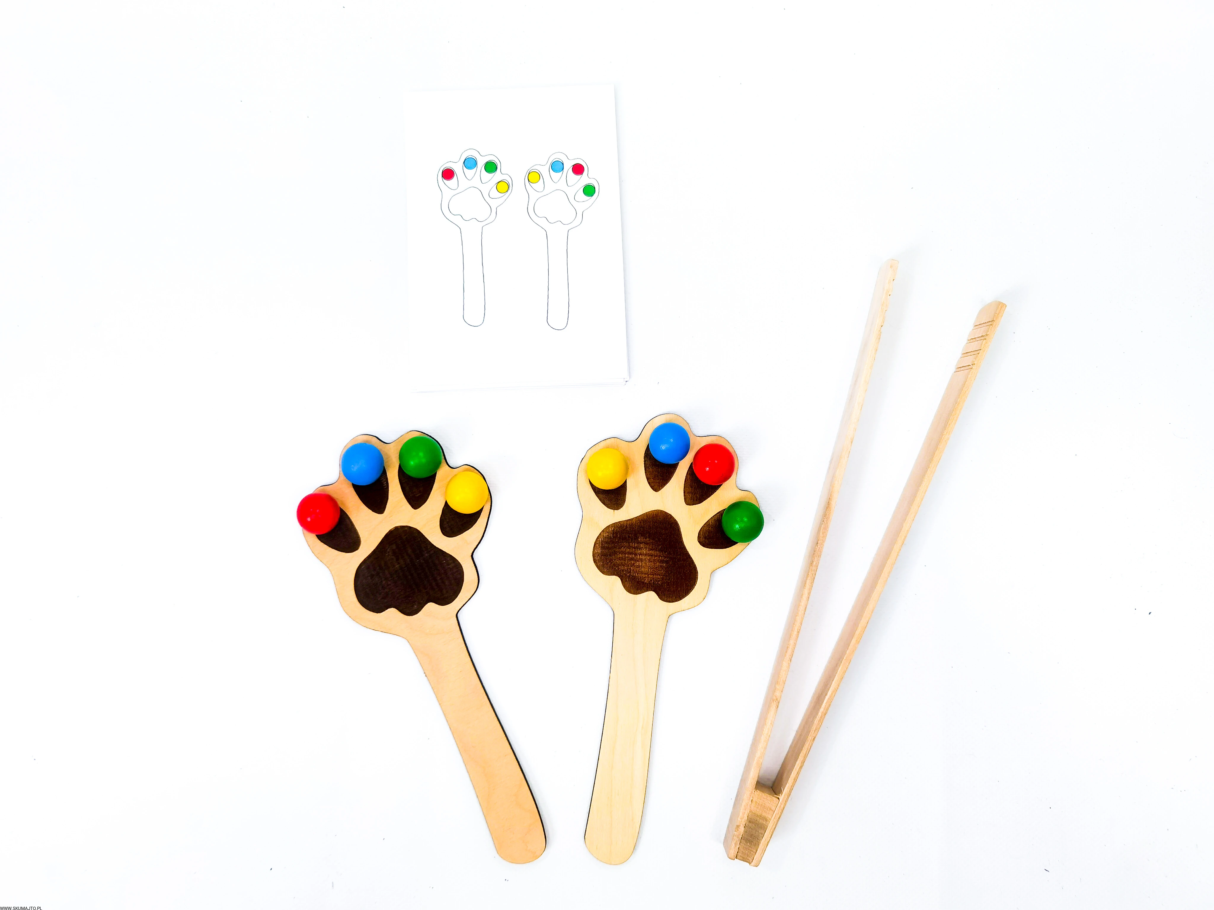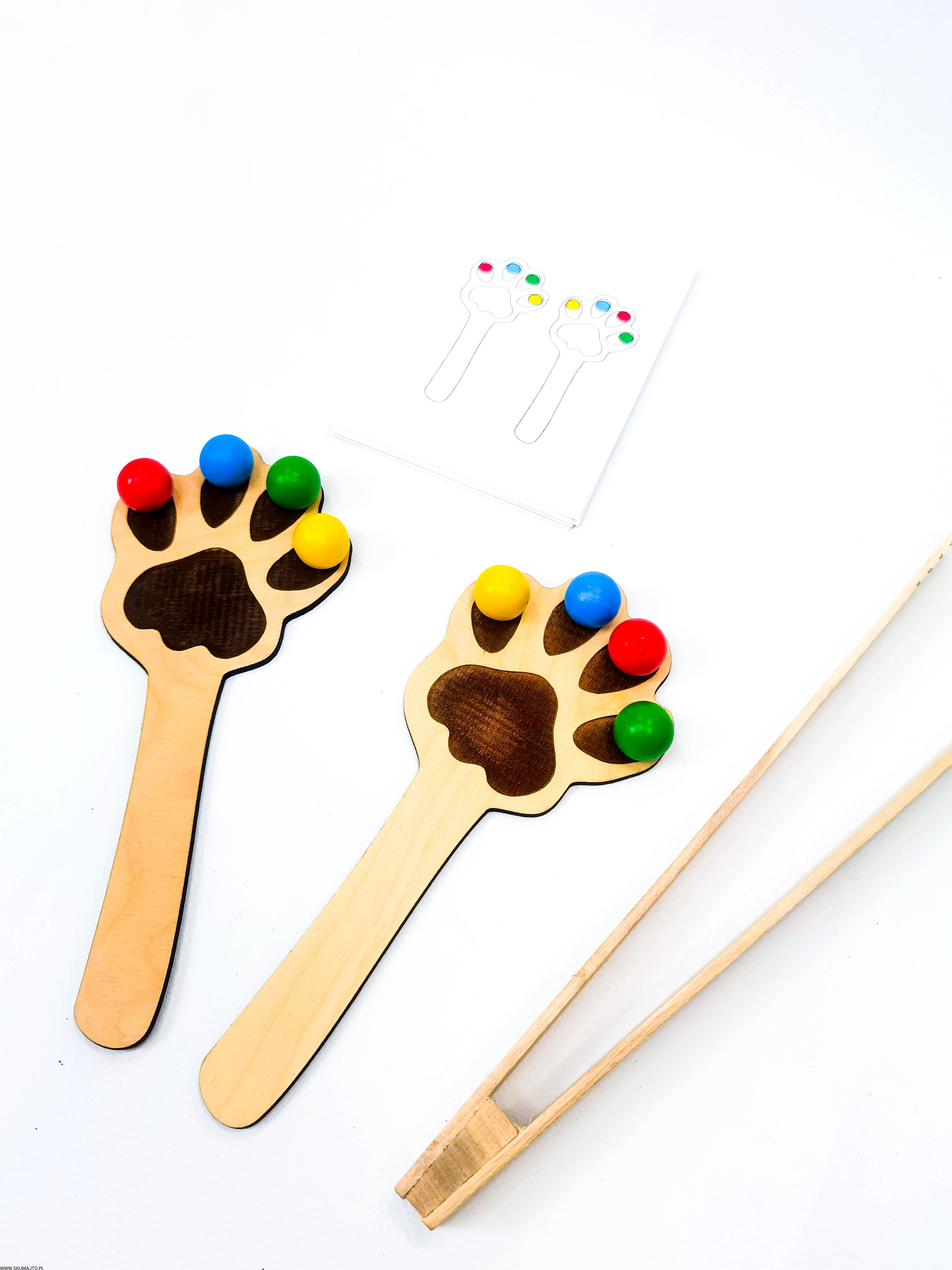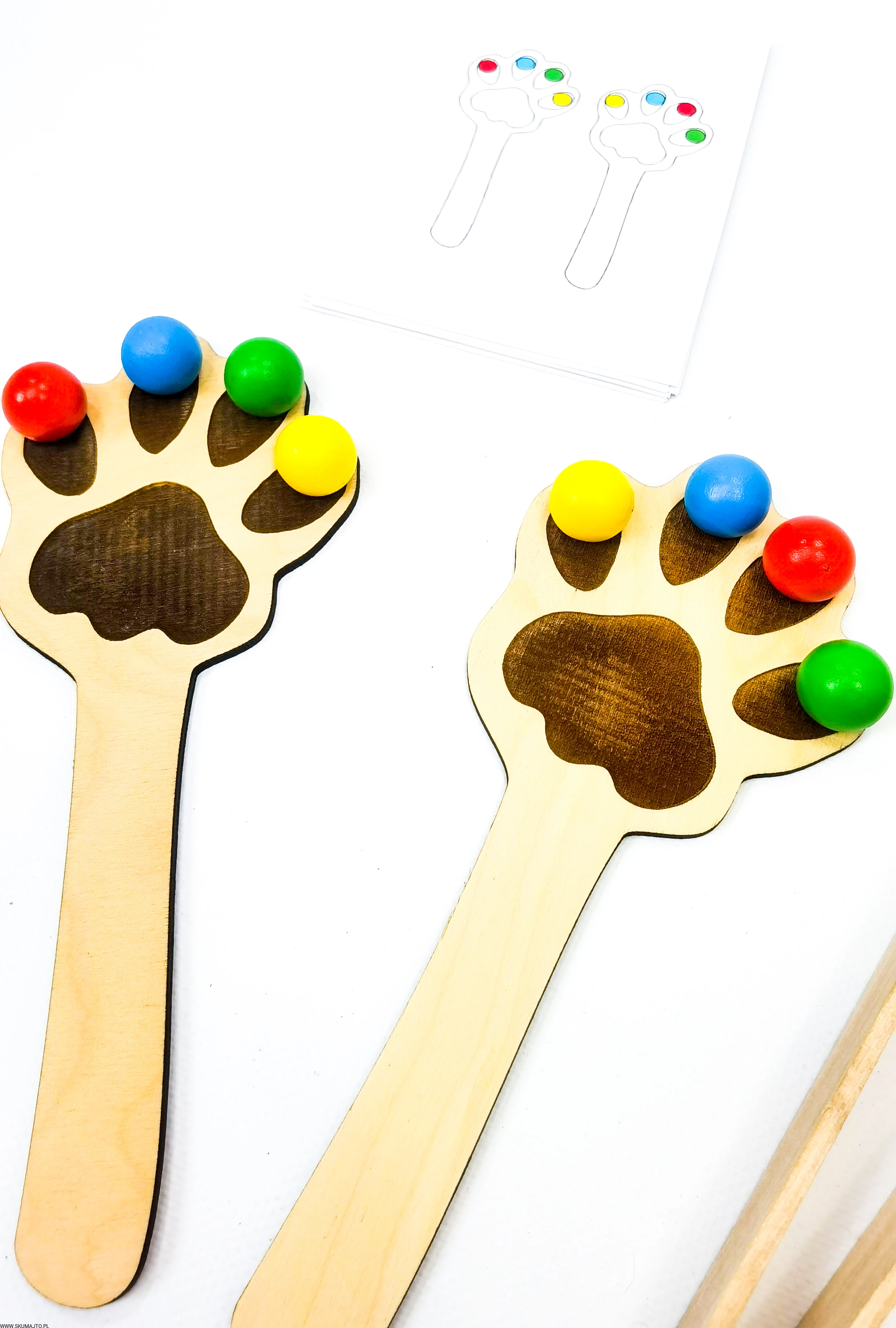 - Układanie Kulek: Dziecko układa kolorowe kuleczki na łapkach zgodnie z wzorami z dołączonych kart pracy.