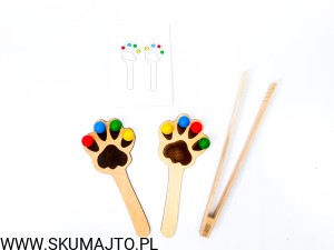 Łapki kota, kolorowe kulki, motoryka, szczypce, odwzorowywanie